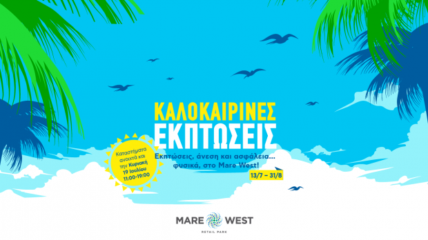 (Κόρινθος, 9 Ιουλίου 2020): Το καλοκαίρι είναι εδώ και ενώ η διάθεση ανεβαίνει, οι τιμές πέφτουν με τις εκπτώσεις των καταστημάτων του Mare West. Βρείτε όλα τα αγαπημένα σας brand στις καλύτερες τιμές της αγοράς, και απολαύστε τη βόλτα σας με ξεγνοιασιά και ασφάλεια, τηρώντας αβίαστα τις αποστάσεις ασφαλείας, στο αναβαθμισμένο και άνετο περιβάλλον του εμπορικού πάρκου.