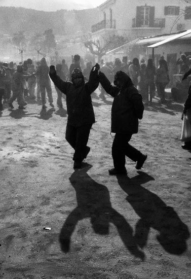 Όλα έτοιµα για επιβίβαση στα σκάφη και εµείς, αγχωµένοι πίσω απ’ τη στολή, ακολουθούµε κατά πόδας. Οι ντόπιοι, απελευθερώνοντας τα πρωτόγονα ένστικτά τους, σείουν τις καρότσες µε τις κουδούνες σε διονυσιακό ρυθµό, προκαλώντας τέτοιο σαµατά που θαρρείς πως θέλουν να ξυπνήσουν τους θεούς εκεί στους ∆ελφούς και ευφραίνοντας την καρδιά τους να υποσχεθούν µια µάχη δίχως οίκτο, εκλιπαρώντας την εύνοιά τους.