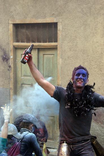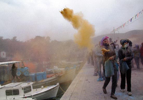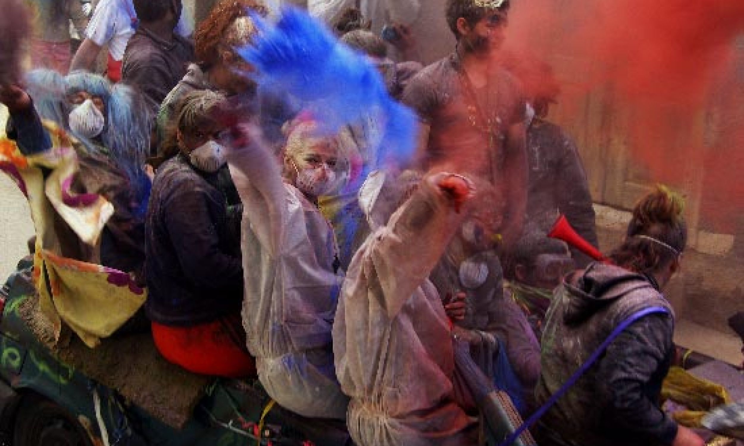 Πώς να περιγράψω το χρονικό ενός πολύχρωµου πολέµου; Μοβ, κόκκινο, µπλε, κίτρινο, πράσινο, ώχρα και φυσικά λευκό εκτινάσσονται µανιωδώς µπροστά µου, σχηµατίζοντας ουράνια τόξα που ακροβατούν από µπαλκόνι σε µπαλκόνι. Η ατµόσφαιρα αποπνικτική καθώς κατεβαίνουµε το µικρό δροµάκι. Ένα σάλτο στο παράπλευρο στενό για µια µικρή ανάσα και σαν να ξεγλιστράς από εικονογραφηµένη σελίδα του Τριβιζά. Μια νεραϊδένια φιγούρα ξέρει πόσο πολύ λείπει το µπλε απ’ τη ζωή µας. Αλύπητος στόχος η φωτογραφική µηχανή και… είµαστε ευγνώµονες. Μέσα στη φασαρία της κόρνας και το πυκνό νέφος, ασώµατοι αστροναύτες αιωρούνται καθώς κατηφορίζουν στο λιµάνι για την τελική µάχη. Τα πράγµατα αγριεύουν.