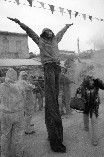 Μεσηµεράκι και πριν ξεκινήσει η οριστική κάθοδος, ένα γιορτινό πρελούδιο ξεκινά. Λίγο αλευράκι για ζέσταµα πετάγεται εκατέρωθεν. Κλείνουν και τα τελευταία παντζούρια ενώ από τις γρίλιες βρίσκουν ευκαιρία να το σκάσουν µυρωδικά συννεφάκια από κοκκινιστό χταποδάκι, καθώς γυάλινα µατάκια αγωνιωδώς επικεντρώνονται στο δροµάκι και παίζουν δεξιά κι αριστερά κρυφοχαρούµενα. Με τη µηχανή στο χέρι, αυτοσχέδια προφυλαγµένη, απολαµβάνω τις τελευταίες στιγµές ηρεµίας, παραδοµένη σε αυτό το πάντρεµα της µουντής ώχρας µε τη γλυκιά µελαγχολία µιας άνοιξης που φέτος αργεί…