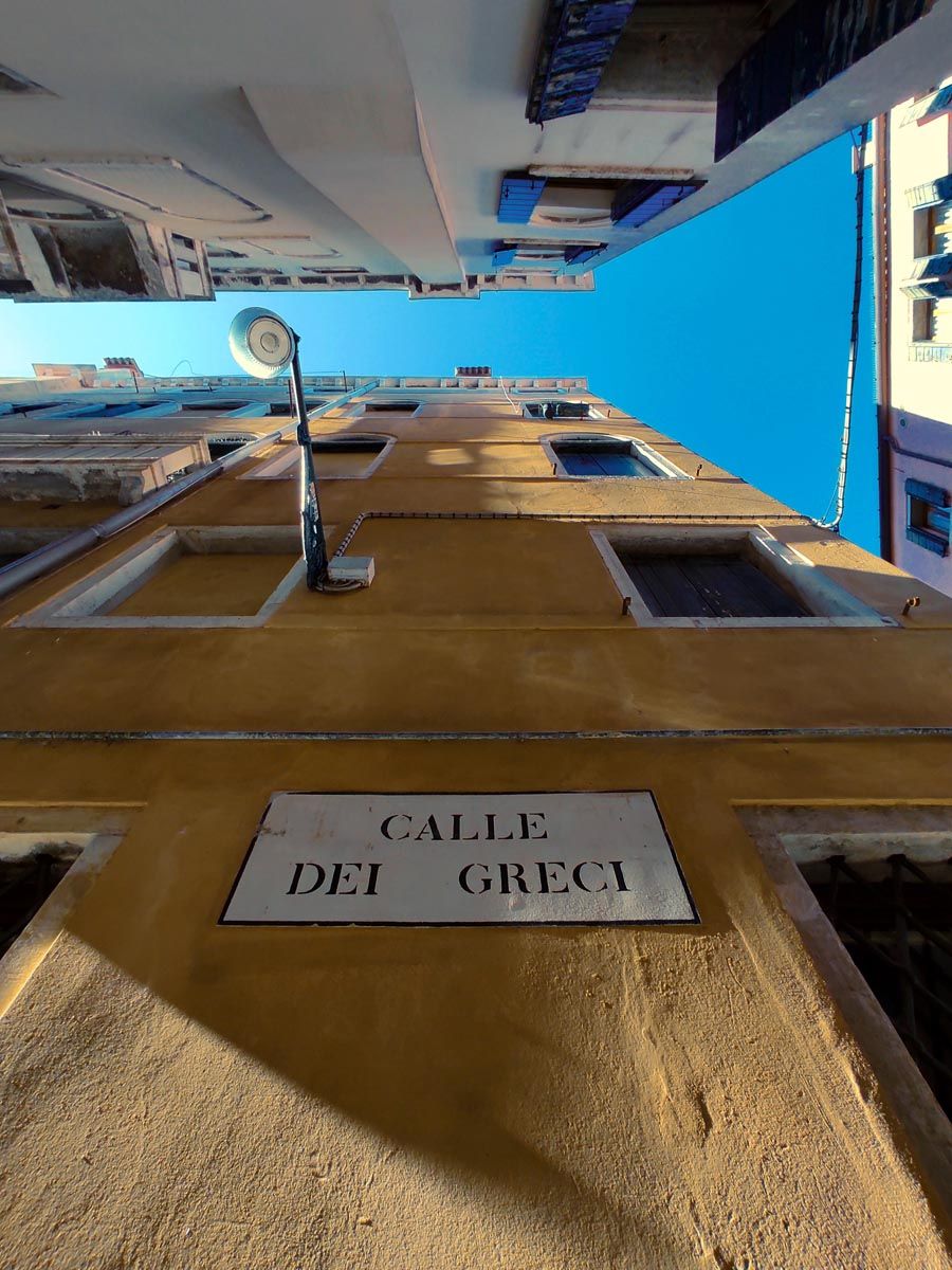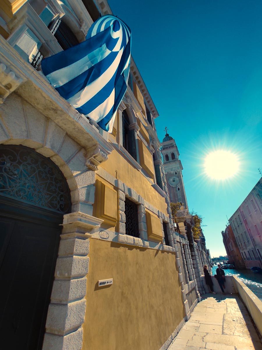 Εντυπωσιάζομαι με τη Γέφυρα των Στεναγμών, μαγεύομαι στην πολύβουη αγορά του Ριάλτο και φτάνω επιτέλους στην πλατεία του Αγίου Μάρκου. Εκεί φυσικά την παράσταση κλέβει η Βασιλική του Αγίου Μάρκου και το τεράστιο κωδωνοστάσιό της. Πίνω γρήγορα έναν καφέ latte στο ιστορικό καφέ Florian, ανάμεσα σε τοιχογραφίες του Μιχαήλ Άγγελου και συνεχίζω οδεύοντας προς την ανοιχτή θάλασσα. Μπροστά μου ξεχωρίζει το παλάτι των Δόγηδων. Φαντάζομαι τα κωπήλατα πλοία να φτάνουν εδώ και να αποβιβάζουν τον πλούτο όλου του κόσμου, την εποχή που η Βενετία ήταν θαλασσοκράτειρα. Μία πολυπολιτισμική κοινότητα, πλημμυρισμένη από τη φλόγα των εμπόρων και των πραματευτάδων. Αναλογίζομαι πως εδώ είναι το τέρμα της εξερεύνησής μου και ετοιμάζομαι να πάρω τον στενάχωρο δρόμο του γυρισμού. Μα κάτι σαν να με τραβάει να συνεχίσω. Λίγα μέτρα πιο πέρα, σε ένα από τα δεκάδες κανάλια γράφει: «Ponte dei Greci». Με τα μέτρια ιταλικά μου καταλαβαίνω πως μιλάει για τη χώρα μου, «η γέφυρα των Ελλήνων» σκέφτομαι! Λίγο πιο κάτω, βλέπω σε μία πινακίδα στον τοίχο, χαραγμένο ένα ακόμα στοιχείο: «Rio dei Greci», δηλαδή «το κανάλι των Ελλήνων». Αναρωτιέμαι τον λόγο που έχουν αφιερώσει μία γέφυρα και ένα κανάλι σε εμάς, τους «Γραικούς». Η απορία μου λύνεται, καθώς από το επόμενο στενό ξεπροβάλλει η γαλανόλευκη! Πλησιάζω και διαβάζω πάνω στην πόρτα του κτιρίου: «Μουσείο Βυζαντινών και Μεταβυζαντινών εικόνων».