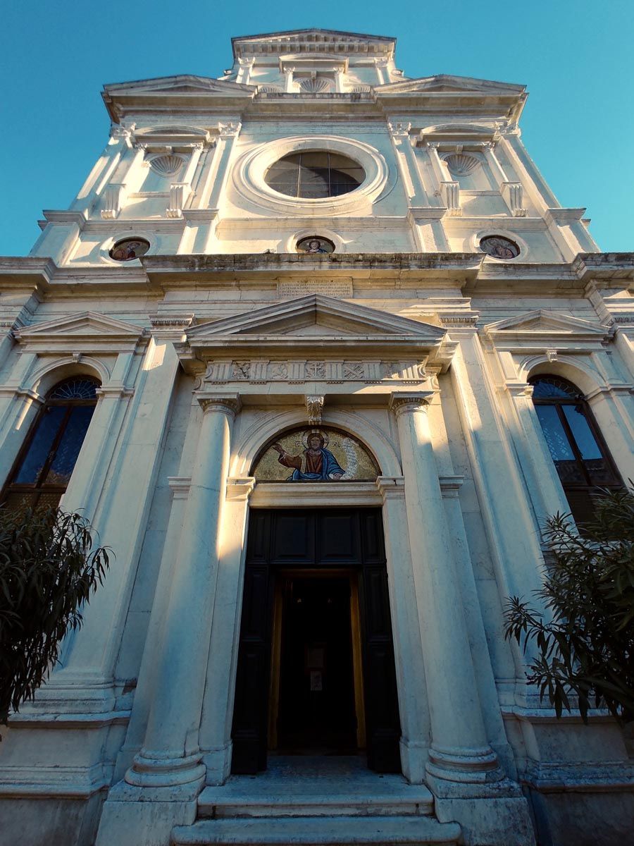 Βγαίνοντας εντυπωσιασμένος από το μουσείο, την προσοχή μου τραβά ένα τεράστιο καμπαναριό που γέρνει. Τελικά δεν έχει στατικό πρόβλημα μόνο ο Πύργος της Πίζας στη γειτονική Φλωρεντία! Δίπλα από το μουσείο, βρίσκεται ο ορθόδοξος ναός του Αγίου Γεωργίου ή αλλιώς San Giorgio dei Greci. Ο ναός αποτέλεσε το κέντρο της Ελληνικής κοινότητας στην πόλη και σήμερα αποτελεί την έδρα της Ιεράς Μητρόπολης Ιταλίας και Εξαρχίας Νοτίου Ευρώπης. Για να χτιστεί, όμως, αυτός ο περίλαμπρος ναός, πέρασε σχεδόν ένας αιώνας αδιάκοπων προσπαθειών. Μετά την άλωση της Κωνσταντινούπολης, στα τέλη του 15ου αιώνα, η ελληνική παροικία αριθμούσε πληθυσμό περίπου 5.000 ατόμων! Ένα από τα κύρια προβλήματα που αντιμετώπισαν ήταν η ελεύθερη άσκηση των θρησκευτικών τους καθηκόντων. Ο Δόγης είχε επιτρέψει να λειτουργούν σε έναν καθολικό ναό, τον Άγιο Βλάσιο. Οι Έλληνες ήθελαν τον δικό τους ορθόδοξο ναό. Στις αρχές του 16ου αιώνα, οι Έλληνες στρατιώτες της Βενετίας «Stradioti» (!) παρουσίασαν το αίτημα στον Δόγη. Την οριστική άδεια την εξασφάλισαν το 1521. Η ανέγερση του ναού του Αγίου Γεωργίου ξεκίνησε το 1539 και περατώθηκε 34 χρόνια αργότερα. Κοντοστέκομαι στην είσοδο του ναού με δέος. Ψηλά λαξευμένη επιγραφή αναφέρει: Χριστώ Σωτήρι/ και τω άγίω μάρτυρι Γεωργίω οι μέτοικοι / και οι άεί καταίροντες Ένετίαζε των ‘Ελλήνων / όπως έχοιεν κατά τα πάτρια τω θεώ θρησκενειν /εκ τών ενόντων φιλοτιμησάμενοι το ιερόν/ ανέβηκαν.