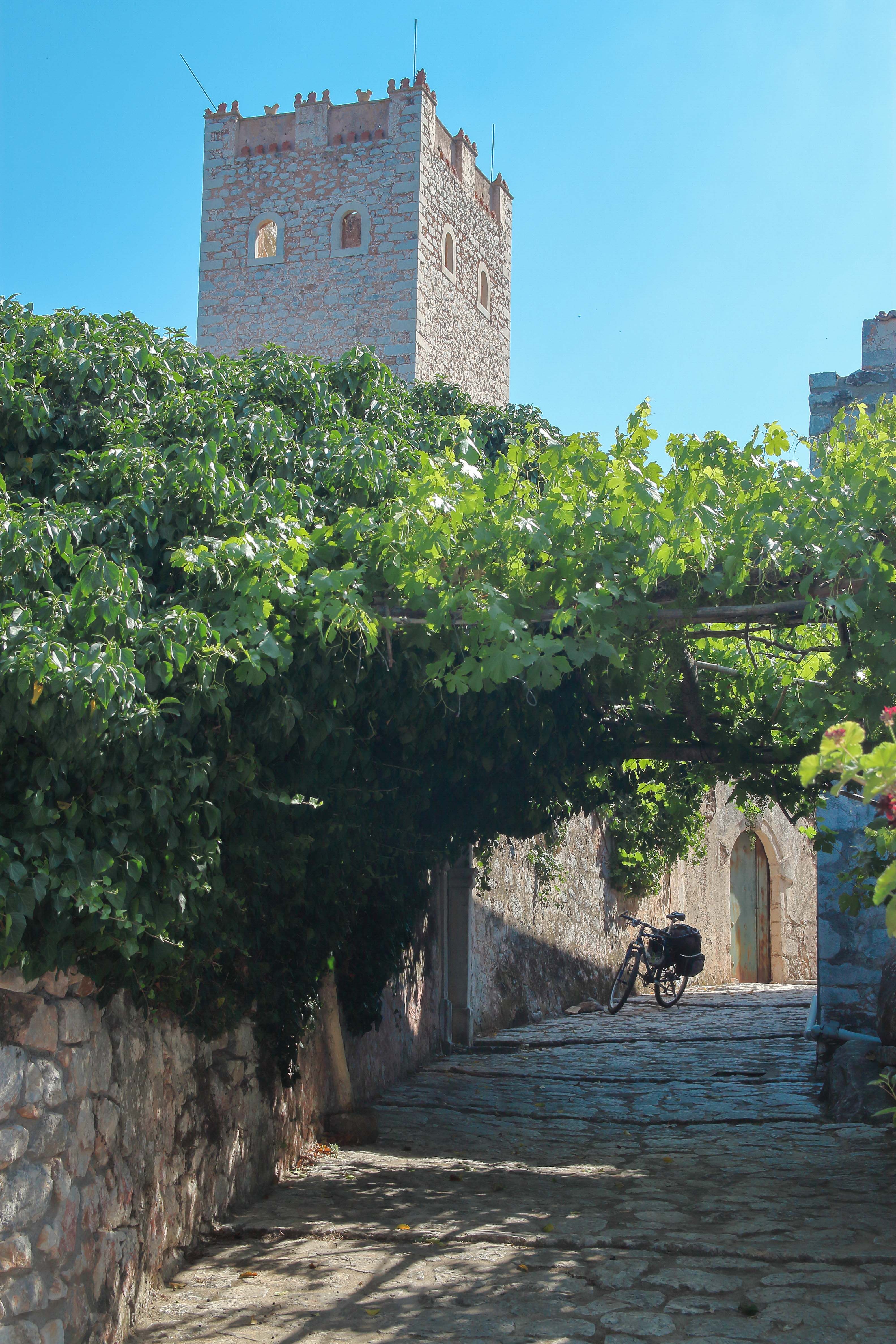 περνώ τον μισοερειπωμένο πύργο των Καλκαντήδων (1770).