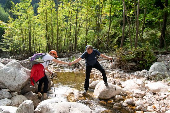 Άλλος τοποθετεί ειδικά παπούτσια, άλλος συνεχίζει με αυτά που φορούσε και οι πιο τολμηροί προχωρούν, πατώντας τα γυμνά πόδια τους στα κρύα γλιστερά βράχια του ποταμού. Σιγά σιγά το νερό φτάνει ίσαμε το γόνατο. Αν παραμείνεις ένα λεπτό παραπάνω, νιώθεις τα δάχτυλά σου να μουδιάζουν από τον παγωμένο Αγραφιώτη. Το να ισορροπείς, βαδίζοντας πάνω σε βράχια, βουτηγμένα στο ορμητικό νερό είναι τελικά μια πολύ δύσκολη διαδικασία. Πολλοί γλιστρούν και πέφτουν μα πάντα ένα χέρι από την ομάδα είναι εκεί, να τους συγκρατήσει. Κανείς μας δεν αποκτά μια μεγαλύτερη και πιο παγωμένη επαφή με το νερό, ευτυχώς! Η ομάδα ενωμένη προχωρά μία από τη δεξιά όχθη και μία από την αριστερή. Μπροστά μας ο ήλιος, οδηγός, παίζει κρυφτό με τις άκρες του φαραγγιού. Συναντάμε έναν μικρό καταρράκτη, περίπου τρία με τέσσερα μέτρα, που σχηματίζει μια μικρή λιμνούλα. Το νερό κρύσταλλο και πεντακάθαρο. Η υδάτινη πορεία μας τελειώνει, μόλις συναντήσουμε τη μεγάλη τσιμεντένια γέφυρα και το Σκυλόρεμα, τον κυριότερο τροφοδότη του Αγραφιώτη. Ο Παναγιώτης ανακοινώνει στάση για ξεκούραση και αλλαγή παπουτσιών και όλοι μας υποδεχόμαστε με ανακούφιση τα λόγια του. Στεγνές κάλτσες, ζεστά παπούτσια και βουρ στις σακούλες που έχουν ανοιχτεί. Σαλάμι, γραβιέρα, ζυμωτό ψωμί και τσίπουρο για όσους κρύωσαν. Καθώς μασουλάμε, συζητάμε για τη μέχρι τώρα εμπειρία μας, ενώ μαγευόμαστε από καλλιτεχνικούς λαξευμένους μαιάνδρους, που έχουν δημιουργηθεί στον απέναντι βράχο. Ξεκινάμε πάλι, ενδυναμωμένοι σωματικά αλλά και ψυχικά. Μετά από 5 λεπτά αφήνουμε το ποτάμι και πεζοπορούμε σε ένα πυκνό δάσος οξιάς. Είναι τόσο πυκνό, που σκοτάδι έχει σκεπάσει το σκαλιστό μονοπάτι. Εντυπωσιάζομαι από την τέχνη των παλιών μαστόρων, που στους απότομους γκρεμούς του φαραγγιού έχουν κατασκευάσει ένα σταθερό δρόμο για ανθρώπους και ζώα. Ένας από αυτούς ήταν ο Χρήστος Ζιώγας. Όπως μας διηγείται ο γιος του, τον δένανε με σχοινιά και τον κατέβαζαν στο ανάλογο ύψος, ώστε να τοποθετήσει εκρηκτικά και να σκαφτεί ο βράχος. Μαζί με άλλους ντόπιους εργάστηκαν σκληρά για τη διάνοιξη των επικίνδυνων μερών του μονοπατιού. Σε κάποια σημεία το μονοπάτι έχει υποχωρήσει και περνάμε με ένα μικρό άλμα, ένας ένας, με κομμένη την ανάσα. Τολμάω να κοιτάξω προς τα κάτω. Γκρεμός. Κάποιος πετάει μια πέτρα, για να ακούσουμε την πρόσκρουση στο νερό. Μάταια. Η σύμπνοια της ομάδας συμπαρασύρει κι αυτούς που λιγοψυχούν. Περνάμε όλοι με ασφάλεια και συνεχίζουμε την πορεία μας στη σμιλεμένη από τον άνθρωπο πλαγιά του φαραγγιού. Τώρα οι οξιές δίνουν τη θέση τους σε ένα παχύ ελατοδάσος. Είναι γεμάτο από μανιτάρια κάθε σχήματος, χρώματος και μεγέθους. Το έμπειρο μάτι του Παναγιώτη ξεχωρίζει τα βρώσιμα. Με γρήγορες χειρουργικές κινήσεις γεμίζει μια σακούλα μανιτάρια, που θα απολαύσουμε τηγανητά, το βράδυ, στον ξενώνα. Ύστερα από λίγη ώρα, φτάνουμε σε ένα ξέφωτο. Ένα πέτρινο προσκυνητάρι μας μαρτυρά, πως αν σηκώσουμε το βλέμμα μας απέναντι, μπορούμε να διακρίνουμε τη Μονή της Παναγίας της Στάνας. Η Αγία των Αγράφων μοιάζει σαν να αιωρείται πάνω από τους απότομους γρανιτένιους βράχους. Τα πόδια μου αρχίζουν να μη με υπακούν από την κούραση αλλά λίγα λεπτά αργότερα, ύστερα από μια μικρή ανηφοριά, βγαίνουμε στην άσφαλτο και στην πινακίδα που σημαίνει το τέλος του μονοπατιού. Αυτό που χρειαζόμαστε όλοι είναι ένα ζεστό μπάνιο, ένα σφηνάκι ρακόμελο στα Άγρ
