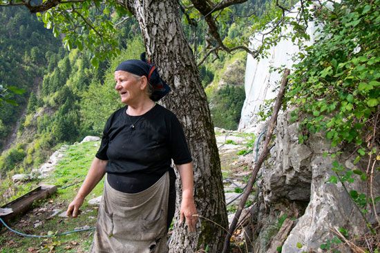 Το 4Χ4 αρχίζει να μουγκρίζει, καθώς κινούμαστε σε χωματόδρομο. Πριν τη δεκαετία του 1980, το χωριουδάκι επικοινωνούσε με τον υπόλοιπο κόσμο μέσω των μονοπατιών, που θα περπατήσουμε τις επόμενες δύο μέρες. Με προσωπικό κόπο και κόστος, που επιμερίστηκαν οι ίδιοι οι κάτοικοι, ανοίχτηκε το δίκτυο των χωμάτινων δρόμων και ακολούθησε το ρεύμα, το φως, το τηλέφωνο. Ένας από τους πρωτεργάτες είναι ο κ. Κώστας Γαντζούδης, ιδιοκτήτης του ξενώνα «Πανόραμα», όπου θα καταλύσουμε. Ένας αλλόκοτος στα μάτια μας ήρωας, αφού στην πιο παραγωγική του ηλικία, επέστρεψε στον τόπο καταγωγής του με τη γυναίκα του και τα παιδιά του, αντίθετα από το δρομολόγιο που επέλεγαν όλοι οι άλλοι. Κρατάει το χωριό σχεδόν μόνος του, καθώς οι μόνιμοι κάτοικοι δεν φτάνουν διψήφιο αριθμό. Όπως μας εξομολογείται, με τα ίδια του τα χέρια, έχει ανοικοδομήσει σχεδόν όλη την περιοχή, 140 από τα 150 σπίτια που υπάρχουν και γεμίζουν μονάχα το καλοκαίρι! Η ανάγκη τον μετέτρεψε σε μάστορα, ηλεκτρολόγο, υδραυλικό, ξενοδόχο, εστιάτορα, κτηνοτρόφο, ακόμα και τραυματιοφορέα. Ξυπνάω το επόμενο πρωί και πράγματι ο ύπνος στο χωριό είναι αναζωογονητικός. Κατεβαίνω από το δωμάτιο, έτοιμος για τις ορεινές περιπλανήσεις μας γεμάτος ενέργεια. Στα 1.100 μέτρα υψόμετρο, η όρεξη έχει ανοίξει. Ο κ. Κώστας μας υποδέχεται με μια ζεστή καλημέρα και έναν ακόμα πιο ζεστό, καυτό τραχανά, ομελέτες, σπιτικές μαρμελάδες από άγρια φρούτα του δάσους, αφράτα κέικ και ζυμωτό ψωμί. Απέναντι, παρατηρώ μια συστάδα βουνών που μοιάζουν με τη φιγούρα μιας ξαπλωμένης γυναίκας. «Είναι η Ωραία Κοιμωμένη των Αγράφων» μου αποκρίνεται, σαν να κατάλαβε την απορία, που είχε ζωγραφιστεί στο πρόσωπό μου.