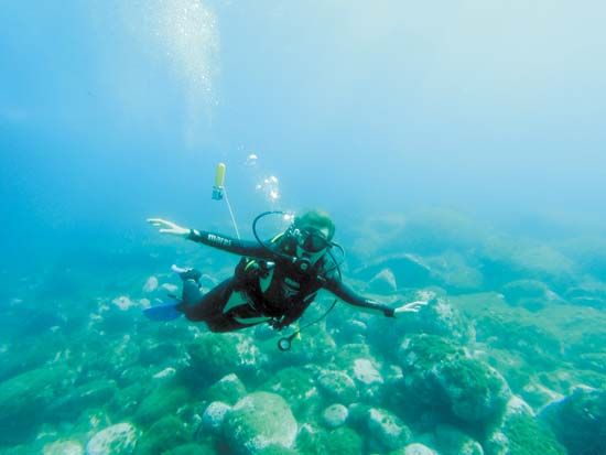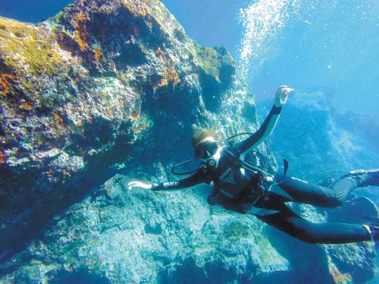 Μίλια προτού φθάσω, η ενέργεια των Κυθήρων διαχέεται στο πέλαγος και µε καλωσορίζει στα ανοιχτά του. Την αποδέχοµαι φωτογραφίζοντας. «Έχει µια απίστευτη δυναµική ο τόπος», συνεχίζει ο Γιώργος. "Με «πιάνει" κάθε φορά που µπαίνω στο λιµάνι. Παίρνω µια βαθιά ανάσα και το αισθάνοµαι σπίτι µου. Γι’ αυτό άνοιξα εδώ τη σχολή». Καθώς αποµακρυνόµαστε από το λιµάνι, ανεβαίνοντας το βουνό, το «Ιονίς» αφήνει πίσω του φωσφορίζοντα απόνερα στην πορεία του για Αντικύθηρα και Κίσαµο Κρήτης. Άγονη γραµµή. Φεγγοβολάει µέσα στη σκοτεινή θάλασσα και µένω µε τον πόθο της φωτογράφισης, σκεπτόµενη, πως κάποιες εικόνες δεν φωτογραφίζονται και παραµένουν ανεκπλήρωτοι πόθοι. Σαν κάποιους έρωτες…«Το λιµάνι είναι νησί. Το ∆ιακόφτι», λέει ο Γιώργος για να «σπάσει» την ηρεµία µέσα στο τζιπ. Ένα ναυάγιο κάνει την εµφάνισή του. «Ήταν το Nordland, πλοίο εµπορικό. Μέθυσε για τα καλά το πλήρωµα εκείνο το βράδυ – λένε οι φήµες – κι έπεσε πάνω στον ύφαλο. Την επόµενη µέρα δέχτηκαν να βγουν από το σκαρί κι ας τους παρακαλούσαν οι διασώστες όλη τη νύχτα». Γέλια. «Τώρα είναι ατραξιόν µε πολύ ζωή τριγύρω, πλήθος ψαριών και περιζήτητο για τους δύτες». Πρόσφατα µάλιστα, µετά από επίµονο αίτηµα του ∆ηµάρχου Κυθήρων, κ. Χαρχαλάκη, που ‘χε στο πλάι του και τους επαγγελµατίες του τόπου, η ιδιοκτήτρια εταιρία δέχτηκε τελικά, το πλοίο να µην αποµακρυνθεί και αντ’ αυτού να δηµιουργηθεί εδώ ένα διεθνές καταδυτικό πάρκο. Ο Γιώργος µοιάζει µε δελφίνο. Αρχικά, «δόθηκε» στην ιστιοπλοΐα, αφού µέχρι το 2006 επιτρεπόταν να βουτήξεις µόνο ως µέλος οργανωµένου καταδυτικού κέντρου και µόνο σε ελάχιστα µέρη. «Είµαι πολύ ελεύθερος άνθρωπος», εξοµολογείται. Το 2007, που «άλλαξε» ο νόµος, ξεκίνησα µαθήµατα. Το πρώτο δίπλωµα «βγαίνει» σε 4 µέρες και βουτάς µέχρι τα 18 µέτρα. Μάζεψα βουτιές, που είναι τόσο σηµαντικό όσο και το δίπλωµα. Για το δεύτερο δίπλωµα βουτάµε µέχρι τα 30 µέτρα. Στη σχολή µου, προσφέρω τρία πράγµατα, όπως τα περισσότερα καταδυτικά κέντρα: ∆ίνουµε την ευκαιρία σε έναν άπειρο (σαν εµένα) να βιώσει την εµπειρία της βουτιά... Πριν προλάβει καλά καλά να µου την περιγράψει, έχω φορέσει µε δειλές κινήσεις τη στολή του δύτη, έχουµε σαλπάρει µε το φουσκωτό, αλλά πριν από όλα, έχω µάθει τα βασικά: θεωρητικά και πρακτικές. Μπαίνουµε σε µια σπηλιά µε τιρκουάζ νερά µέσα στη βραχονησίδα της Χύτρας. Αισθάνοµαι, σαν να εκπληρώνω το κοριτσίστικο όνειρο, που είχα, όταν είδα τη «Γαλάζια Λίµνη» µε την Μπρουκ Σιλντς. Στο µπλε κοµµάτι του ουρανού, ανάµεσα στα βράχια, πετάνε τα γεράκια της Ελεονόρας (Βασίλισσα της Ισπανίας), που έρχονται από τη Μαδαγασκάρη, για να γεννήσουν. Στο τέλος αυτής της σπηλιάς υπάρχει ένα καταφύγιο για φώκιες. Μα ο δάσκαλος έχει άλλα στο πρόγραµµα… Μου φορά µία ζώνη µε βαρίδια, µάσκα και αναπνευστήρα, δεύτερο αναπνευστήρα, µανόµετρο (που δείχνει την πίεση, αλλά έµµεσα δείχνει πόσο αέρα έχει ακόµη η φιάλη µου, που όµως δεν το βλέπω, αφού είµαι χωρίς τα γυαλιά µου) και φυσικά τη φιάλη που έχει µέσα αέρα και «όχι οξυγόνο, όπως γράφουν λανθασµένα οι συνάδελφοί σου», µε µαλώνει. Νιώθω την αδρεναλίνη να ανεβαίνει, ψέµατα δε λέω, όταν ο δάσκαλος µου ζητά να πέσω στον βυθό σε βουτιά αλά Κουστό. Κι εγώ, που µε ήξερα για γοργόνα των βυθών και έκανα µακροβούτια, προσπερνώντας τους φίλους µου, τώρα µε όλον αυτόν τον εξοπλισµό πάνω µου, παίρνω ανάσες, ξανά και ξανά αλλά… που να βουτήξω; Κι αν όλα αυτά τα βάρη µε πά
