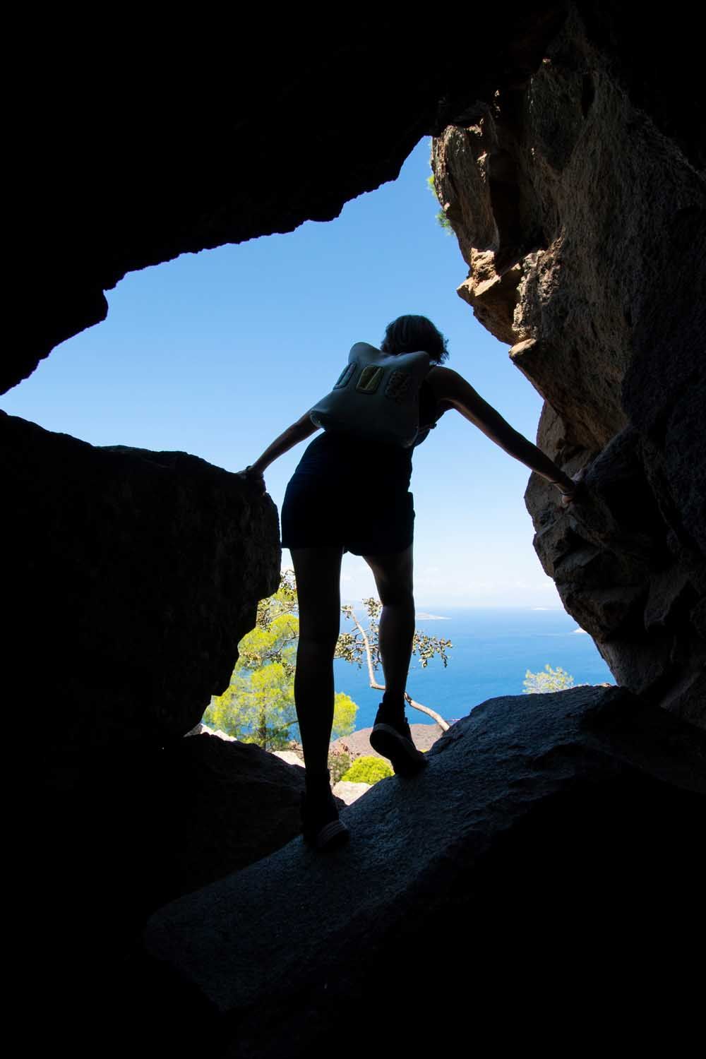 Ολόκληρη η χερσόνησος κρύβει 30 κρατήρες κι εµείς θα επισκεφτούµε αυτόν κοντά στη Καµένη Χώρα. Ο Σπύρος µου τονίζει, πως το µονοπάτι που βαδίζουµε, ανήκει σε ένα δίκτυο ορειβατικών - πεζοπορικών µονοπατιών που ένωναν τα χωριά του τόπου µε σκοπό την εξυπηρέτηση για µετακίνηση και µεταφορά αγαθών από τους κατοίκους. Τώρα πια, τα περισσότερα έχουν κλείσει, αλλά µε πρωτοβουλία των ντόπιων κάποια παραµένουν ανοιχτά. Η διαδροµή είναι εύκολη και µικρή. Σαν χέλι ξεδιπλώνεται και µας οδηγεί σε κοκκινωπούς εντυπωσιακούς βράχους, που φαίνονται έτοιµοι να φύγουν από τη θέση τους. Η πανοραµική θέα σου κόβει την ανάσα. Η τελευταία έκρηξη του ηφαιστείου έγινε το 1700, υποθαλάσσια. Εµείς τώρα, πατάµε την κορυφή του στα 410 µέτρα υψόµετρο όπου βρίσκουµε µια εντυπωσιακή σπηλιά. Οι ντόπιοι την αναφέρουν ως «κρατήρα», αλλά στην πραγµατικότητα δεν είναι, όπως µου υπογραµµίζει ο Στέλιος. Καθώς µπαίνουµε µέσα, εντύπωση µου προκαλούν οι λείοι τοίχοι που σαν κώνος καταλήγουν σε τεράστιους βράχους. Κρέµονται πάνω από τα κεφάλια µας κιανάµεσά τους ανοίγµατα, όπου διακρίνουµε το φως του ουρανού.