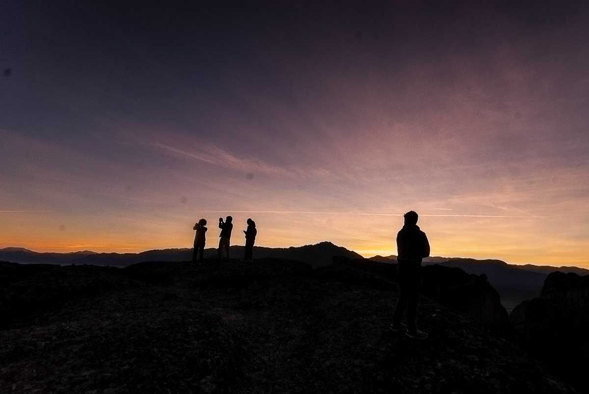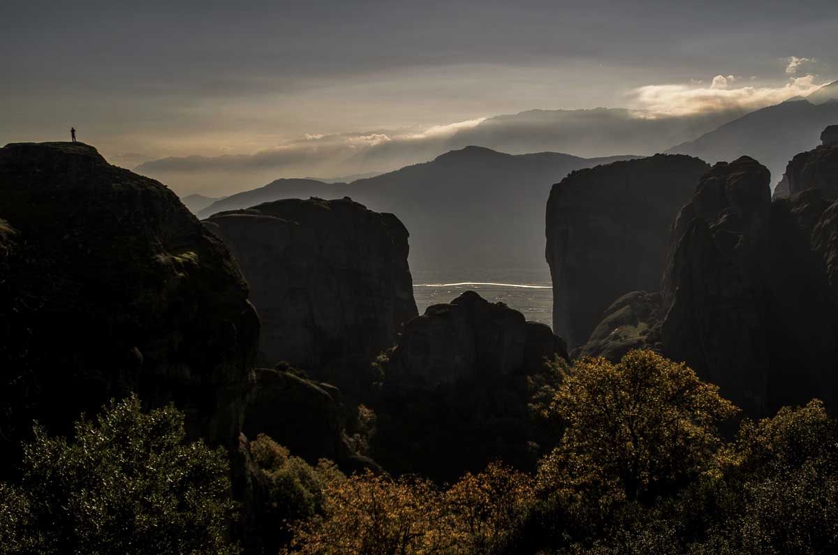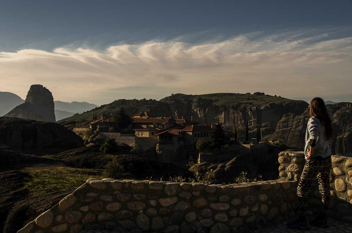 Ποια να ’ναι η πιο όμορφη μονή; Η Αγία Τριάδα; Ο γαλήνιος Άγιος Στέφανος, καταφύγιο του Παύλου Μελά, με την ειρηνική εσπερινή του θέα; Η Μονή Ρουσσάνου, που ορθώνεται σαν γιγάντιο μανιτάρι πάνω απ’ το κεφάλι σου με τα μελίσσια και τις φροντισμένες τριανταφυλλιές; Για τη Μάρω Θεοδώρου, κεραμίστρια και καθηγήτρια στη σχολή ξυλογλυπτικής, είναι ο Άγιος Νικόλαος με τις περίφημες αγιογραφίες του ζωγράφου Θεοφάνους. Για τη Βασιλική, είναι ο Άγιος Νικόλας ο Αναπαυσάς και για τον κύριο Τάσο, ωραιότερη είναι η περίφημη Μονή Βαρλαάμ, το δεύτερο σε επισκεψιμότητα μοναστήρι των Μετεώρων, όπου ο ίδιος βγάζει ένα μεροκάματο ως μικροπωλητής. Για τους περισσότερους πάντως είναι το Μεγάλο Μετέωρο, η μεγαλύτερη μονή της μετεωρίτικης μοναστικής πολιτείας, που ίδρυσε περί το 1344 ο μοναχός Αθανάσιος, καταδιωγμένος από το Άγιο Όρος. Ή ιστορία της, η πανέμορφη άγρια θέα, το εσωτερικό του καθολικού της αλλά και τα μεγάλης καλλιτεχνικής και θρησκευτικής αξίας εκθέματα που φιλοξενεί την καθιστούν τη μεγαλύτερη σε επισκεψιμότητα μονή. Όλα τελικά τα μοναστήρια τα περπατήσαμε. Σε όλα ανεβήκαμε, ήταν να γίνει η αρχή. Κι απ’ την Ψαρόπετρα αγναντέψαμε τη δύση, μαζί με Γάλλους, Γιαπωνέζους, Ρώσους και τεμπέλικους γάτους. Μαγευτήκαμε, χαθήκαμε, φανταστήκαμε μορφές, απέκτησαν ανθρώπινη υπόσταση οι βράχοι. Σαν να ταξιδέψαμε για λίγο σε έναν άλλο κόσμο. Βράδιασε κι έβαλε ψύχρα, μα δεν σ’ αφήνει τ’ Αδράχτι –φτερό από πέτρα που χορεύει στον άνεμο–, δεν σ’ αφήνει το φως, τα δυο φωτάκια των μονών, ο χωροχρόνος. Να ‘ταν οκτώ οι ώρες που περπατήσαμε απόψε; Να ’χε λέει και φεγγάρι. Εκεί θα ήμασταν ακόμα! Στο Καστράκι πια αποφασίζουμε να γυρίσουμε με οτοστόπ. Συνηθίζεται στα Μετέωρα με τόσο τουρισμό. Το βράδυ πίνουμε στο καφενείο του Φουρτούνη. Τσιπουράκι και μεζέ, μπιρίτσα ο Κώστας. Απλά πράγματα, παραδοσιακά, από μια παρέα νέων παιδιών που ‘χουν κρατήσει ένα καφενείο τόσο όμορφο, όπως τότε. Και όλη η Καλαμπάκα μαζεύεται εδώ…