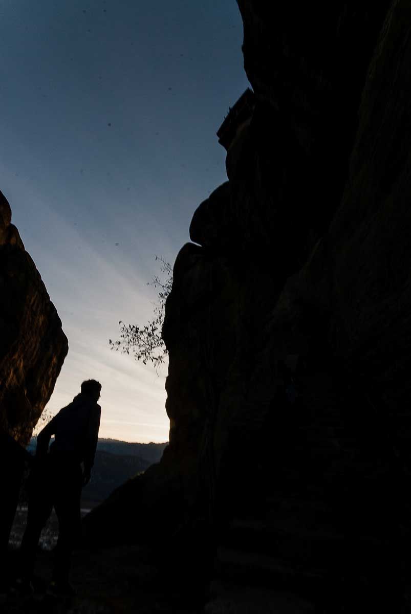 Θα κατεβούμε και θα κυκλώσουμε τον βράχο ακολουθώντας βόρεια κατεύθυνση ώστε να δούμε από κοντά τις λεγόμενες «φυλακές των μοναχών» – ένα θεόρατο κατακόρυφο σπήλαιο με πολλές φυσικές κοιλότητες, όπου κατέφευγαν όπως λέγεται οι μοναχοί από τα γύρω μοναστήρια προκειμένου να αυτοτιμωρηθούν, να εξιλεωθούν, να μετανοήσουν… Ερειπωμένες ξυλοκατασκευές, σφηνωμένες στις σπηλαιώσεις, μαρτυρούν κάτι από τη ζωή εκείνων των απόκοσμων στυλιτών που έκαμαν πατρίδα τους τον βράχο. Δίπλα από το σπήλαιο μια ακόμη αναρριχητική διαδρομή, από τις πιο προκλητικές, σου κόβει την ανάσα. Από τούτο το σημείο έχεις θέα σε όλο το βόρειο συγκρότημα των Μετεώρων, από αντίστροφη οπτική. Δεξιά προς αριστερά μας η Μονή Ρουσσάνου με τα κρεμαστά γεφυράκια, χτισμένη στην κορφή του κατακόρυφου στύλου, η Μονή Βαρλαάμ, ο Πλατύλιθος με το Μεγάλο Μετέωρο και εμπρός τους ο Άγιος Νικόλαος ο Αναπαυσάς. Σκέφτομαι τότε που η ανάβαση σε τούτες τις μονές γινότανε με την ανεμόσκαλα ή –ακόμα χειρότερα– με το δίχτυ, ένα μάτσο τρύπες δεμένο με σχοινιά, να τρέμεις και να νικάς τον φόβο, καθώς το ανέβασμα έμοιαζε να κρατά αιώνες… Κι άλλους μύθους ιστορεί ο Κώστας για το πώς χτίστηκαν τα μοναστήρια, ενώ αναρωτιέσαι πραγματικά πώς ανέβηκαν τα υλικά –τόση πέτρα– στ’ απρόσιτα αυτά βράχια με τα μέσα της εποχής. Και κάπως έτσι, οι μύθοι αρχίζουν να φαντάζουν πιστευτοί! Πέρα στο βάθος, δεξιά, η Ψαρόπετρα, ο βράχος απ’ όπου εκατομμύρια άνθρωποι στον κόσμο έχουν καθίσει να αγναντέψουν νωχελικά το ηλιοβασίλεμα, κι από κει θα το κοιτώ κι εγώ γύρω στις 5 το απόγευμα...