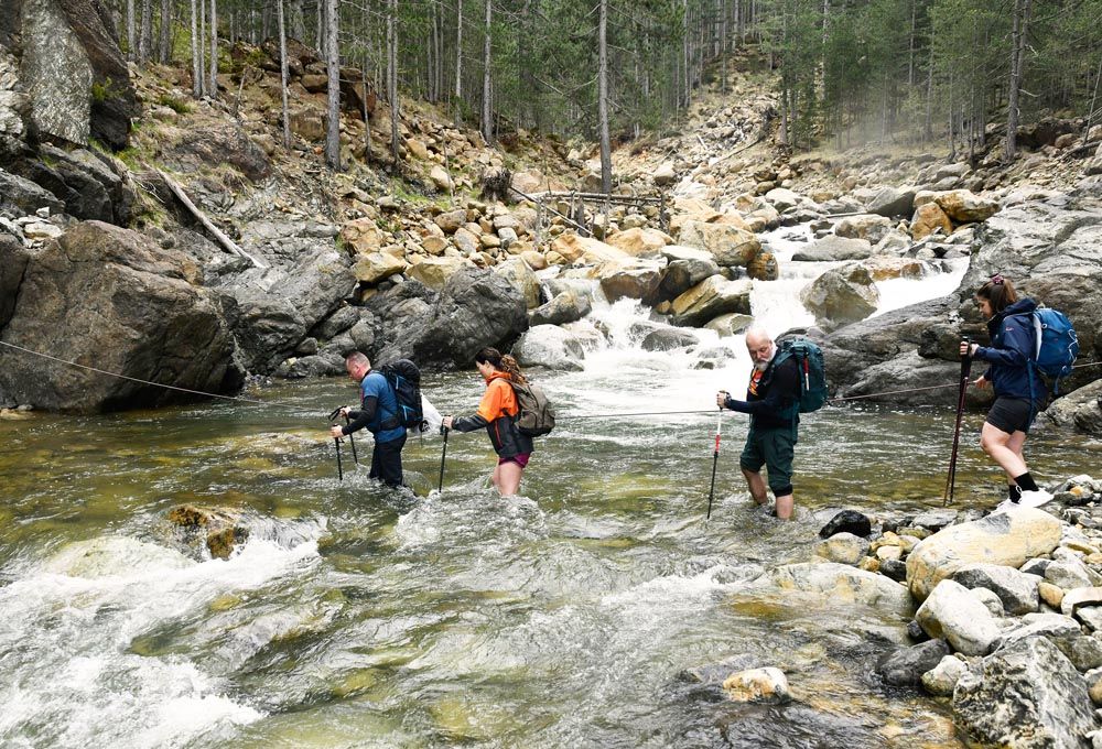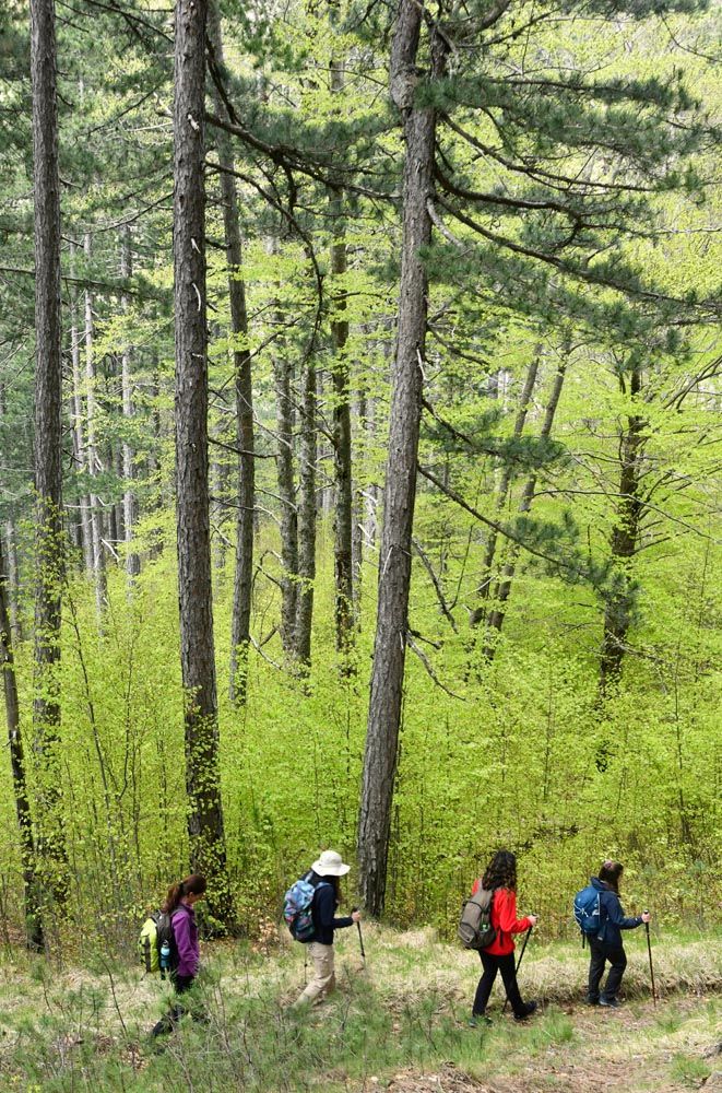 Ο δρόμος προς τον δρυμό ξεκινά. Κατεβαίνουμε και δίπλα μας κυλά το ρέμα. Η φύση σιγά σιγά μεταμορφώνεται. Τα πανύψηλα δέντρα από γυμνά στην αρχή όλο και πετάνε ολόφρεσκα βλαστάρια. Στην πορεία μας προς χαμηλότερο υψόμετρο πυκνώνει η βλάστηση και το πράσινο. Έλατα, οξιές, σφενδάμια, μαυρόπευκα και ρόμπολα εναλλάσσονται. Ο καιρός αρχίζει να μαλακώνει και ιδρώνοντας αφαιρούμε όλο και περισσότερο τα ενδύματά μας καθώς, παρότι κατεβαίνουμε, ζεσταινόμαστε! Είμαστε στη Βάλια Κάλντα, την περίφημη ζεστή κοιλάδα, τον τόπο που ο καιρός γλυκαίνει! Αναμφισβήτητα είναι ένα από τα πιο όμορφα μονοπάτια που έχω διαβεί στα τόσα χρόνια που γυρνώ στα βουνά. Όλοι συμφωνούμε ότι αυτό είναι το καλύτερο δώρο που θα μπορούσε να κάνει η Φωτεινή στον εαυτό της για τα γενέθλιά της!