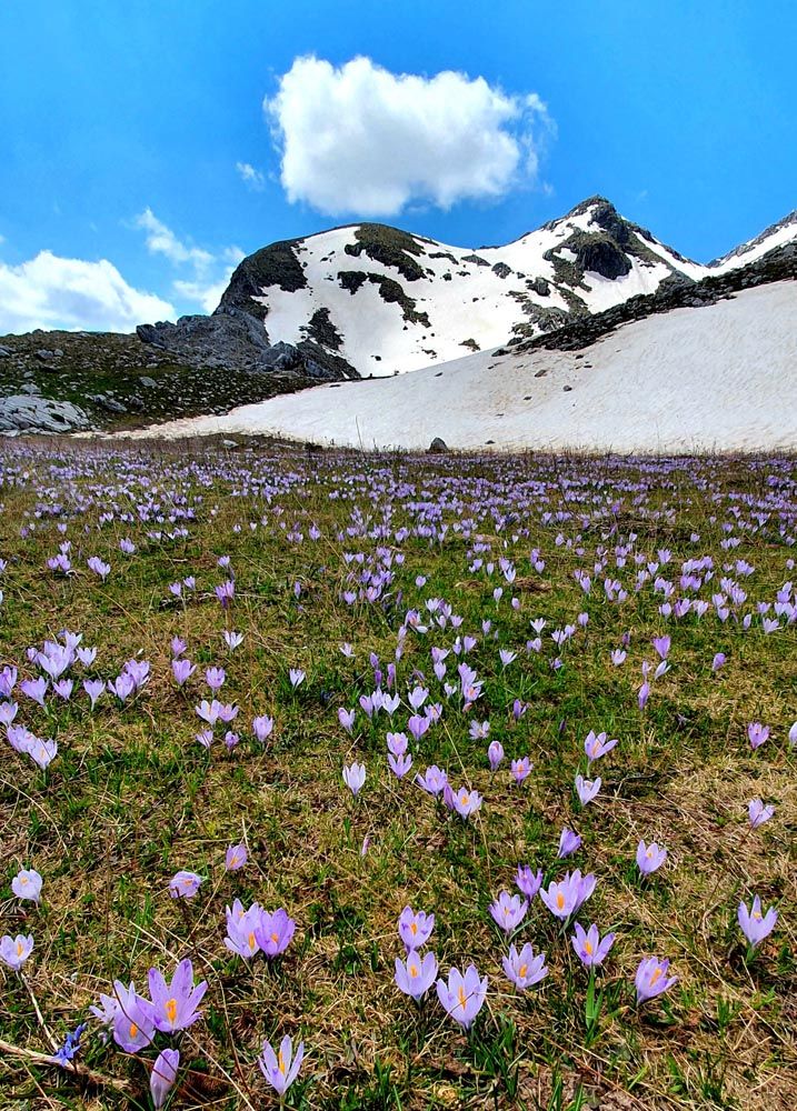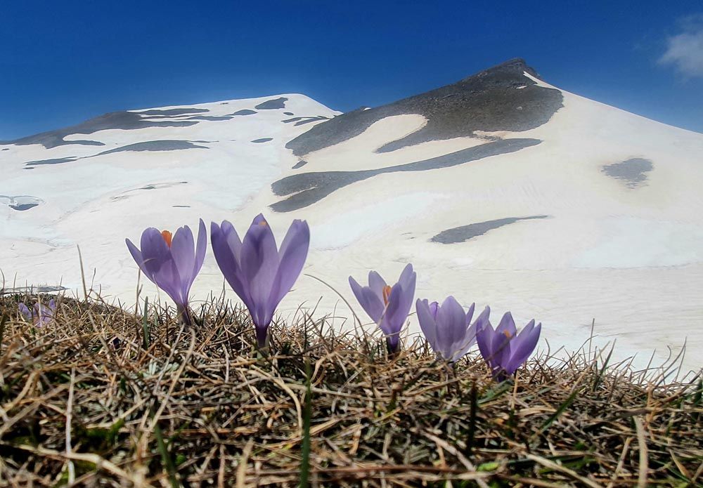 Ανεβαίνουμε και γεμίζει το φιλμ της ψυχής μας εκπληκτικές εικόνες βουνού, εισπνέουμε βουνό και όλο μας το είναι πλημμυρίζει με βουνό. Είναι όμως τόσο όμορφο που δεν χορταίνεται με τίποτα. Ανυπομονούμε να βγούμε από το αυτοκίνητο και να το αισθανθούμε ακόμα περισσότερο. Φτάνουμε σε ένα σημείο που δεν μπορούμε να προχωρήσουμε περισσότερο γιατί από δω και πάνω ο δρόμος σκεπάζεται από χιόνι. Γύρω μας αρχίζουν τα λιβάδια στρωμένα με το μωβ χαλί του κρόκου, του αγριολούλουδου που είναι αυτοφυές στα ορεινά, καλλιεργείται στα πεδινά και μας δίνει το υπερπολύτιμο μπαχάρι σαφράνι. Θέλουμε να χαθούμε μέσα σε αυτή τη μωβ θάλασσα γιατί απλά είναι μαγική. Περπατάμε και η χαρά μας γίνεται όλο και μεγαλύτερη. Γινόμαστε όλοι μία πολύ ωραία παρέα που μας ενώνει η πανέμορφη εμπειρία του βουνού. Ξαφνικά είναι σαν να γνωριζόμαστε χρόνια, νιώθουμε σαν μία οικογένεια. Ο Παναγιώτης όπως πάντα μας οδηγεί και σαν ιδανικός αρχηγός της εκδρομής που είναι, φροντίζει για όλους μας και για όλα.