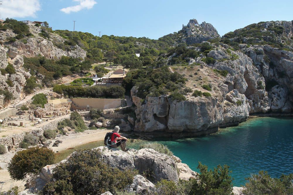 Αργά το απόγευμα επιστρέψαμε στην αυλή της εκκλησιάς, απλώσαμε τα «υλικά» μας επάνω στο πεζούλι και μαγειρέψαμε με το γκαζάκι μας, καθώς ήδη είχαμε σχεδιάσει να διανυκτερεύσουμε. Την επομένη, συνεχίσαμε τον ίδιο δρόμο για 500 ακόμη μέτρα μέχρι το τέρμα του, που οδηγεί σε χώρο στάθμευσης. Από εδώ, ένα μονοπάτι σε φέρνει στον αρχαιολογικό χώρο του Ηραίου και ένα άλλο ως τον φάρο στο ακρωτήρι Μελαγάβι. Πήραμε τον κατηφορικό δρόμο προς τον αρχαιολογικό χώρο, που βρίσκεται ακριβώς επάνω στην ακροθαλασσιά! Η είσοδος σε αυτόν είναι ελεύθερη, ενώ παραμένει καθαρός και φροντισμένος, με επεξηγηματικές πινακίδες. Πρόκειται ουσιαστικά για τον ιερό ναό της Ήρας Ακραίας (στο άκρο της στεριάς) και για την κατασκευή του λαξεύτηκε τμήμα της πλαγιάς του λόφου. Ο ναός χτίστηκε αρχικά γύρω στο 800 π.Χ., ενώ τον 6ο π.Χ. αιώνα οικοδομήθηκε νέος. Είναι το ιερό που βλέπουμε σήμερα με αρκετές μεταγενέστερες προσθήκες των κλασικών κυρίως χρόνων. Ο ναός παρέμεινε ανέπαφος μέχρι τον 2ο αι. π.Χ., όταν το Ηραίο καταστράφηκε από τους Ρωμαίους. Έχουν διασωθεί ερείπια του ιερού, των τειχών, τμήμα της αγοράς, μιας εντυπωσιακής υδατοδεξαμενής, ακόμα και εστιατορίου (εστίας) που υπήρχε προκειμένου να εξυπηρετεί τις ανάγκες των πιστών. Η σημερινή παραλία αποτελούσε το λιμάνι του τότε θρησκευτικού κέντρου και τα γαλαζοπράσινα νερά της σε προσκαλούν οπωσδήποτε για μια βουτιά. Αν διαθέτεις μάσκα ο βυθός προσφέρεται και για υποβρύχια εξερεύνηση, αφού διακρίνονται ακόμη τα ερείπια του αρχαίου εκείνου λιμανιού! Είναι τόσο αναζωογονητικά αυτά τα πρώτα ανοιξιάτικα μπάνια, σε ξυπνούν και σε γεμίζουν με ενέργεια!
