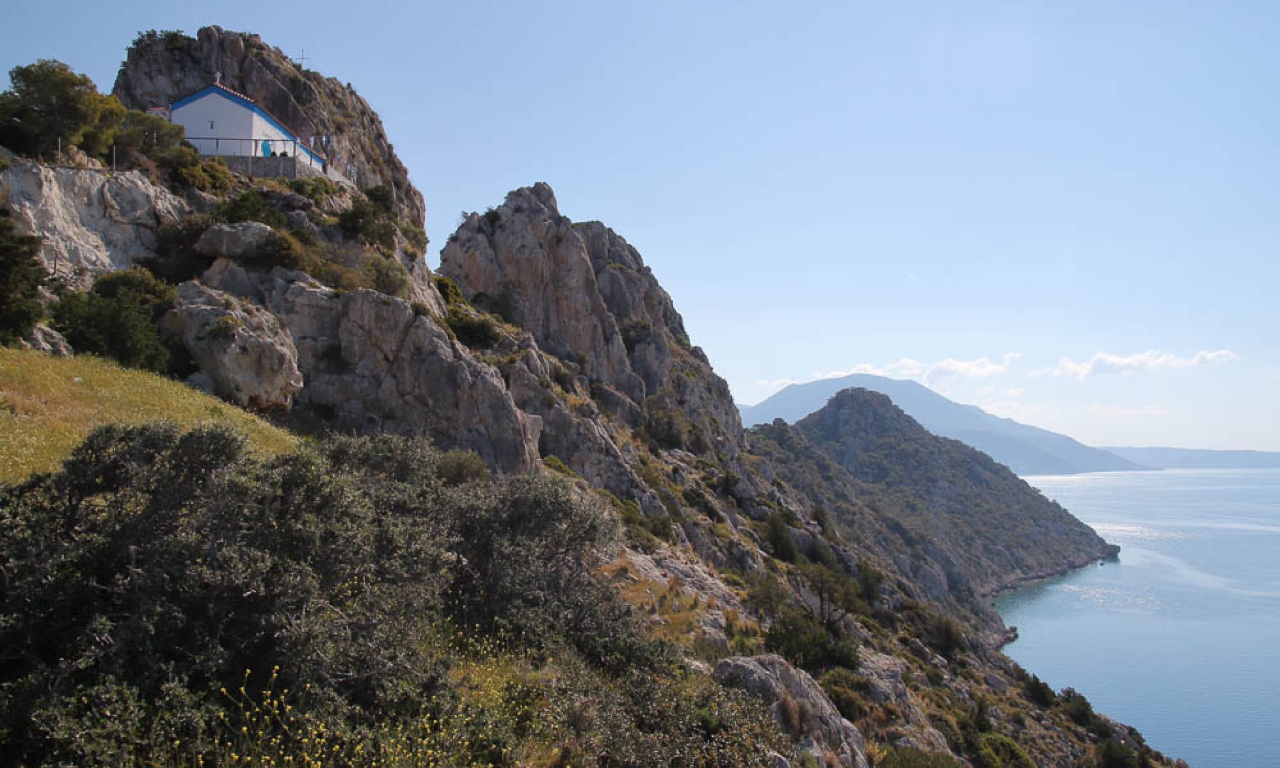 Κινούμενοι παραλιακά φτάσαμε στο δυτικό άκρο της λίμνης και ανηφορίσαμε στη χερσόνησο. Μετά από ένα χιλιόμετρο φτάσαμε σε χαρακτηριστικό λιβάδι από όπου ένα μονοπάτι οδηγεί στο εκκλησάκι του Αγίου Νικολάου, μια αετοφωλιά ψηλά στην εσοχή ενός βράχου. Ανηφορίσαμε πεζοί και βρεθήκαμε στην αυλή της εκκλησίας, ένα «μπαλκόνι» πάνω από τον Κορινθιακό κόλπο. Η θέα προς το Λουτράκι, την Κόρινθο, τη Ζήρια και τον Παρνασσό, μαγνητίζει το βλέμμα για αρκετή ώρα. Πήραμε μια ανάσα, χαλαρώσαμε και περπατήσαμε λίγο ψηλότερα στην κορυφή, ανάμεσα στους τεράστιους ογκόλιθους που σχηματίζουν την «κορυφογραμμή» της ράχης και «παίζοντας» αναρριχητικά στα γύρω βράχια. Αξίζει να σημειωθεί ότι στη δυτική πλευρά της εκκλησίας υπάρχει αρχαίο τείχος, τμήμα πιθανόν αρχαίας ακρόπολης. Η λίμνη ήταν γνωστή από την αρχαιότητα με την ονομασία Γοργώπις, που προέρχεται από τον μύθο της κόρης του Μεγαρέα και σύζυγο του Κορίνθου, Γόργης, η οποία πνίγηκε στα νερά της μην μπορώντας να αντέξει τον θάνατο των παιδιών της. Έχουν βρεθεί ερείπια συνεχούς κατοίκησης από το 3000 π.Χ., καθώς κοντά στον δίαυλο έχουν έρθει στο φως ίχνη οικισμού που ανάγονται στην πρωτοελλαδική περίοδο.