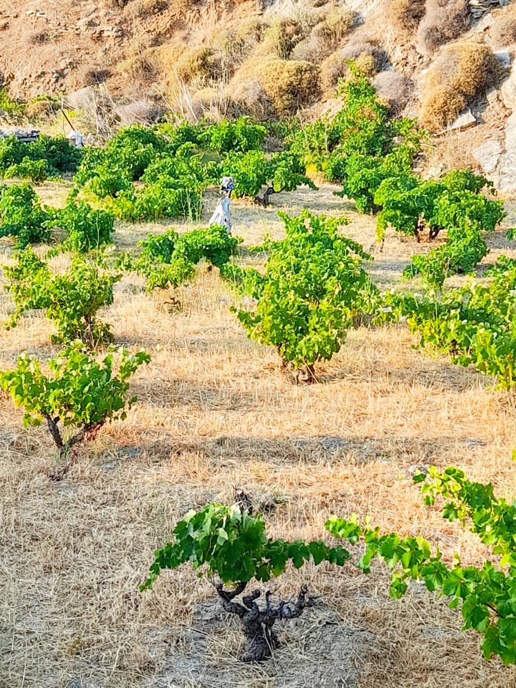 Ξεκινώντας την περιήγησή μου στη Σύρο διαπίστωσα για μια ακόμα φορά πόσο άδικος είναι ο χαρακτηρισμός ‘ξερονήσια’ για τις περισσότερες από τις Κυκλάδες, ιδιαίτερα για τα μεγαλύτερα από τα νησιά τους. Το τοπίο μαρτυρούσε παντού έναν τόπο με πλούσια αγροτική παράδοση. Ξερολιθιές, κηπάκια «περιφραγμένα» με καλαμιές για να προστατεύονται από τον αέρα, παλιά εγκαταλελειμμένα πηγάδια κοντά στις ρεματιές, στέρνες για συγκέντρωση των βρόχινων νερών.