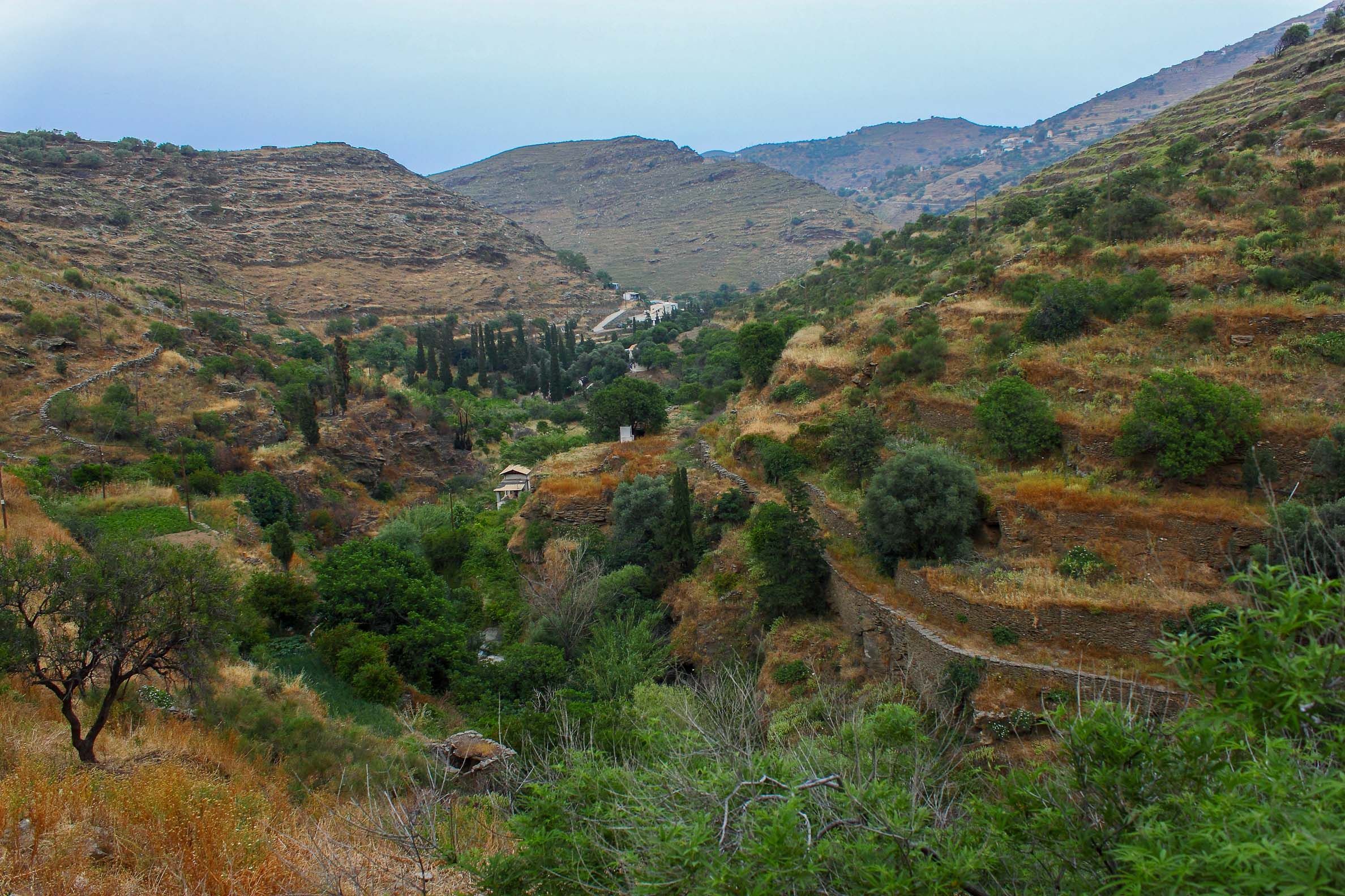 Κατηφόρισα προς τον αρχαιολογικό χώρο της Καρθαίας, ακολουθώντας το παλιό λιθόστρωτο μονοπάτι που διασχίζει το φαράγγι του Βαθυποτάμου. Η βλάστηση, στα χρώματα του πράσινου, του κόκκινου και του κίτρινου, έδινε το στίγμα της εποχής. Πολλά χωράφια — τα περισσότερα εγκαταλελειμμένα — οι σκόρπιες «καθοικιές», ακόμα και μια «ξεχασμένη» πηγή, από τις λίγες αυτής της πλευράς του νησιού, παραπέμπουν σε εποχές που η αγροτική ζωή άκμαζε.