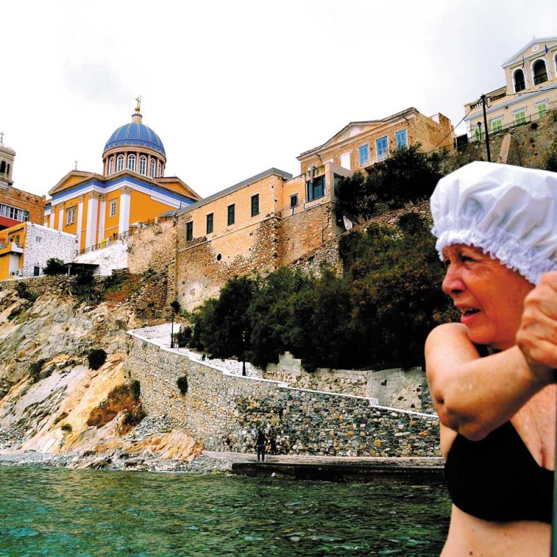 Ο ήλιος κρύφτηκε στα Βαπόρια. Τα νιαουρίσματα οδηγούν τη φθινοπωρινή μου εκδοχή στην άκρη της προκυμαίας. Το βλέμμα σαστίζει στο καθρέφτισμα των αρχοντικών, που έχουν σκύψει πάνω από τον μοβ βράχο για να απολαύσουν τη διαχρονική ομορφιά τους. Ένα ανεπαίσθητο κυματάκι ταράζει τη μορφή τους. Μια ηλικιωμένη κυρία θα φέρει ξανά την άνοιξη, καθώς βουτάει στα νερά της παραλίας του Αγίου Νικολάου. Ο ουρανός αρχίζει να φωτίζει σαν αντικρίζω τον φάρο στο απέναντι νησάκι Διδύμη. Προσκυνώντας τον συμβολισμό, συνεχίζω. Αποσβολωμένη κοιτώ τον Άγιο Νικόλαο τον Πλούσιο. Όλο το νησί καμαρώνει για την εξαιρετική ομορφιά του και δικαίως κατέχει μια θέση στους ωραιότερους ναούς του κόσμου. Συνεχίζω τη μεγάλη μου βόλτα στο κοιμητήριο της Ερμούπολης, εκεί όπου οι άγγελοι παίρνουν φόρα από τις κορφές των πολυτελών μαυσωλείων των επιφανών οικογενειών για το αιώνιο πέταγμα στους ουρανούς. Μια όμορφη μέρα συνοδεύεται πάντα από ένα καφεδάκι, λίγη ζεστή ελαφριά χαλβαδόπιτα και μια μπουκίτσα ροζ συννεφάκι, που δεν είναι άλλο από το παραδοσιακό συριανό λουκούμι με τριανταφυλλένια προτίμηση, και ο πρωινός μου περίπατος ολοκληρώνεται.