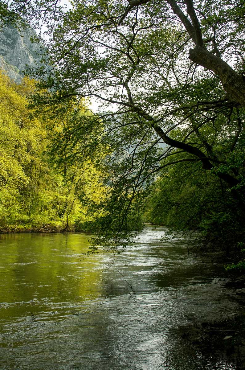 Στροφή με τη στροφή στη φιδίσια ανηφοριά, η θέα του Πηνειού, όπως φωτίζεται στον ήλιο του μεσημεριού, επιβεβαιώνει τον ομηρικό χαρακτηρισμό «αργυροδίνης» – αυτός που σχηματίζει ασημόχρωμες δίνες.