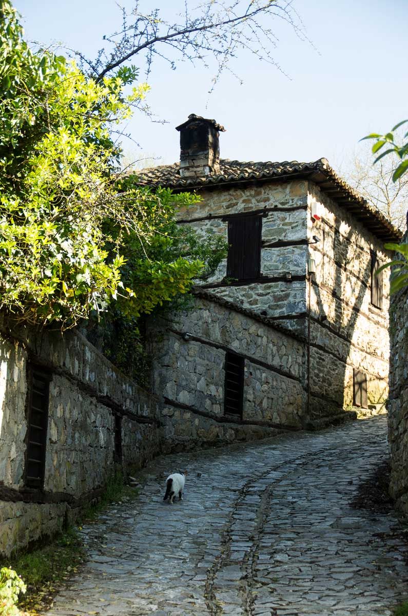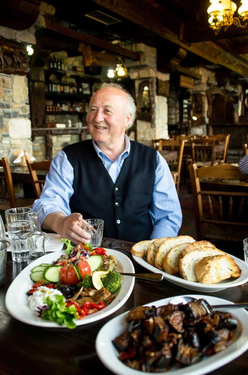 Ίσως γι’ αυτό συχνά δεν είσαι σίγουρος για το πού ακριβώς βρίσκεσαι. Βόρεια σε σκεπάζουν οι χιονισμένες κορφές του Ολύμπου, ακολουθεί το κάστρο του Πλαταμώνα, σε υποδέχονται με την πέτρα τους κουκλίστικοι ορεινοί οικισμοί: ο Παλαιός Παντελεήμονας, ένας παραδοσιακός αναπαλαιωμένος οικισμός, που πρωτοσυναντάμε στις αρχές του 16ου αιώνα και βρίσκεται χτισμένος σε υψόμετρο 440 μ. στις ανατολικές πλαγιές του Ολύμπου. Το χωριό ζούσε πλουσιοπάροχα από την εκτροφή μεταξοσκώληκα και τις μπολιασμένες αγριοκαστανιές που δημιούργησαν τον σημερινό ήμερο καστανεώνα που απλώνεται γύρω του. Στις αρχές της δεκαετίας του ’60, άρχισε η εγκατάλειψη, καθώς με την έκρηξη του τουρισμού οι κάτοικοί του μετακομίζουν προς τη θάλασσα χτίζοντας εκεί τον Νέο Παντελεήμονα. Στα μέσα της δεκαετίας του ’80, κάποιοι ξένοι φαίνεται να επανεκτιμούν τον τόπο, αγοράζουν τα πρώτα εγκαταλειμμένα κτίσματα και τα αναπαλαιώνουν. Ύστερα χτίζεται το πρώτο χάνι, έπειτα ακόμη ένας ξενώνας κι ανοίγουν τα πρώτα μαγαζάκια, που μέχρι σήμερα προσφέρουν καλό φαγητό και αρτιστίκ σουβενίρ. Τα αμέτρητα πλακόστρωτα με φόντο την καταπληκτική θέα φιλοξενούν σήμερα δέκα μόνιμους κατοίκους, πανέμορφους παραδοσιακούς ξενώνες και περιποιημένα τσιπουράδικα γύρω από την πλατεία με τον ναό του Άγιου Παντελεήμονα. Στον ξενώνα «Αγνάντι», στο ψηλότερο σημείο του οικισμού, τύχαμε θερμότατης υποδοχής από την οικογένεια Γκοδελιά. Αυτοδίδακτος ο κ. Βαγγέλης έμαθε πριν από δεκαπέντε χρόνια να σκαλίζει το ξύλο. Μας ξεναγεί στις αμέτρητες ρήσεις, τα αντιναζιστικά και… αντικαπνιστικά μηνύματα, στο «Αν» του Κίπλνγκ και τα άφθονα πειράγματα, όλα σκαλισμένα στην ντοπιολαλιά του χωριού. Το «Αγνάντι», με το κελάρι, το εστιατόριο και τα φιλόξενα δωμάτια με το τζάκι, προσφέρει μέχρι και σπα σε μια θέα που δεν χορταίνεις να τη ρουφάς. Πολιτική και φιλοσοφία, παρέα με τους νόστιμους μεζέδες της κυρα-Πόπης και κουμαρίσιο τσιπουράκι, το τοπικό προϊόν του χωριού, το οποίο αποτελεί σήμερα ένα από τα καλύτερα παραδείγματα παραδοσιακής μακεδονίτικης Στροφή με τη στροφή στη φιδίσια ανηφοριά, η θέα του Πηνειού, όπως φωτίζεται στον ήλιο του μεσημεριού, επιβεβαιώνει τον ομηρικό χαρακτηρισμό «αργυροδίνης» – αυτός που σχηματίζει ασημόχρωμες δίνες. αρχιτεκτονικής στη βόρεια Ελλάδα. Καθώς είναι στραμμένο προς τον Βορρά, όταν έχει άπνοια, αγναντεύεις ως τη Χαλκιδική... Αν θέλεις να κρατήσεις λίγο ακόμα από το παραμύθι, μπορείς να ακολουθήσεις τη σήμανση προς την Καλλιπεύκη. Διασχίζοντας το ομώνυμο οροπέδιο στις πλαγιές του Κάτω Ολύμπου, το μάτι σου ταξιδεύει σε μια θέα απίθανη...