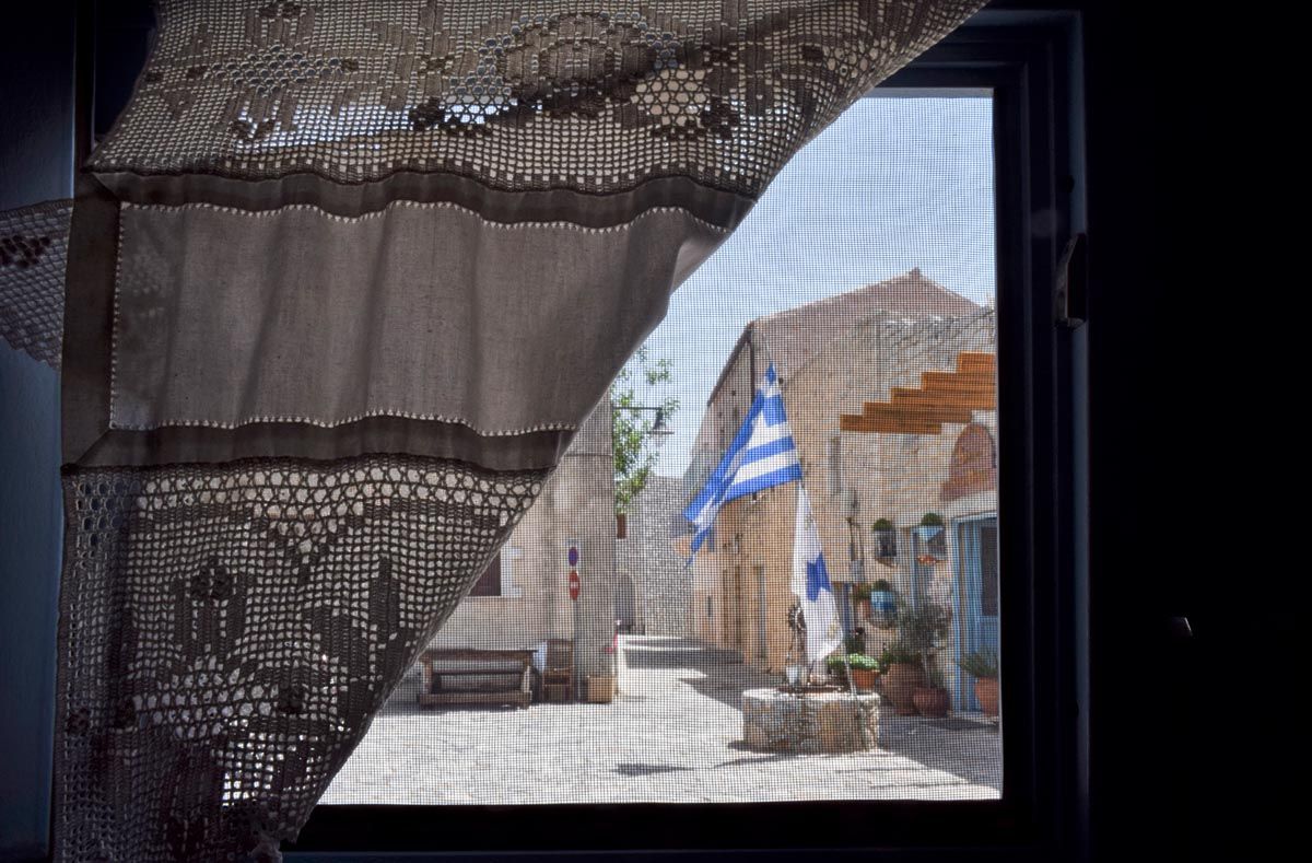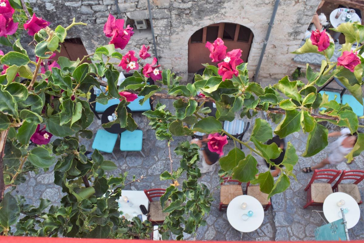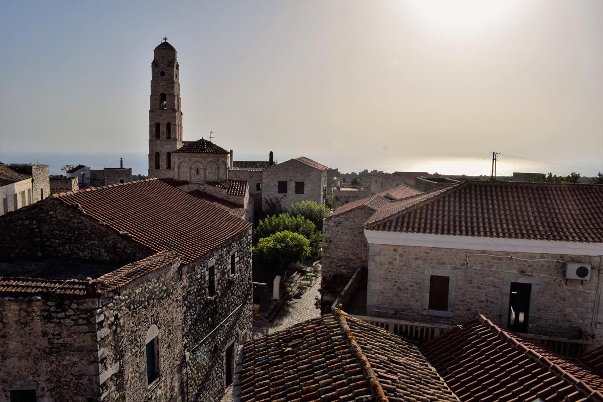Καλντερίμια, πέτρα, ψηλοί πύργοι σαν φρυκτωρίες, αυλές με λεμονιές, προστατευμένες από τους χειμωνιάτικους βοριάδες. Απάγκιες αλέες ντυμένες το καλοκαίρι με καμπανούλες, στεφανωτές, βουκαμβίλιες, ρυγχόσπερμα και κισσό. Συκιές με κυρίαρχη, επιβλητική παρουσία, ειδικά σε εκείνες τις κατοικίες που έχουν εγκαταλειφτεί από τους ιδιοκτήτες τους. Ταράτσες που βράζουν στον καυτό ήλιο της μέρας αλλά το δειλινό μετατρέπονται σε φιλόξενες γωνιές, οάσεις δροσιάς, για να απολαύσεις τα γευστικότατα τοπικά φαγητά, το καφεδάκι ή το ποτό σου.
