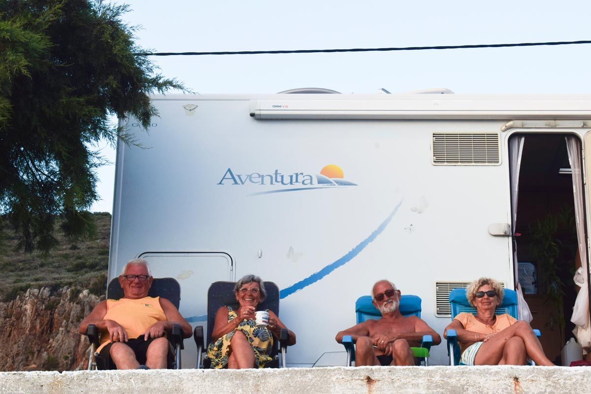 Στο ακροθαλάσσι, έχοντας θέα τον όρμο, παραταγμένα στην σειρά αυτοκινούμενα τροχόσπιτα, τ' όνειρο κάθε ταξιδευτή.
