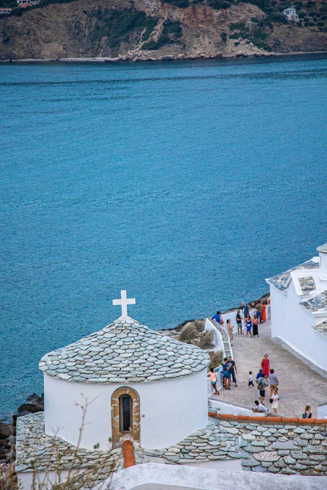 Στο ένα άκρο του λιμανιού, η σκάλα που περνάει από την Παναγίτσα του Πύργου και καταλήγει στο Ενετικό Κάστρο από το οποίο δεν σώζονται παρά μόνο υπολείμματα από τα τείχη του που βρίσκονται διάσπαρτα ανάμεσα σε κάποιες κατοικίες. Μη σας αποτρέψει αυτό, η ανηφόρα αξίζει την προσπάθεια. Η Παναγίτσα του Πύργου θα σας αποζημιώσει για την προσοχή και τη στάση σας εδώ – το τέμπλο της χρονολογείται στον 17ο αιώνα – ενώ η ανηφοριά πίσω από την εκκλησία προσφέρει καθηλωτική θέα στο απέραντο της θάλασσας που μπορείς απλά να κάτσεις και να το χαζεύεις με τις ώρες. Στη χώρα της Σκοπέλου, πέρα από το λαογραφικό μουσείο που μπορεί κανείς να επισκεφθεί, βρίσκονται το σπίτι του λογοτέχνη Παύλου Νιρβάνα και το αρχοντικό Βακράτσα (παλιό Αρχοντικό). Μια επίσκεψη σε αυτούς τους χώρους θα σας δώσει μια πιο πλήρη εικόνα της νεότερης ιστορίας του νησιού που έχει πλούσιο εμπορικό, οικονομικό και πολιτικό παρελθόν.