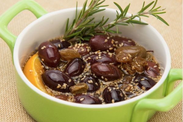 Ελιές με σταφίδες, μέλι, πορτοκάλι και σουσάμι