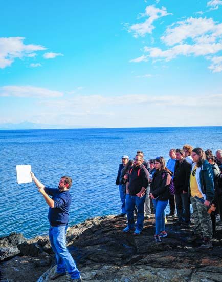 Στη θέση Αυλάκι ανακαλύπτουμε έναν μοναδικού κάλλους και σπουδαίας επιστημονικής αξίας γεώτοπο, καθώς εδώ οι δύο τεκτονικές ενότητες των πετρωμάτων του Λαυρίου και το γιγαντιαίο ρήγμα αποκόλλησης των >120km, που χωρίζει τα πετρώματα, έπαιξαν κομβικό ρόλο στην κοιτασματογένεση της λαυρεωτικής γης. Δώθε η θάλασσα αγκαλιάζει τον κοκκινόμαυρο βράχο και δημιουργεί ένα τοπίο με αντιθέσεις, άγριο και γλυκό, απόμακρο και προσιτό, φανερό και αθέατο. Είναι τόσο σημαντικός ο τόπος που πατάμε, μας λέει ο Μιχάλης, δείχνοντας μας το αποτύπωμα του ρήγματος, που θα έπρεπε να χαρακτηριστεί μνημείο της παγκόσμιας φυσικής κληρονομιάς. Συνεχίζοντας την εξερεύνησή μας, επισκεπτόμαστε το δεύτερο μεγαλύτερο μεταλλευτικό κέντρο της περιοχής στην Πλάκα, όπου τα μεταλλεία των θειούχων ορυκτών, σαν κρυμμένες φωλιές ανάμεσα σε θάμνους και πεύκα, γειτνιάζουν με τον οικισμό των εργατών και τις πρωτοπόρες μεταλλευτικές εγκαταστάσεις. Ο Μιχάλης μας δείχνει έναν άλλον λόφο, με αξιοσημείωτη παρουσία στο διάβα των αιώνων, τον γρανοδιορίτη της Πλάκας, την κύρια πηγή δηλαδή δημιουργίας της πολυποίκιλης κοιτασματογένεσης της Λαυρεωτικής. Δεν είναι λίγο να συνειδητοποιείς (και να βλέπεις) την αιτία κατάταξης της Λαυρεωτικής μεταξύ των πρώτων περιοχών στον πλανήτη σε αριθμό καταγεγραμμένων ορυκτών, καθώς μαθαίνεις, ότι από τα 5.468 ορυκτά που αναγνωρίζονται επισήμως σε παγκόσμιο επίπεδο από τη Διεθνή Ορυκτολογική Ένωση (IMA), τα 800 περίπου (ή το 14,6%) προέρχονται από τη γη του Λαυρίου.