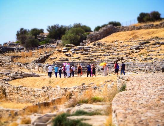 Λίγο πριν μπούμε στην πόλη του Λαυρίου, ένας λόφος, σαν πυραμίδα, μας καλωσορίζει, φωνάζοντας από μακριά τη μακραίωνη ιστορία της περιοχής, όπου έζησαν, δούλεψαν, ψυχαγωγήθηκαν και «αναπαύτηκαν» άνθρωποι πριν από πολλές χιλιάδες χρόνια. Δεν μπορεί να μην αιχμαλωτίσει το βλέμμα σου η κεραμιδί απόχρωση της πέτρας, που σε συνδυασμό με το μάρμαρο, τόσο στον λόφο όσο και στον αρχαίο οικισμό, φτιάχνουν μιαν απόκοσμη ατμόσφαιρα. Μια θαλασσινή αύρα χαϊδεύει τη δυνατή σιωπή του τόπου, απαλύνοντας τη σημερινή ερημιά, εκεί, που σε παλαιότερες εποχές μικρές ή μεγαλύτερες ιστορίες ανθρώπων δημιούργησαν την πρώτη τεχνολογική επανάσταση των Ελλήνων. Η μεταλλευτική ιστορία του Λαυρίου αρχίζει στο Θορικό, που αποτελεί μια από τις παλαιότερες βιομηχανικές περιοχές στον κόσμο. Η αρχαία πόλη εκτείνεται στα ριζά του λόφου Βελατούρι, προς την πεδιάδα και ανατολικά προς τη θάλασσα. Στον λόφο σώζονται ερείπια μυκηναϊκής ακρόπολης, θολωτοί τάφοι, οικισμός γεωμετρικής εποχής, ο ναός της Δήμητρας και της Κόρης, ο Ναός του Διονύσου, το Θέατρο και νότια της ορχήστρας αυτού, το νεκροταφείο. Το θέατρο του Θορικού, με το ιδιόμορφο ελλειψοειδές σχήμα, που στέκει περήφανο στη φυσική αμφιθεατρική πλαγιά στη νότια πλευρά του λόφου, κατασκευάστηκε πιθανώς στα τέλη του 6ου αι. π.Χ., ενώ επεκτάσεις στην ορχήστρα και τα διαζώματα πραγματοποιήθηκαν αργότερα (5ος και 4ος αι. π.Χ. αντιστοίχως). Φαίνεται, ότι η αύξηση της έντασης της μεταλλευτικής δραστηριότητας της περιοχής είχε ως αποτέλεσμα παρεμβάσεις στο θέατρο, ώστε να ικανοποιεί καλύτερα τις ανάγκες της κοινωνίας. Πράγματι, σπίτια, εργαστήρια και στοές γύρω από το θέατρο δείχνουν την πυκνότητα της κατοίκησης και την ποικιλία των δραστηριοτήτων των αρχαίων κατοίκων του Θορικού. Περπατάμε και φανταζόμαστε, άνδρες-δούλους να μεταφέρουν μεταλλεύματα, άνδρες-επιχειρηματίες να δίδουν οδηγίες ή να επιβλέπουν τις εργασίες, παιδιά και γυναίκες στις οικίες ή στο ιερό να προσφέρουν αναθήματα στο Διόνυσο, όπως και θεατές να παρακολουθούν αρχαία τραγωδία υπό το φως ενός καλοκαιρινού φεγγαριού. Παρατηρώντας, τριγύρω, στις πέτρες και τα μάρμαρα, δυο πράγματα μας καταπλήττουν. Νοτιοδυτικά της ορχήστρας, σώζονται χαράγματα με σύμβολα αλλά και περιγράμματα αρχαίων χεριών και πατουσών, ενώ πάνω ακριβώς από το άνοιγμα του αρχαίου μεταλλείου φαίνεται το χάραγμα του τοπογραφικού της στοάς του.