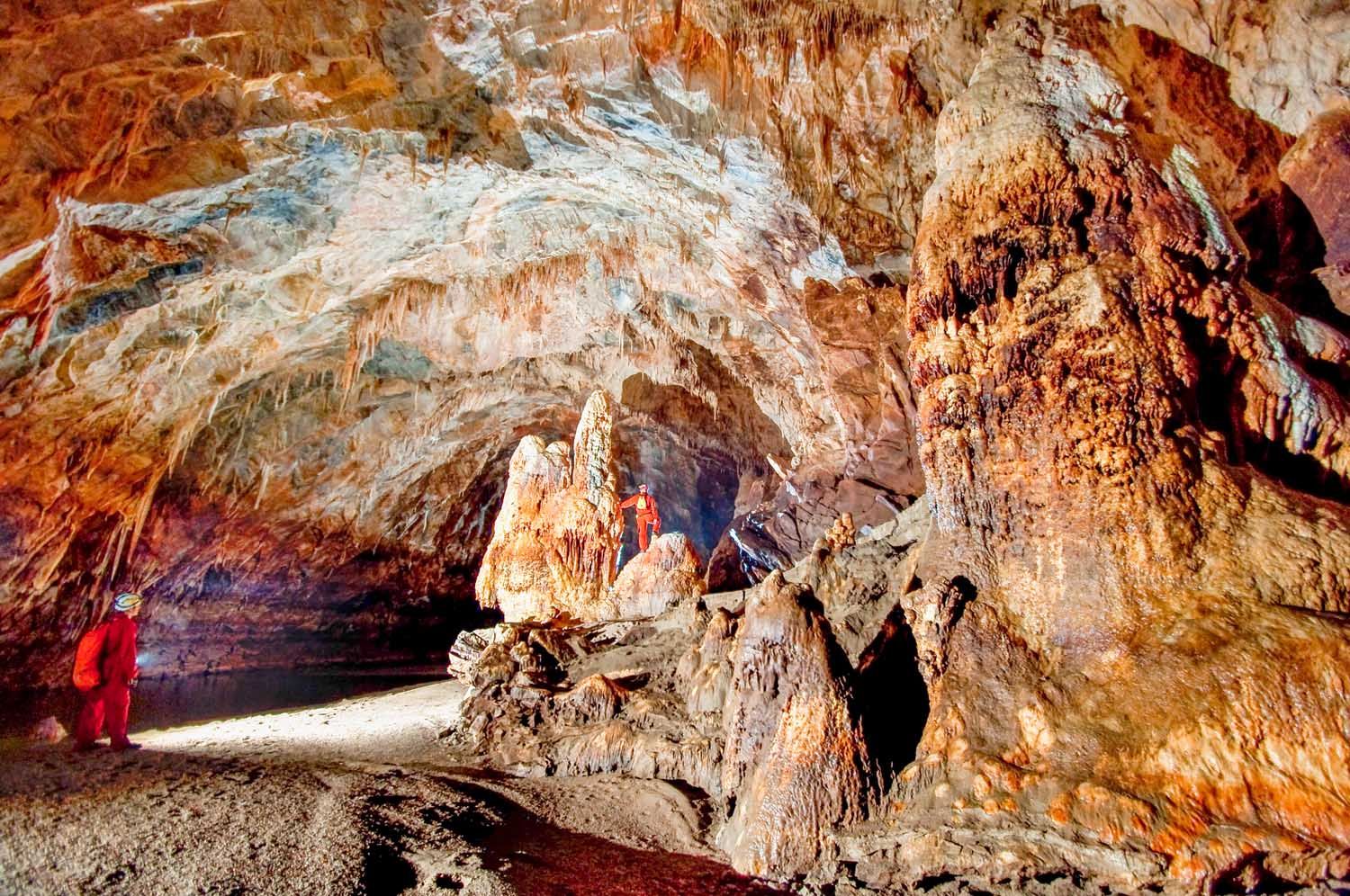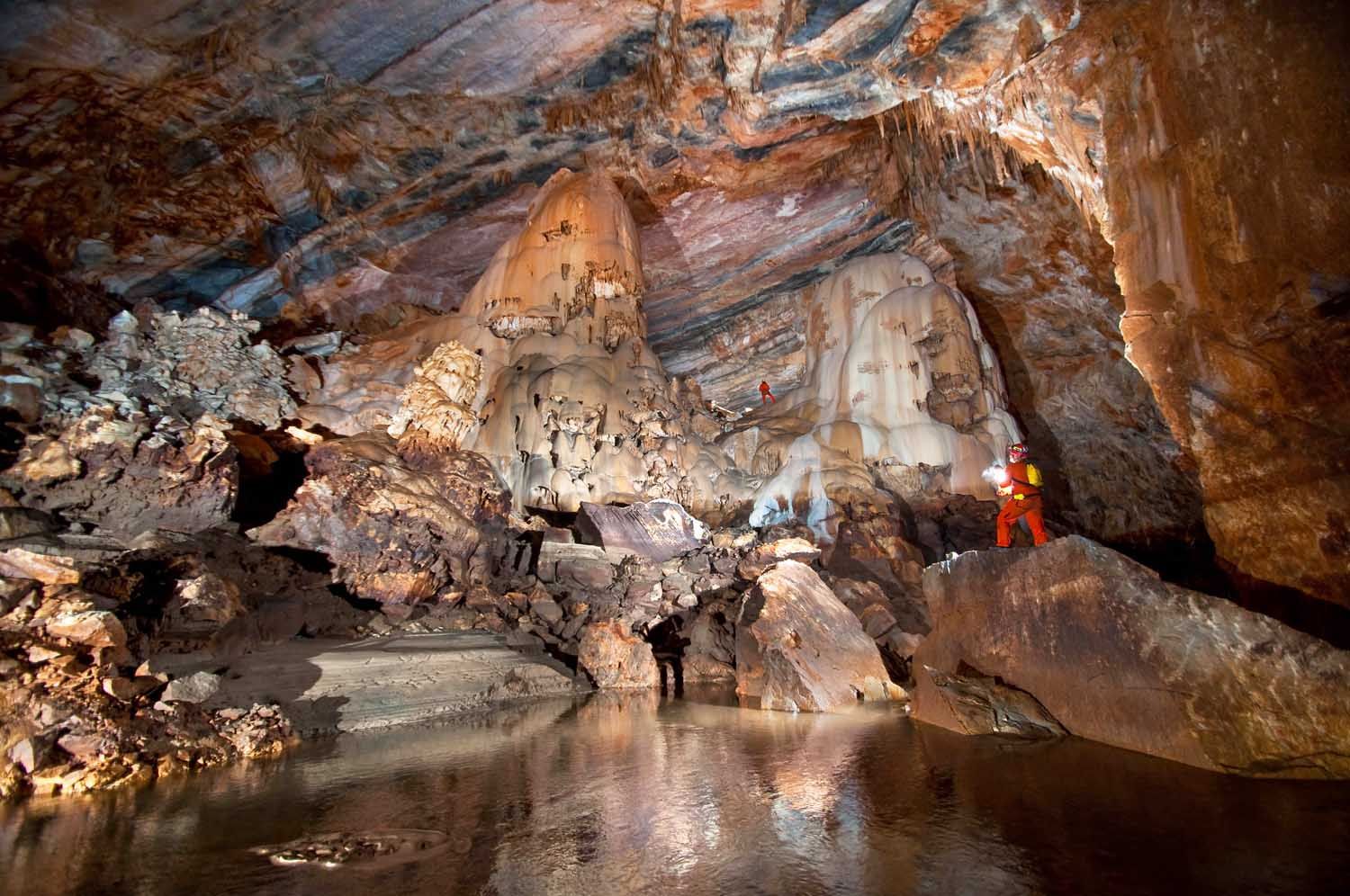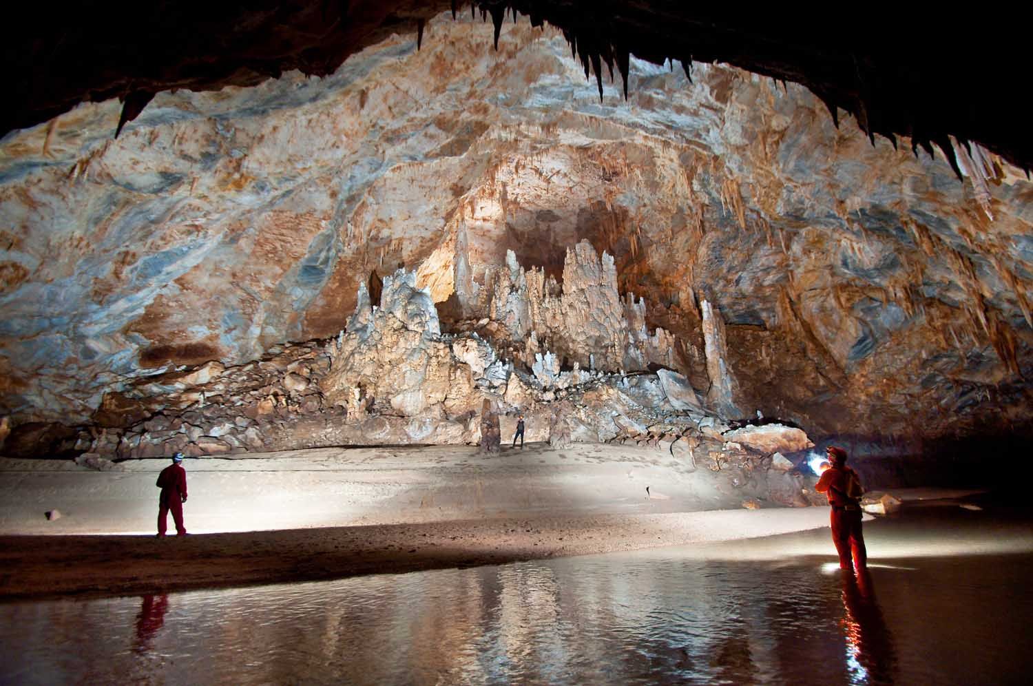 Είναι πραγµατικά εντυπωσιακό να βρίσκεσαι σε βάθος 6 χιλιοµέτρων, στο σηµείο που ενώνονται οι δύο ποταµοί. Η δεξιά κοίτη µετά από 300 µέτρα παρουσιάζει σιφώνι, το οποίο έχει µήκος 12 µέτρα και βάθος 7 µέτρα, κάτι που κάνει απαραίτητο τον καταδυτικό εξοπλισµό για την προσπέλασή του. Η αριστερή, η οποία φέρνει και το περισσότερο νερό, συνεχίζει µέχρι και τα 7.800 µέτρα µε πολλές κατακρηµνίσεις καταλήγοντας και αυτή σε σιφώνι. Οι περισσότερες σπηλαιολογικές αποστολές σήµερα έχουν επικεντρωθεί σε αυτά τα σιφώνια.