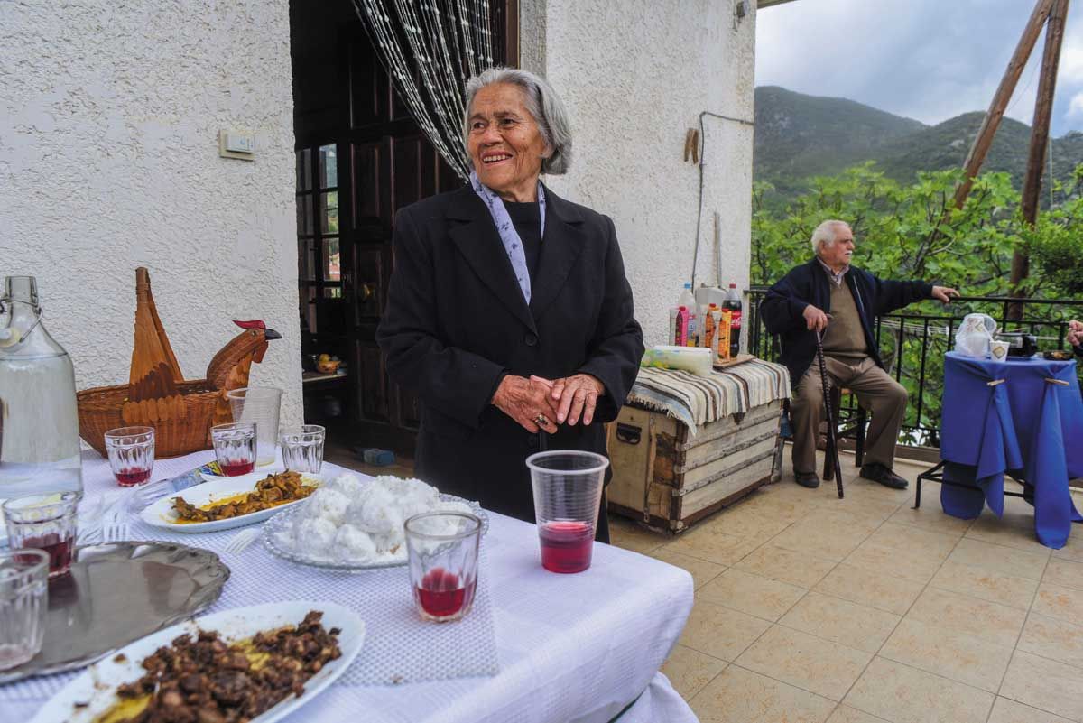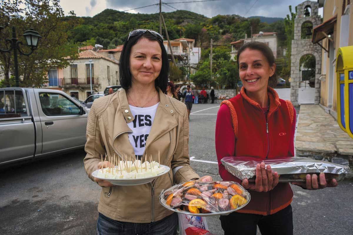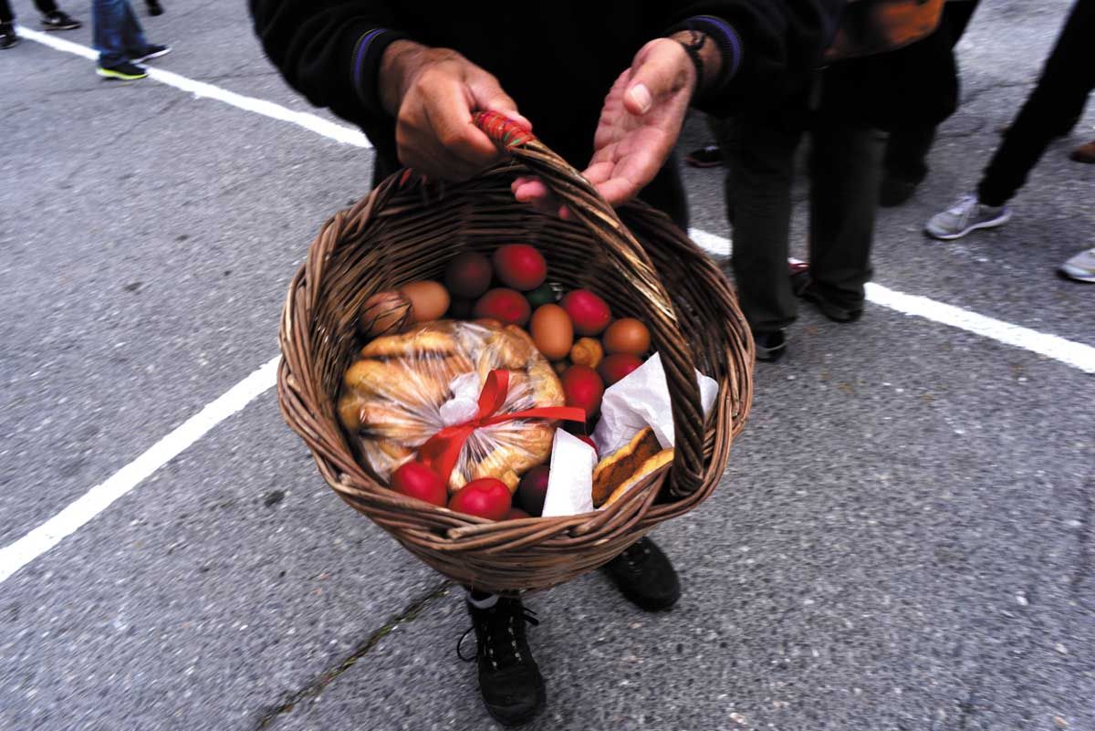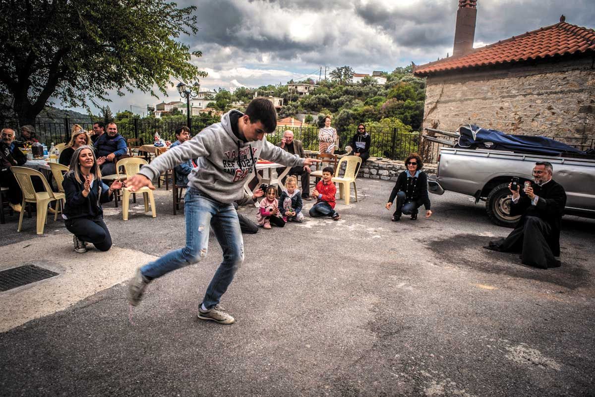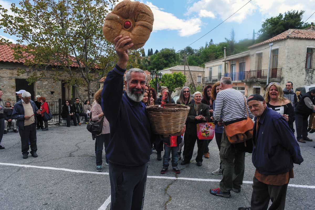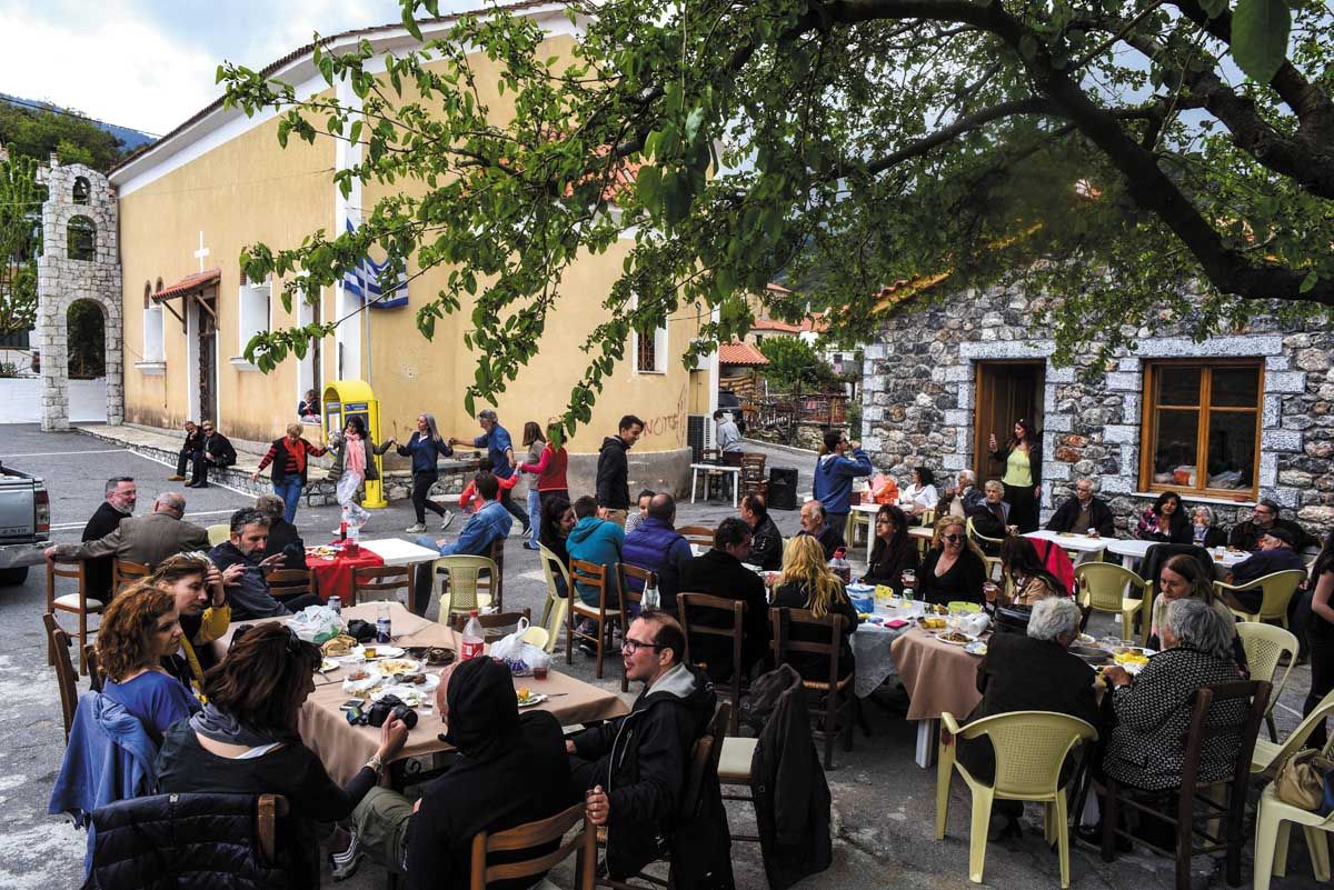 Αφού οι πασχαλινές κουλούρες, τα αυγά και τα κρασιά που προσφέρονται στη δημοπρασία δημοπρατηθούν σε αρκετά υψηλές τιμές, αμέσως μετά ο κόσμος κουβαλά ταψιά και κατσαρόλες από τα σπίτια του στην πλατεία. Κάποια σπιτικά μαγειρεύουν από το πρωί, ώστε το κοινό φαγοπότι να είναι πλούσιο. Τραπεζάκια στήνονται στην πλατεία που θεάζει ανατολικά προς τη χαράδρα του ποταμού Σμήνου και τα χωριά της πέρα Ρίζας, και βόρεια προς τις κορυφές του Ταϋγέτου. Οι νέοι μαζί με τον παπά στήνουν τα στερεοφωνικά μηχανήματα. «Κάποτε είχαμε το γραμμόφωνο», λέει ο Γιώργος, που σέρνει τον χορό. Το τρικούβερτο γλέντι τελειώνει αργά τα μεσάνυχτα...!