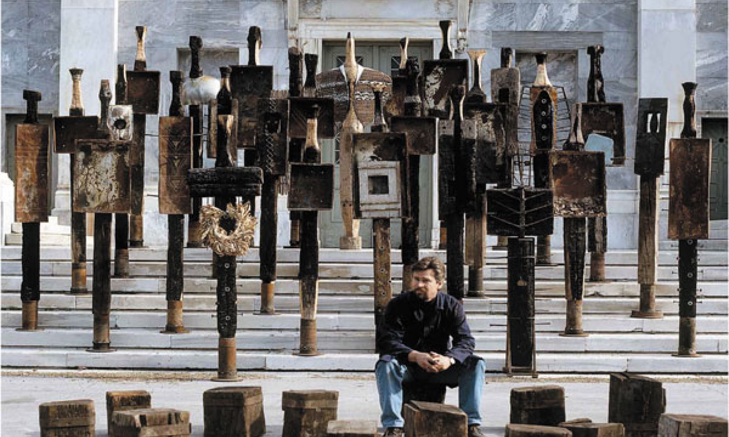 «Μάζεψα τ΄ αποκαΐδια με πόνο ψυχής από το καμένο Πολυτεχνείο κι έστησα σκιάχτρα να ξορκίσω τα κακά που πληθαίνουν γύρω μου. Φαντάσματα που τρομοκρατούν τα όνειρά μου κι αγριεύουν τον ύπνο μου. Σημάδια μιας πραγματικότητας που με μελαγχολεί και με εξουθενώνει. Έβγαλα το μαύρο απ’ την ψυχή μου, που χρόνια τώρα οι κάθε είδους εμπρηστές την ποτίζουν. Όρθωσα σύμβολα της παρακμής ενός κόσμου που αλληλοσπαράσσεται και μιας πατρίδας που μοιάζει να μην έχει κανένα μέλλον. Αναζητώ το μύθο σε μια εποχή που οι πολλοί κάνουν προσπάθεια να “απομυθοποιήσουν”, όπως λένε, την τέχνη, σαν φυγή από μια πραγματικότητα που δεν αντέχω. Κλείνομαι στον κόσμο μου από ανάγκη αναζητώντας άλλα πρότυπα, πιο ποιητικά, πιο μεγάλα, πιο μυστηριώδη. Μα η πεζή πραγματικότητα με προσγειώνει. Προσπαθώ να ξαναβρώ το μίτο από κάτι που μοιάζει άπιαστο, υπερβατικό, μαγικό. Σαν ειδωλολάτρης ορθώνω ξανά τα ξόανα ξορκίζοντας την κακή μοίρα αυτού του τόπου. Τα στολίζω με κάθε είδους τάματα και λογής στολίδια, ίδια πιστός, που περιμένει τη λύτρωσή του. Στήνομαι με τις ώρες μπροστά τους αναζητώντας μάταια ένα νεύμα για καλές ειδήσεις. Μαζεύω τ’ αποκαΐδια με απέραντη θλίψη από μια χώρα που καίγεται. Καίει τα πνευματικά της ιδρύματα και ό,τι σημαντικό της έχει απομείνει κι όλοι καμώνονται πως δε συμβαίνει τίποτα. Αναρωτιέμαι τι νόημα έχει η φτωχοτέχνη μας. Πόσους ενδιαφέρει αν δεν μπορεί γι’ αυτά κάτι να πει, να κάνει κάτι. Κι εμείς –για να παραφράσω τον ποιητή– κλεισμένοι στον κουτσομπολίστικο μικρόκοσμό μας, αλλοτριωμένοι, γεμάτοι κακίες και πείσματα, τέλεια "ιδιώτες" περί άλλων τυρβάζουμε… Ναι, τα φαντάσματα αυτά με εκφράζουν. Είναι η δική μου αντίδραση σ’ ένα έθνος που μοιάζει υπνωτισμένο. Θέλω να φωνάξω πως δεν μπορώ άλλο να ζω ανάμεσα σ’ αδιάφορους, εμπρηστές και οικοπεδοφάγους. Τον τόπο αυτόν τον πονάω. Γνωρίζω το μεγαλείο και το δράμα του, δεν είμαι ρηχοφυτεμένος, κι ας ξέρω πως οι άγριοι δεν σκιάζονται, ούτε πως οι εμπρηστές θα σταματήσουν. Παρ’ όλα αυτά στις ατέλειωτες ώρες της μοναξιάς μου αναρωτιέμαι γιατί αρπάχτηκα από αυτά τα σημάδια της καταστροφής. Μήπως όλα αυτά έγιναν για να απαλλαγώ πρώτα και κύρια απ’ τις δικές μου τύψεις; Γιατί ποιους να καταγγείλω; Είμαστε πολλοί, πάρα πολλοί συνένοχοι σ’ αυτόν τον τόπο».