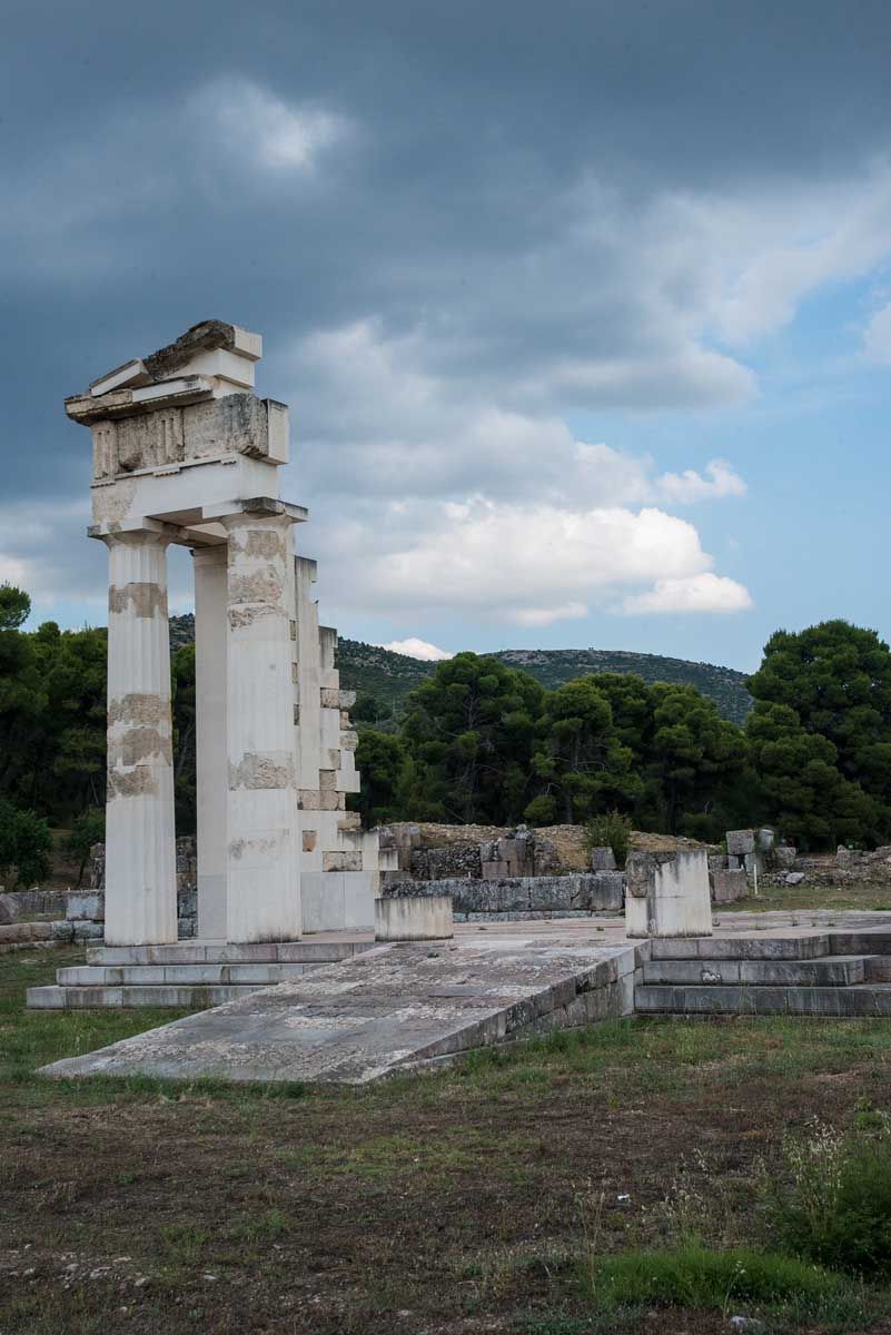 Στον λόφο Κυνόρτιον, πίσω από το ξακουστό θέατρο της Επιδαύρου, στα βορειοανατολικά, ήδη από την προϊστορική εποχή υπήρχε ιερό, στο οποίο λατρευόταν μια γυναικεία θεότητα που συνδεόταν με την ίαση. Στην ίδια θέση ιδρύθηκε στην αυγή της αρχαϊκής εποχής ιερό αφιερωμένο στον Απόλλωνα, θεό με θεραπευτικές ιδιότητες, που λατρευόταν εδώ ως Απόλλωνας Μαλεάτας. Η λατρεία τού κυρίως θεραπευτή θεού, του Ασκληπιού, που η μυθική παράδοση τον παρουσιάζει ως αυτόχθονα γιο του Απόλλωνα και της εγγονής του βασιλιά Μάλου της Επιδαύρου, της Κορωνίδας, καθιερώθηκε κατά τον 6ο αι. π.Χ. Σύμφωνα με τον μύθο, ο Απόλλωνας, μετά την ένωσή του με την Κορωνίδα, φεύγει για τους Δελφούς αφήνοντας πίσω ένα λευκό κοράκι. Όταν εκείνη ερωτεύεται τον Ίσχυ, γιο του Έλατου, εκείνος (ή η αδερφή του Άρτεμη) σκοτώνει με βέλος την Κορωνίδα. Ο Ερμής όμως προλαβαίνει και βγάζει από την κοιλιά της το παιδί που είχε συλλάβει από τον αδερφό του και το εμπιστεύεται στον κένταυρο Χείρωνα. Ο Απόλλωνας καταριέται το λευκό κοράκι, που γίνεται για πάντα μαύρο… Ο αριθμός των προσκυνητών, που ολοένα αυξανόταν, δημιούργησε την ανάγκη ίδρυσης ενός μεγαλύτερου ιερού, ένα χιλιόμετρο περίπου νοτιοδυτικά του Κυνόρτιου. Τα δύο ιερά εξελίχθηκαν παράλληλα, με την επίσημη ονομασία «Ιερόν Απόλλωνος Μαλέατα και Ασκληπιού»: ο Απόλλωνας ήταν η πνευματική πηγή της θεραπείας και ο Ασκληπιός ένα είδος «μεσολαβητή», που κινείται μεταξύ δύο κόσμων, εκείνου των θεών κι εκείνου των ανθρώπων… Στον νέο ιερό χώρο βρισκόταν ο δωρικός ναός του Ασκληπιού, του οποίου είναι σήμερα ορατή μόνο η θεμελίωση. Ο ναός, που περιβαλλόταν από κίονες (περίπτερος), αποτελούνταν από πρόναο και σηκό με εσωτερική κορινθιακή κιονοστοιχία σε σχήμα Π. Οι επιγραφικές μαρτυρίες μάς δίνουν την πληροφορία ότι ο αρχιτέκτονας του ναού λεγόταν Θεόδοτος. Μέσα στον ναό δέσποζε το χρυσελεφάντινο άγαλμα του θεού, έργο του Πάριου γλύπτη Θρασυμήδη. Στο ανατολικό αέτωμα εικονιζόταν η άλωση της Τροίας και στο δυτικό η Αμαζονομαχία. Γύρω από τον ναό είχαν οικοδομηθεί τα υπόλοιπα κτίσματα που συνδέονταν με τη λατρεία του θεού και την τελετουργία της ίασης: το Άβατο, όπου γινόταν η εγκοίμηση των ασθενών, η Θόλος ή Θυμέλη, ένα κυκλικό περίστυλο οικοδόμημα όπου στεγαζόταν η μυστηριακή χθόνια λατρεία του Ασκληπιού, και το κτιριακό συγκρότημα του Τελετουργικού Εστιατορίου, που οικοδομήθηκε κατά την ελληνιστική περίοδο. Σε αυτό το συγκρότημα υπήρχαν το κυρίως κτίριο του Εστιατορίου, το μνημειώδες Πρόπυλό του, που λίγα χρόνια αργότερα μετατράπηκε σε ναό της Υγείας, το Ωδείο στον χώρο της περίστυλης αυλής και μια Κρήνη στα νοτιοανατολικά, καθώς το νερό ήταν απαραίτητο για οποιαδήποτε ιαματική διαδικασία. Ο κεντρικός χαρακτήρας της λατρείας ίσως διαδραματιζόταν εδώ καθώς, σύμφωνα με τη γραπτή παράδοση, υπήρχε παρουσία του Ασκληπιού (Θεοφάνια) στα τελετουργικά γεύματα, που προσέφεραν δύναμη, υγεία κι ελπίδα στους προσκυνητές.