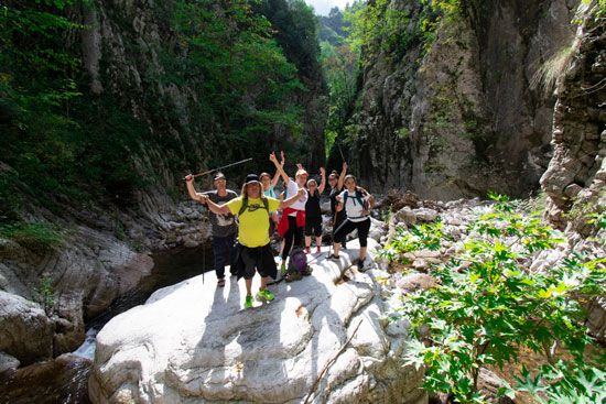 Μπαίνουμε στα τετράτροχα αγρίμια της Pindos Hawks και ξεκινάμε. Κινούμαστε δίπλα στον Αγραφιώτη ποταμό. Πολύβουος και ορμητικός. Ανεβαίνουμε όλο και ψηλότερα, περνώντας από ξύλινες γέφυρες και πυκνό ελατόδασος. Φτάνουμε στα 1.650 μέτρα υψόμετρο. Γύρω μας αμέτρητες κορυφές. Απρόσιτα, απάτητα, αχαρτογράφητα. Τα Άγραφα. Νιώθουμε, ότι αν τεντώσουμε τα ακροδάχτυλά μας, θα αγγίξουμε τα πουπουλένια σύννεφα πάνω από τα κεφάλια μας. Το κρύο τσουχτερό. Ξαναμπαίνουμε γρήγορα στα αυτοκίνητα και κατηφορίζουμε προς το Ασπρόρεμα. Ένας εγκαταλελειμμένος οικισμός, που σήμερα πια δεν ζει κανείς εκεί. Κατεβαίνουμε και συναντούμε μια γιαγιά, που έχει έρθει να δει το μποστανάκι της, λίγα κολοκύθια και πιπεριές. Μοναδική της παρέα αποτελεί ένα σκιάχτρο, κρεμασμένο από ένα δέντρο, να αγναντεύει το φαράγγι, που ετοιμαζόμαστε να κατέβουμε. Οπλιζόμαστε με μπατόν πεζοπορίας από τον Παναγιώτη, ρίχνουμε στην πλάτη τα σακίδια και ξεκινάμε. Η κατάβαση είναι απότομη και πετρώδης. Πέτρα στην πέτρα, βράχο στον βράχο, άλλοτε σκαλισμένα από τον άνθρωπο κι αλλού από τη φύση. Αφήνουμε πίσω μας ερείπια της ανθρώπινης παρουσίας. Κάποτε εδώ ζούσαν 30 οικογένειες. Από το μονοπάτι που βαδίζουμε περνούσαν τα γαϊδουράκια και τροφοδοτούσαν το χωριό, όντας η μόνη τους επικοινωνία με τον υπόλοιπο κόσμο. Συνεχίζουμε την κατάβαση μαγεμένοι από τη μυρωδιά της φλαμουριάς, ενός φυλλοβόλου δέντρου, από όπου παίρνουμε το τίλιο. Προσπερνάμε προσκυνητάρια, πέτρινα ή σιδερένια, ταπεινά ενθυμήματα ανθρώπων αγαπημένων, προσευχές καρφωμένες στον βράχο. Με ένα τελευταίο σάλτο εισερχόμαστε στην κοίτη του ποταμού. Το νερό τρέχει με ταχύτητα και ήχο αλλά έχει αφήσει χώρο και για εμάς. Περπατάω πλάι του, μέσα στην κοίτη γραπώνοντας με το ένα χέρι το μπατόν και με το άλλο τεράστιους βράχους. Πότε πότε χρειάζεται να φτιάξουμε μια ανθρώπινη αλυσίδα χεριών, ώστε να περάσουμε στην άλλη μεριά και να συνεχίσουμε πάνω στο ίχνος του μονοπατιού. Τεράστια πλατάνια και πουρνάρια μας συντροφεύουν, βάζοντας και πράσινο χρώμα στην πολύχρωμη παλέτα της φύσης. Σε μερικά σημεία, που η ροή του ποταμού κατεβαίνει απότομα, το νερό μαζεύεται ανάμεσα σε βράχους, αφρισμένο και θορυβώδες, σαν να θύμωσε με την παρουσία μας. Τόσο που δεν μπορώ να ακούσω τον διπλανό μου. Πότε κάτω από τον ζεστό ήλιο και πότε κάτω από τη σκιά του βουνού, συνεχίζουμε την πορεία μας, μιμούμενοι τους ανθρώπους, που για δεκαετίες έκαναν το ίδιο δρομολόγιο. Ξαφνικά, η κοίτη στενεύει και ο χώρος που μένει για εμάς είναι απειροελάχιστος. Δίπλα μας ορθώνονται αγριωποί γκρεμοί. Είναι ξεκάθαρο πως είμαστε μέσα στο φαράγγι και πρέπει να γίνουμε αμφίβιοι.