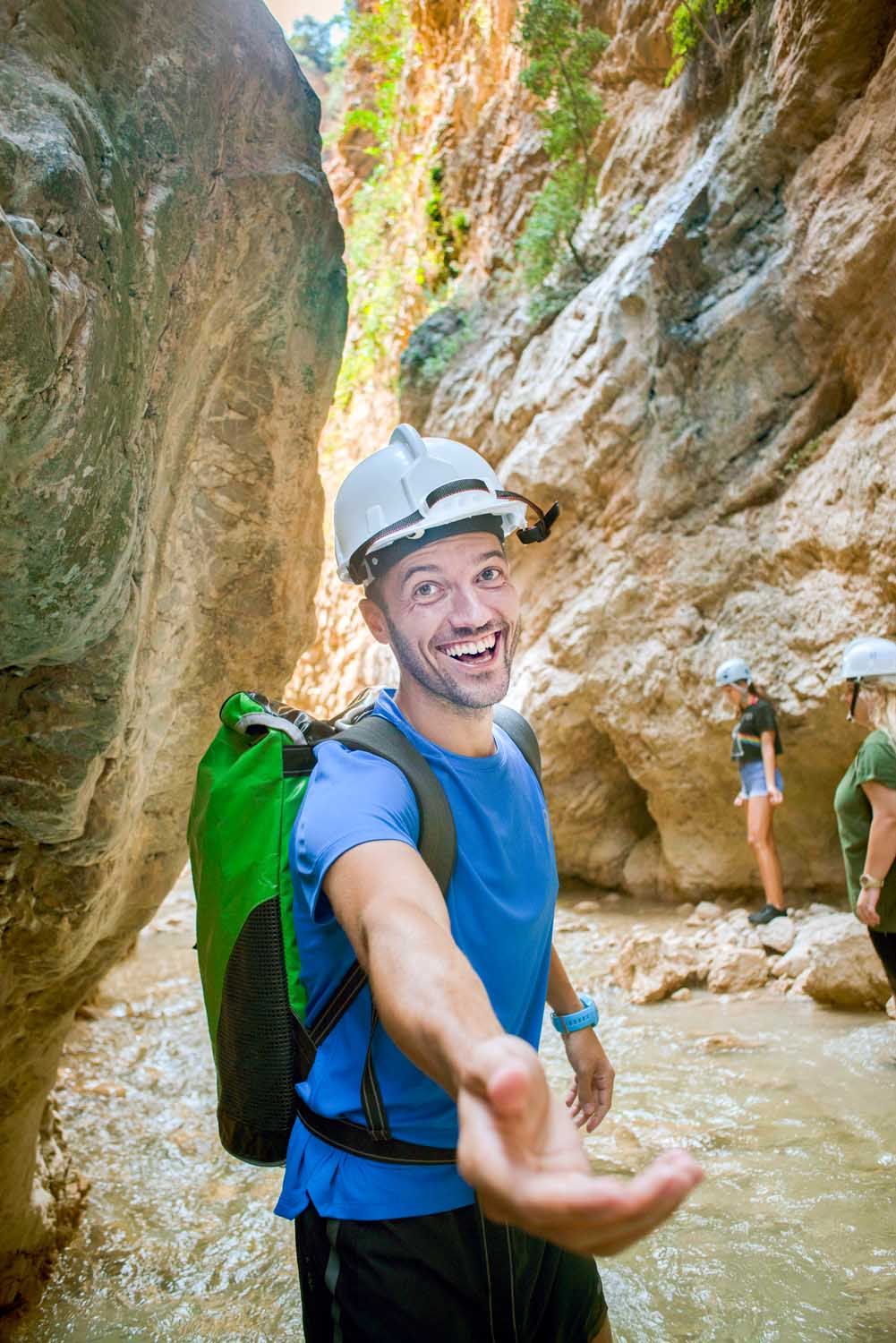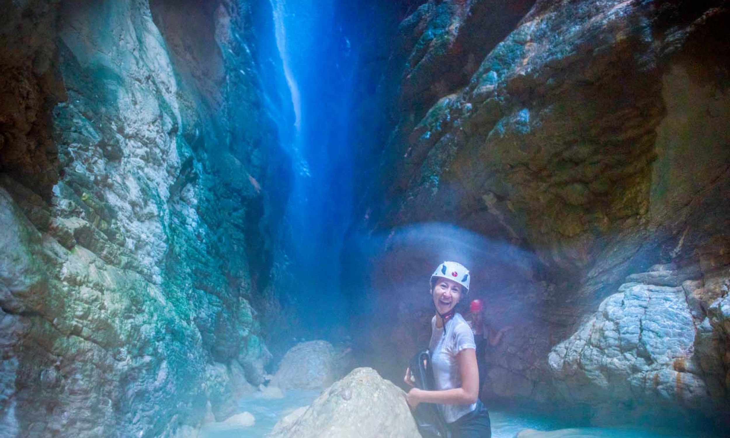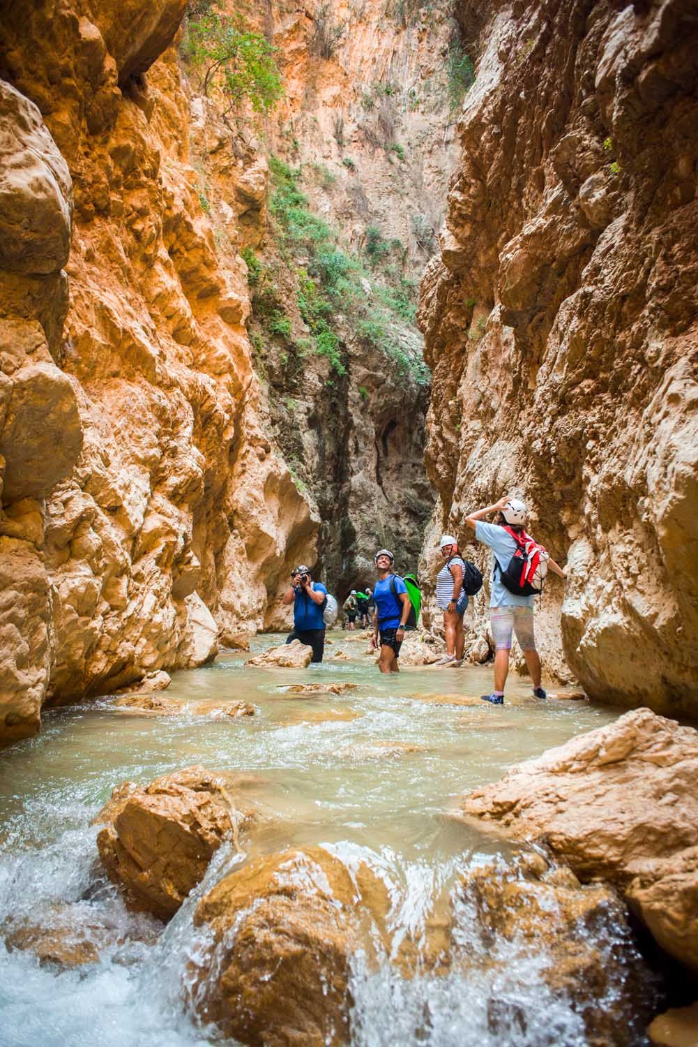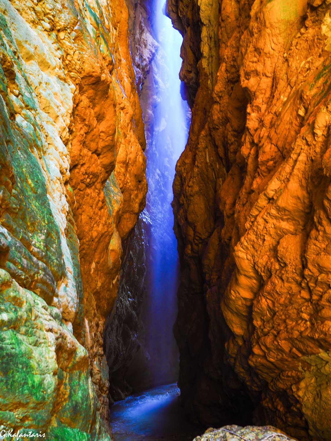 Ο δεύτερος οδηγός µας, Ηλίας Τσατσαρώνης, µοιράζει κράνη και οδηγίες πρώτης ανάγκης: Αν µας ακούσετε να φωνάζουµε «πέτρα», τότε αντί να κοιτάξουµε προς τα πάνω, µαζεύουµε τους ώµους και τα χέρια µπροστά για να τα προστατεύσουµε. Με την όρεξη ανοιχτή για περισσότερη περιπέτεια, βυθιζόµαστε στο απέραντο µπλε του φαραγγιού. Μας καταβρέχουν µικροί καταρράκτες που έρχονται κατευθείαν από τα ύδατα της Στυγός - όπου σύµφωνα µε τον µύθο, η Θέτις βάφτισε τον γιο της Αχιλλέα µε το αθάνατο νερό για να γίνει άτρωτος, πιάνοντάς τον από την πτέρνα που τελικά αµέλησε να πλύνει.