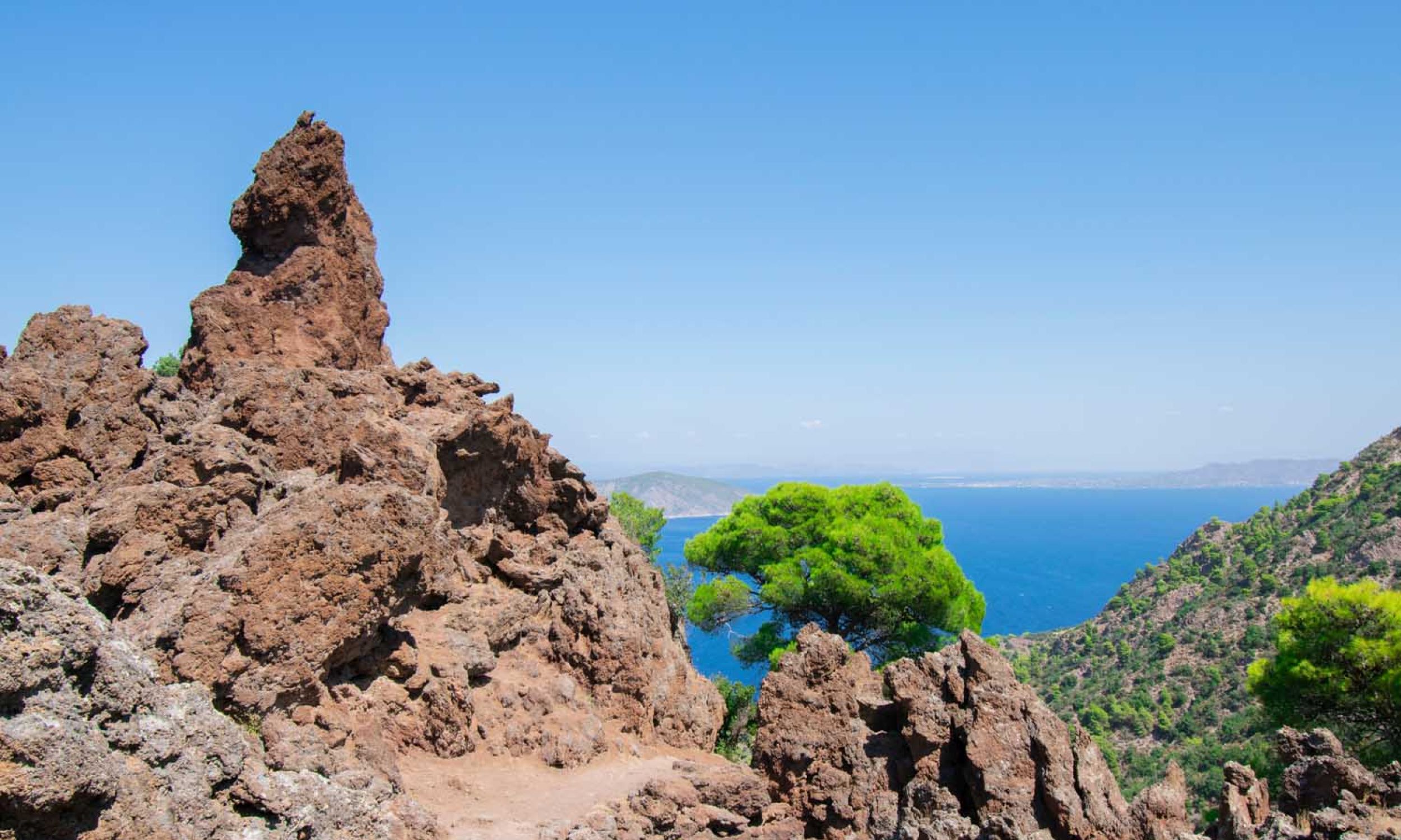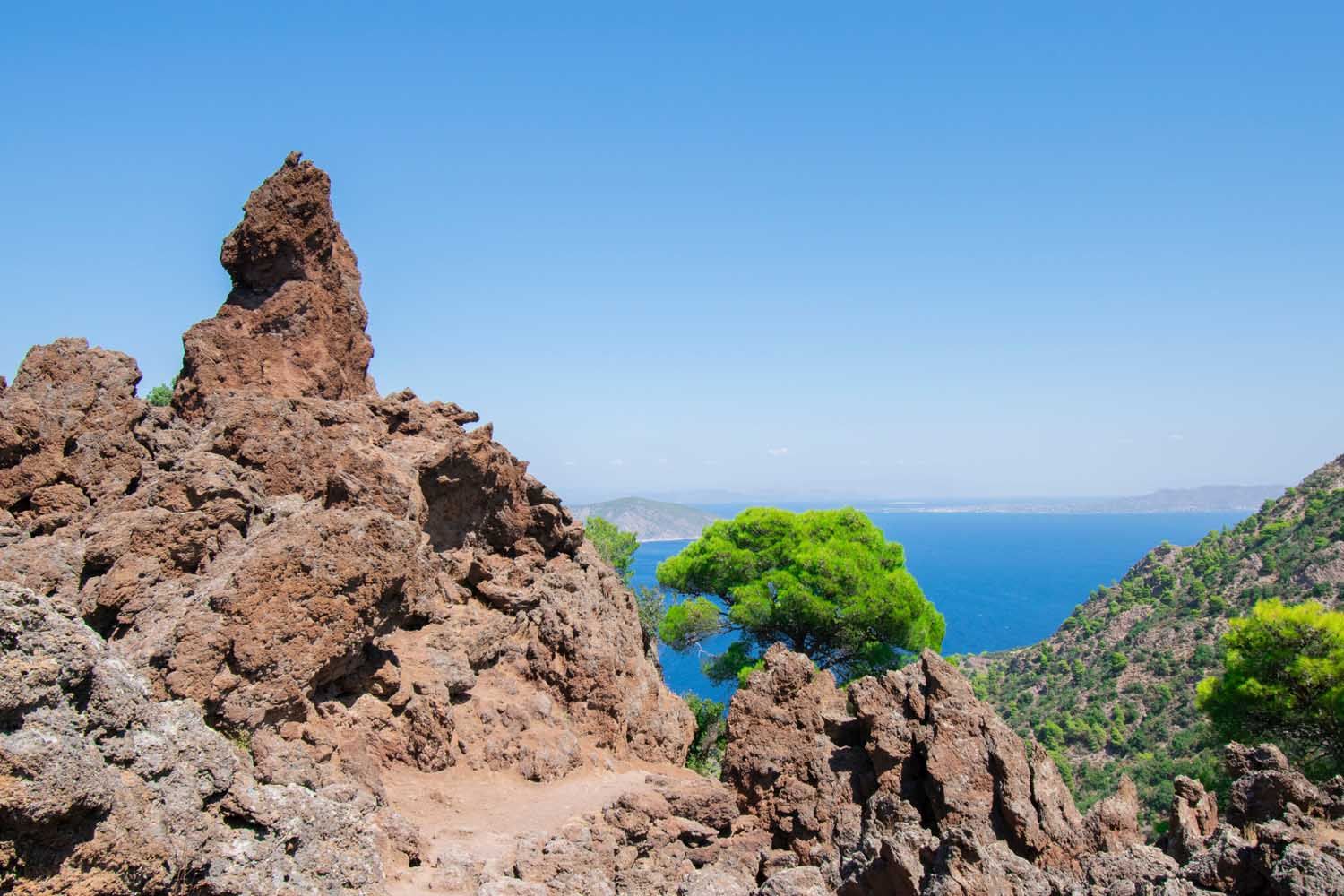 Τραβάµε χειρόφρενο. Φτάσαµε. Ο Σπύρος µας προµηθεύει µε νερό και µπατόν πεζοπορίας και ξεκινάµε. Μας περιβάλλουν αµέτρητα πεύκα που έχουν στρώσει µπροστά µας ένα κόκκινο χαλί από πευκοβελόνες. Κάθε φορά που κάνω και ένα βήµα, ακούω να σπάνε και µερικές δεκάδες από αυτές. Έντονη µυρωδιά της φηµισµένης ρίγανης των Μεθάνων γαργαλά τη µύτη µου. ∆ιανύουµε µερικά ανηφορικά µέτρα, πέτρα στην πέτρα, που αναγκάζουν τις πρώτες σταγόνες ιδρώτα να κυλήσουν στο µέτωπό µου. Φτάνοντας, όµως, στην κορυφή αποζηµιώνοµαι. Όλος ο Σαρωνικός κόλπος απλώνεται µπροστά στα µάτια µου και νιώθω ότι κοιτάζω έναν τρισδιάστατο χάρτη, ότι όλο αυτό δεν είναι αληθινό. Στα δεξιά µου, µπροστά µπροστά το Αγκίστρι και πίσω του η Αίγινα. Στο βάθος, τα παράλια της Αττικής και το απλωµένο σεντόνι από τσιµεντένια σπίτια µού θυµίζουν πόσο τυχερός είµαι που ξέφυγα,έστω για λίγο. Στα αριστερά µου, η ανατολική Πελοπόννησος, άγρια και βραχώδης. Μια παλέτα χρωµάτων. Το καφέ χρώµα της λάβας µε το κόκκινο των ηφαιστειακών βράχων, το πράσινο των διάσπαρτων πεύκων µεγάλης ηλικίας και το γαλάζιο της θάλασσας και του ουρανού.