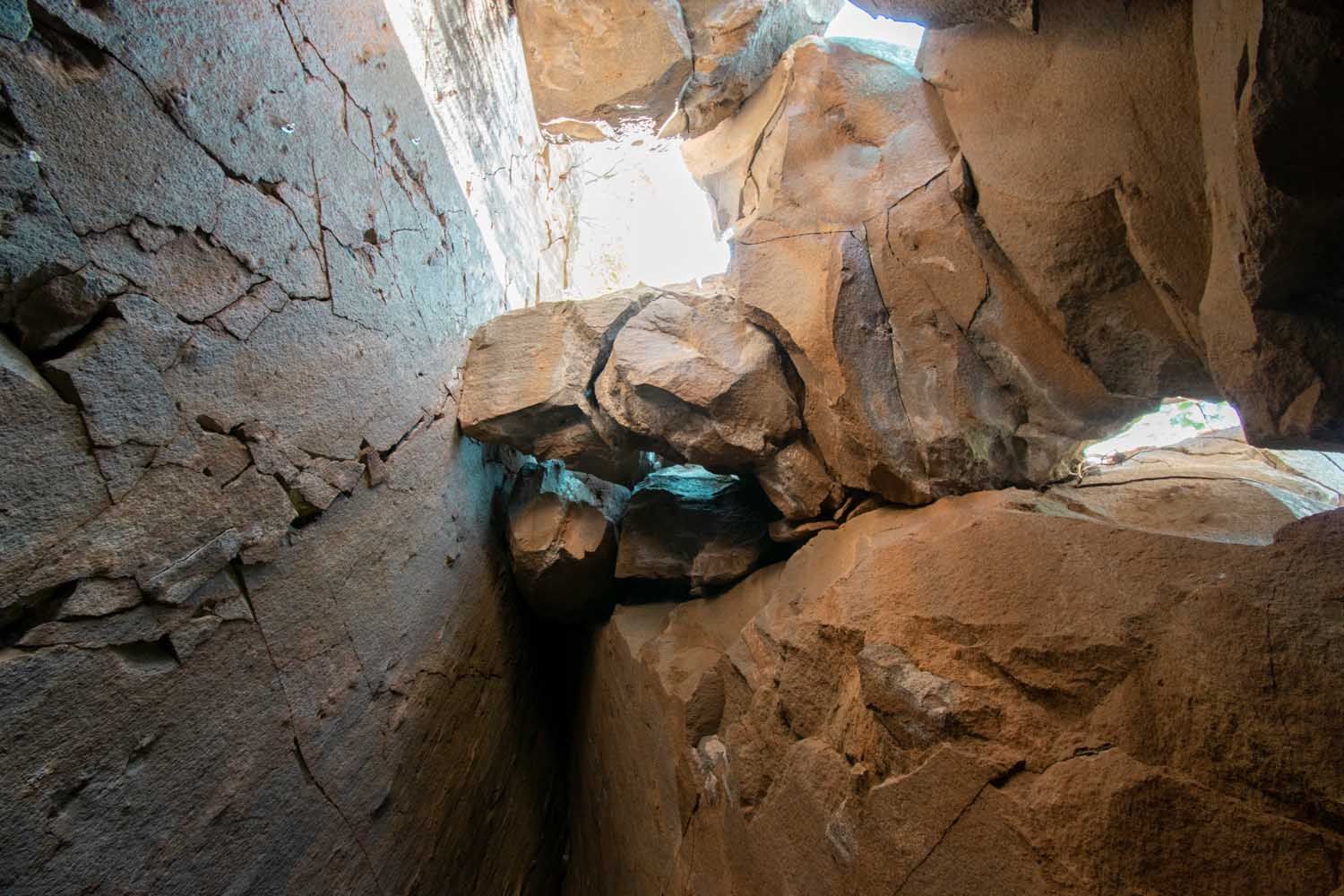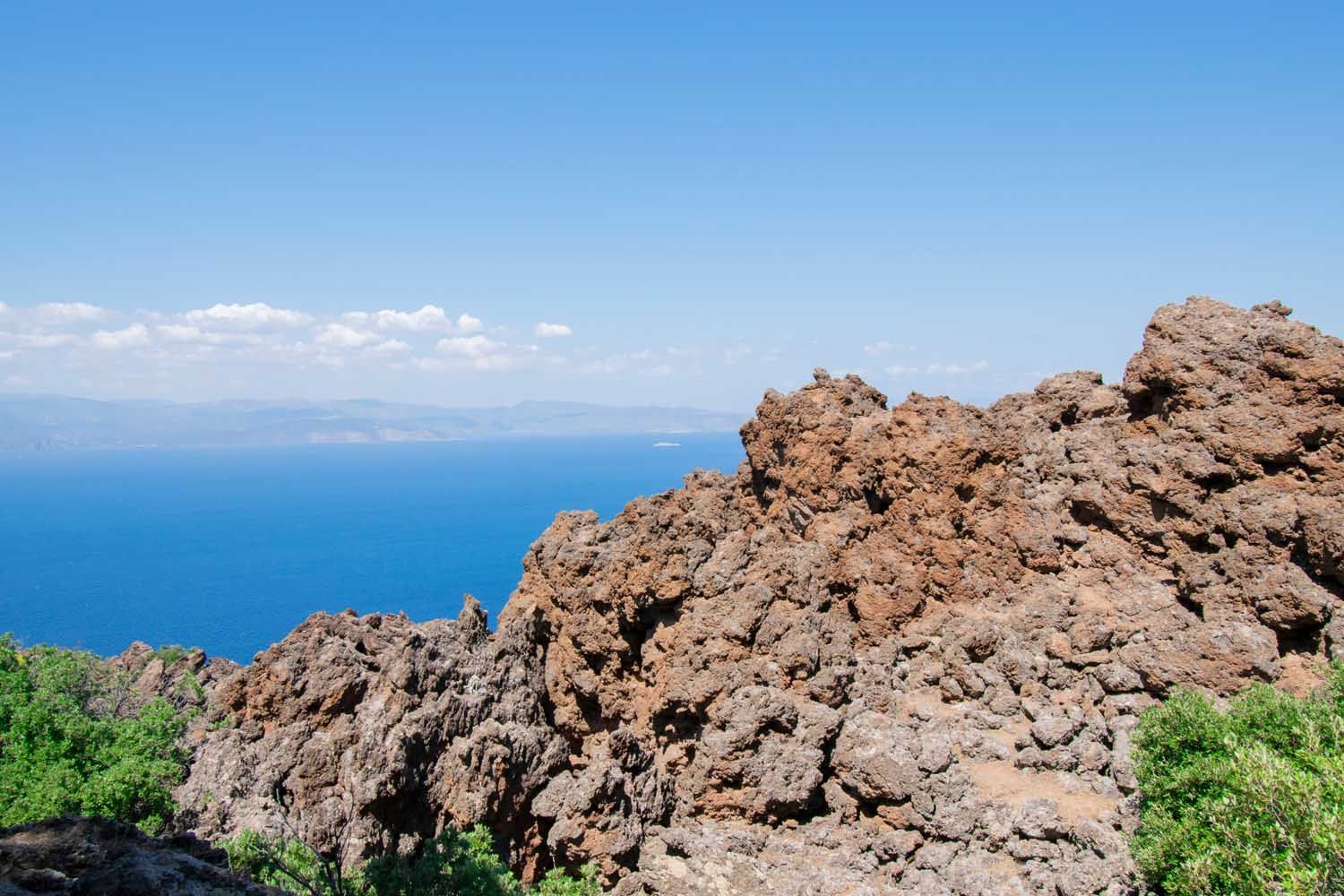 Ολόκληρη η χερσόνησος κρύβει 30 κρατήρες κι εµείς θα επισκεφτούµε αυτόν κοντά στη Καµένη Χώρα. Ο Σπύρος µου τονίζει, πως το µονοπάτι που βαδίζουµε, ανήκει σε ένα δίκτυο ορειβατικών - πεζοπορικών µονοπατιών που ένωναν τα χωριά του τόπου µε σκοπό την εξυπηρέτηση για µετακίνηση και µεταφορά αγαθών από τους κατοίκους. Τώρα πια, τα περισσότερα έχουν κλείσει, αλλά µε πρωτοβουλία των ντόπιων κάποια παραµένουν ανοιχτά. Η διαδροµή είναι εύκολη και µικρή. Σαν χέλι ξεδιπλώνεται και µας οδηγεί σε κοκκινωπούς εντυπωσιακούς βράχους, που φαίνονται έτοιµοι να φύγουν από τη θέση τους. Η πανοραµική θέα σου κόβει την ανάσα. Η τελευταία έκρηξη του ηφαιστείου έγινε το 1700, υποθαλάσσια. Εµείς τώρα, πατάµε την κορυφή του στα 410 µέτρα υψόµετρο όπου βρίσκουµε µια εντυπωσιακή σπηλιά. Οι ντόπιοι την αναφέρουν ως «κρατήρα», αλλά στην πραγµατικότητα δεν είναι, όπως µου υπογραµµίζει ο Στέλιος. Καθώς µπαίνουµε µέσα, εντύπωση µου προκαλούν οι λείοι τοίχοι που σαν κώνος καταλήγουν σε τεράστιους βράχους. Κρέµονται πάνω από τα κεφάλια µας κιανάµεσά τους ανοίγµατα, όπου διακρίνουµε το φως του ουρανού.