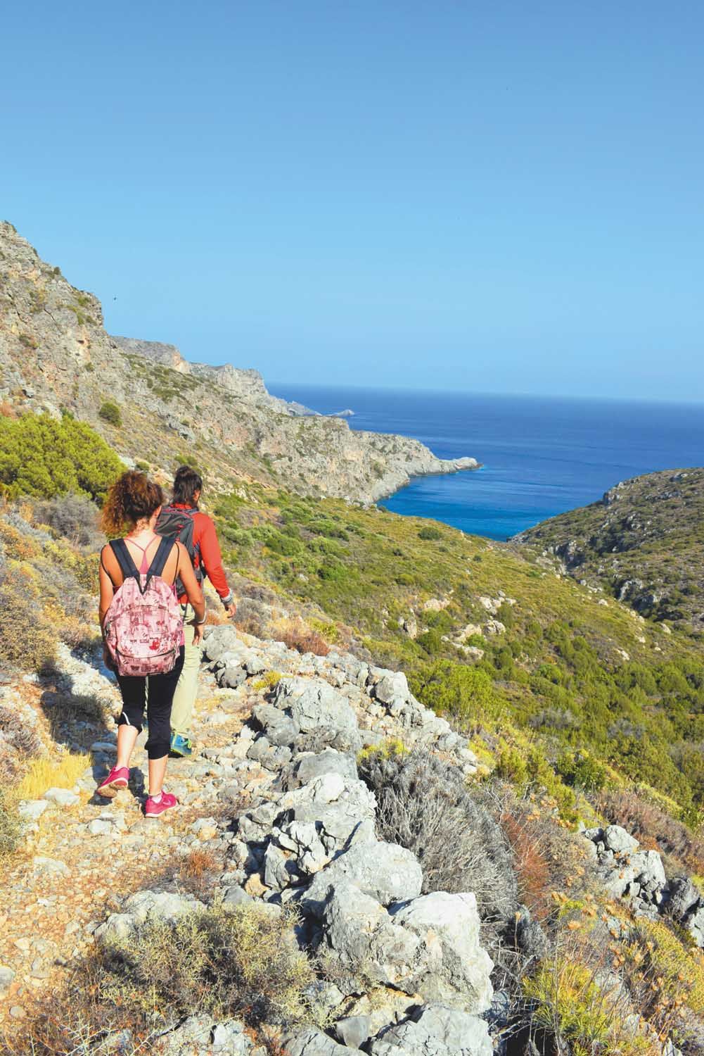 Όλα είναι έτοιμα. Φτάνω στη Νεάπολη και μπαίνω στην «Πορφυρούσα», το πλοίο που ενώνει καθημερινά τα Κύθηρα με την Πελοπόννησο. Μαθαίνω από τον καπετάνιο πως το γλυκό όνομα του πλοίου είναι η πιο παλιά ονομασία των Κυθήρων. Οι Φοίνικες επεξεργάζονταν τα άπειρα κοχύλια που κείτονταν διάσπαρτα στις παραλίες του νησιού και παρήγαν την πορφύρα, το βαθύ κόκκινο χρώμα που συνδέθηκε με βασιλιάδες και ευγενείς στο πέρασμα των χρόνων. Το ταξίδι κρατάει λίγο περισσότερο από μία ώρα και να μπροστά μου το Διακόφτι, το λιμάνι του νησιού, ενώ πιο πίσω αχνοφαίνεται το «Nordland», το μισοβυθισμένο καράβι – τουριστική ατραξιόν πια και ένα από τα καλύτερα diving spots στην Ελλάδα. Η φασαριόζικη αποβίβαση των επισκεπτών δεν προμηνύει τις ήσυχες μέρες που θα ακολουθήσουν. Η τσιμεντένια γέφυρα που ενώνει το λιμάνι με την ενδοχώρα με οδηγεί όλο και πιο ψηλά. Μικρογραφία της Ελλάδας το νησί. Άσπρα σπίτια με μπλε παράθυρα, πράσινο να ξεπροβάλλει από τις ρεματιές, ορεινοί όγκοι και βραχώδεις απόκρημνες παραλίες σε οδηγούν στη θάλασσα. Στον ξενώνα «Απλυνόρι» στα Μητάτα με περιμένει ο κ. Γιάννης, ο φιλόξενος ιδιοκτήτης του. Με γοητεύουν οι ιστορίες του, μου μιλά για το χωριό, τους «συκοσταφυλάδες», τους πρώτους τουρίστες του νησιού πριν από μισό αιώνα, οι οποίοι έτρωγαν τους καρπούς των δέντρων που έβρισκαν στις άκριες των δρόμων. «Ανακάλυψα ξανά τον τόπο μου» μου εξηγεί, καθώς τον ρωτώ για τα μονοπάτια. Κάθε Κυριακή, «βρέξει χιονίσει» όπως μου αναφέρει χαρακτηριστικά, μαζί με άλλους Τσιριγώτες θα περπατήσουν πάνω στους πρώτους επικοινωνιακούς διαύλους του νησιού.