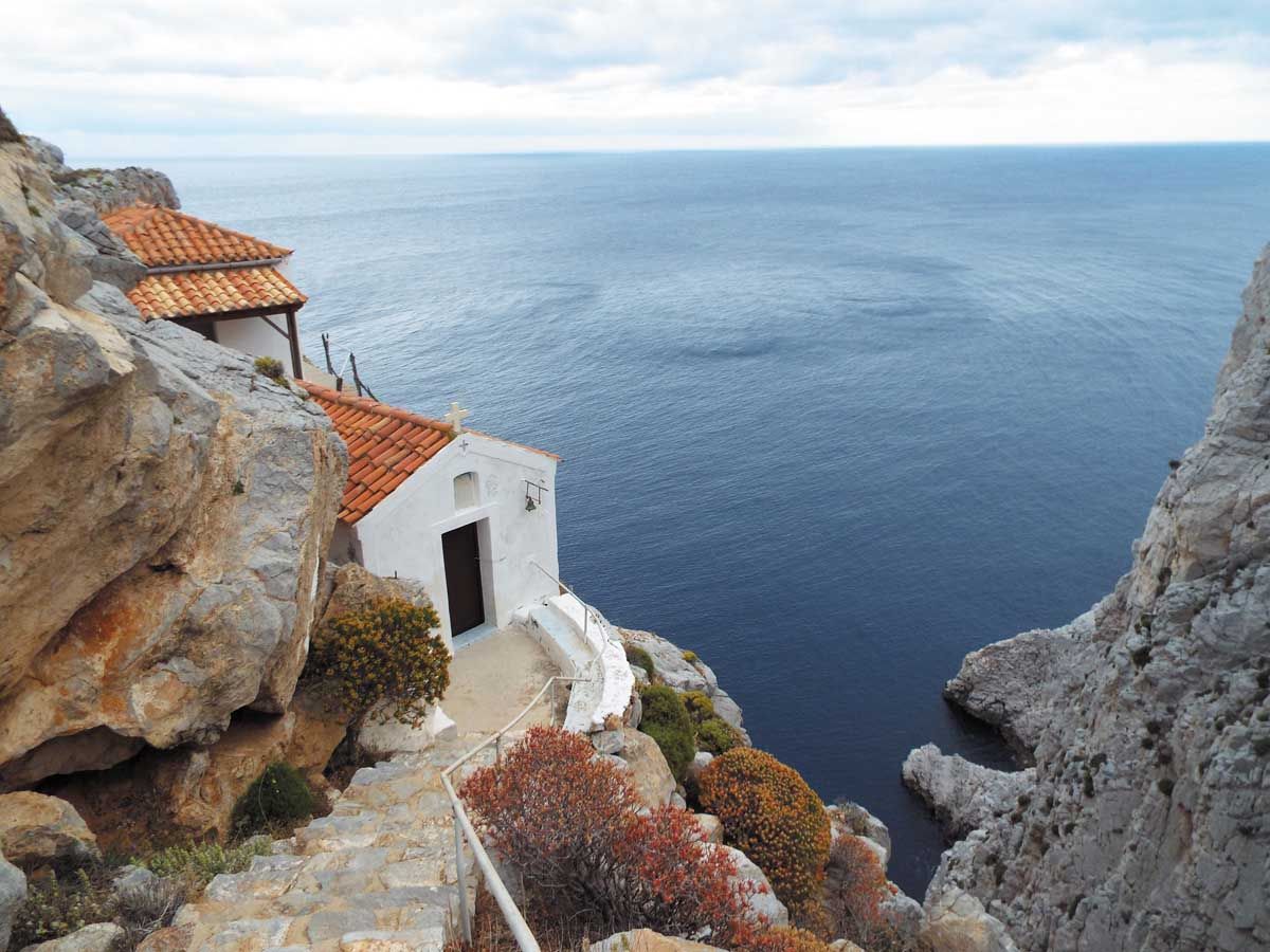 Σε αυτό το σημείο αποφασίζω, μιας και βρίσκομαι για πρώτη φορά σε αυτά τα μέρη, να επισκεφτώ τη Μονή της Ζούρβας. Το τοπίο παίρνει ξανά την άγρια ομορφιά του βράχου και της πέτρας. Καθώς πλησιάζω στο μοναστήρι, παρατηρώ το κατάλευκο λιτό αλλά όμορφο παραδοσιακό υδραίικο κτίριο της μονής. Χτυπώ την παλιά σιδερένια εξώπορτα, δεν περιμένω πολύ, την ακούω να ανοίγει αργά και βαριά. Με καλοδέχεται φιλόξενα μία από τις λίγες μοναχές της μονής και με καλεί να περάσω. Και η εσωτερική εικόνα της μονής είναι εξίσου λιτή αλλά με ένα αρμονικό δέσιμο των κελιών, που τα περιτριγυρίζουν όμορφα λουλούδια και στο κέντρο δύο εκκλησίες, μία λευκή και μία πέτρινη. Με την πρώτη αίσθηση μπορώ να νιώσω πώς πραγματικά είναι ένα ησυχαστήριο. Θέλω να κρατήσω μέσα μου αυτό που νιώθω. Σέβομαι τον χώρο και δεν φωτογραφίζω το εσωτερικό του μοναστηριού. Η μοναχή μού ανοίγει την εκκλησιά για να προσκυνήσω την εικόνα της Γεννήσεως της Θεοτόκου και στη συνέχεια με καλεί στο καθιστικό για να ξαποστάσω από την πολύωρη πεζοπορία. Εκεί με περίμενε η γερόντισσα με μια άλλη μοναχή με καταγωγή από την Ερμιόνη, της οποίας η χαρά ήταν μεγάλη όταν έμαθε ότι έχουμε την ίδια καταγωγή. Μου πρόσφεραν δροσερό νερό, μαστίχα και πεντανόστιμο μπακλαβά. Συζητήσαμε για το πόσο απομονωμένο είναι το μοναστήρι τους, αλλά στα μάτια τους έβλεπα ότι δεν τους ενοχλούσε αυτό καθόλου. Απολαμβάνουν την κάθε στιγμή που ζουν εκεί. Μου διόρθωσαν κάποια λάθη του χάρτη με τοποθεσίες και ονομασίες εκκλησιών της περιοχής. Μιλήσαμε για τα χρόνια, που πλέον τόσα έχουν αλλάξει και οι επισκέπτες έρχονται σπάνια με τα πόδια ή με τα ζώα, και για το ότι σήμερα ο άνθρωπος επιλέγει σπάνια να περπατήσει, ενώ κάποτε το περπάτημα ήταν το αυτονόητο για την καθημερινότητά του. Οι μοναχές, όμως, δεν μπορούν να κάνουν αλλιώς σε αυτόν τον σκληρό τόπο και κάθε ασχολία ή δουλειά στηρίζεται στα πόδια τους. Αυτή η συζήτηση με έβαλε σε πολλές σκέψεις και την κράτησα στο μυαλό μου! Σε ό,τι αφορά τον τελικό προορισμό μου, τον φάρο της Ζούρβας, θυμήθηκαν τα χρόνια που έμεναν εκεί οι φαροφύλακες, οι πιο απομακρυσμένοι κάτοικοι του νησιού. Είχαν ζωντανές τις αναμνήσεις τους, καθώς τότε συχνά είχαν μια καλή παρέα και μια πιο κοντινή βοήθεια για τη δύσκολη στιγμή. Ευχαρίστησα τις μοναχές για τη ζεστή φιλοξενία τους, και πριν τις αποχαιρετήσω, μου τόνισαν να μην ξεχάσω να επισκεφτώ το ασκηταριό με το εκκλησάκι του Αγίου Ιωαννίκιου, γιατί είναι κάτι μοναδικό σε φυσική ομορφιά. Με καθοδήγησαν και μου εξήγησαν ότι αν δεν είμαι συγκεντρωμένος για να το βρω, μπορεί να το προσπεράσω, γιατί τη θέση του είναι δύσκολο να την αντιληφθεί κανείς από το μονοπάτι. Μου έδωσαν λίγα φρούτα για τον δρόμο μου και με αποχαιρέτησαν. Γεμάτος ενέργεια, σωματική και ψυχική, βρίσκομαι σε 15 λεπτά στο παλιό εκκλησάκι του Aγίου Γεωργίου. Εκεί η θέα του νησιού ανοίγεται ως τον όρμο της Ζωοδόχου Πηγής και πιο πίσω πλέον μπορώ να φανταστώ τον φάρο της Ζούρβας, ενώ το έδαφος γίνεται ακόμα πιο βραχώδες και το μονοπάτι πιο στενό, δύσβατο και όχι τόσο εμφανές. Φτάνω στο εκκλησάκι του Ιωάννη του Θεολόγου, ένα από εκείνα που μου διόρθωσε η μοναχή. Σε όλους τους χάρτες που έχω δει αναφέρεται ως Άγιος Νικόλαος. Το προσπερνώ ακολουθώντας το μονοπάτι, ανοίγω μια πόρτα σε μια πέτρινη μάντρα, που μάλλον είναι και η τελευταία του νησιού. Συνεχίζω την πορεία μου, το υψόμετρο έχει πέσει αισθ