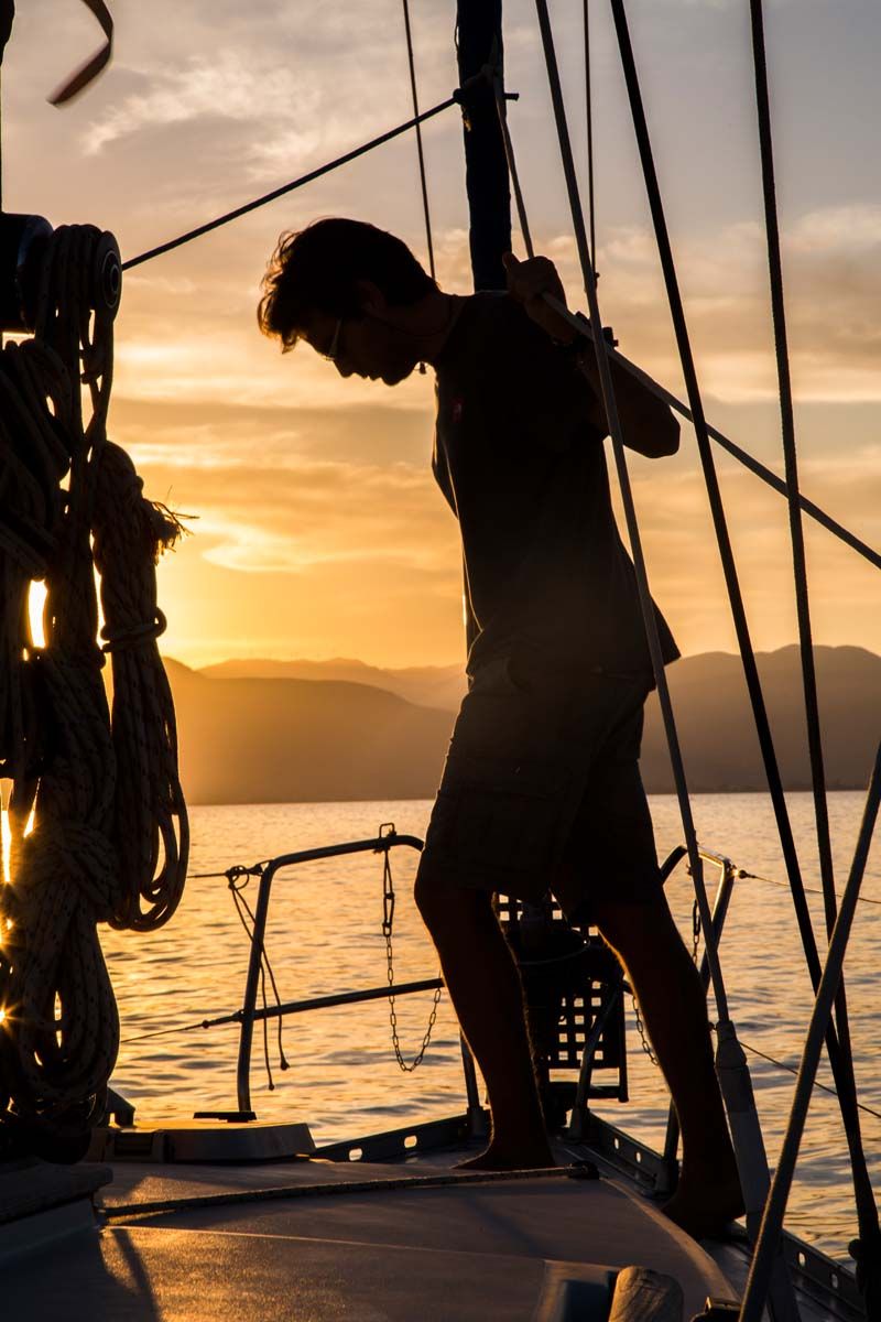 Ο Μανώλης μας εξηγεί ότι η ιστιοπλοΐα αποτελεί έναν οικολογικό τρόπο μετακίνησης καθώς κινείσαι μόνο με τη δύναμη του αέρα στο πανί σου. Επιπλέον, το σκάφος, πέρα από μέσο μεταφοράς, είναι και το κατάλυμά σου, αφού εδώ μαγειρεύεις, κοιμάσαι και ζεις. «Είναι μια ενασχόληση που χρειάζεται πολύ καλή προετοιμασία και προγραμματισμό,αλλά αν σεβαστείς κάποιες αρχές, είσαι απόλυτα ασφαλής», θα μας πει. Ξεκαθαρίζει όμως: «δεν είναι για όλους. Θέλει ανθρώπους που αγαπούν το ταξίδι και δεν αγχώνονται για τον προορισμό. Θέλει σεβασμό και γνώση. Ανθρώπους ανοιχτούς στην περιπέτεια που αγαπούν τη θάλασσα και τη φύση!» Με πάνω από 20 χρόνια εμπειρίας στη θάλασσα και περισσότερα από 200 νησιά σε Αιγαίο και Ιόνιο στις... αποσκευές του, τον κοιτάζω με δέος, εντάξει και λίγο... ζήλια, ομολογώ! Ποιος δεν θα ήθελε να έχει επισκεφθεί τόσα νησιά; Το σκάφος του, καλοσυντηρημένο και προσεγμένο, μπορεί να φιλοξενήσει μέχρι και 12 άτομα. Ιδανική επιλογή και για μεγάλη παρέα. Ενώ μπορείς, αν έχεις το κέφι και τη διάθεση, στη βόλτα σου να διδαχθείς και κάποια βασικά πράγματα για την ιστιοπλοΐα εκτός του να κολυμπήσεις, να ψαρέψεις, ή απλά να ρεμβάσεις τη γραμμη του ορίζοντα και να αφεθείς στον παφλασμό των κυμάτων... Εμείς απόψε, αφήσαμε πίσω μας τον φάρο του Ναυπλίου και πλεύσαμε προς Τολό. Είδαμε από κοντά την Αρβανιτιά, μια από τις πιο δημοφιλείς παραλίες της πόλης, μεταξύ του βράχου του Παλαμηδίου και της Ακροναυπλίας που είναι προσβάσιμη και με τα πόδια. Περάσαμε τον όρμο, πίσω από τον βράχο του Παλαμηδίου και συνεχίσαμε για Καραθώνα, τη μεγάλη αμμουδερή παραλία του Ναυπλίου, με τα δέντρα και τα πεντακάθαρα νερά. Στον μυχό του κόλπου, ανάμεσα στα βράχια είδαμε τον Άγιο Νικόλα, τον Κρασόκτιστο, όπως μας επισήμανε ο Μανώλης. Την εκκλησιά, σύμφωνα με την παράδοση, την έχτισε ένας καπετάνιος με κρασί, αντί για νερό, ώστε να εκπληρώσει το τάμα που είχε κάνει στον άγιο που τον έσωσε. Μια νύχτα, βλέπεις, με σφοδρή κακοκαιρία και θαλασσοταραχή, προσπαθούσε να προσεγγίσει το λιμάνι του Ναυπλίου και σ' αυτά εδώ τα βράχια, λίγο έλειψε να χάσει το καράβι του μαζί με το πλήρωμα και το εμπόρευμα...