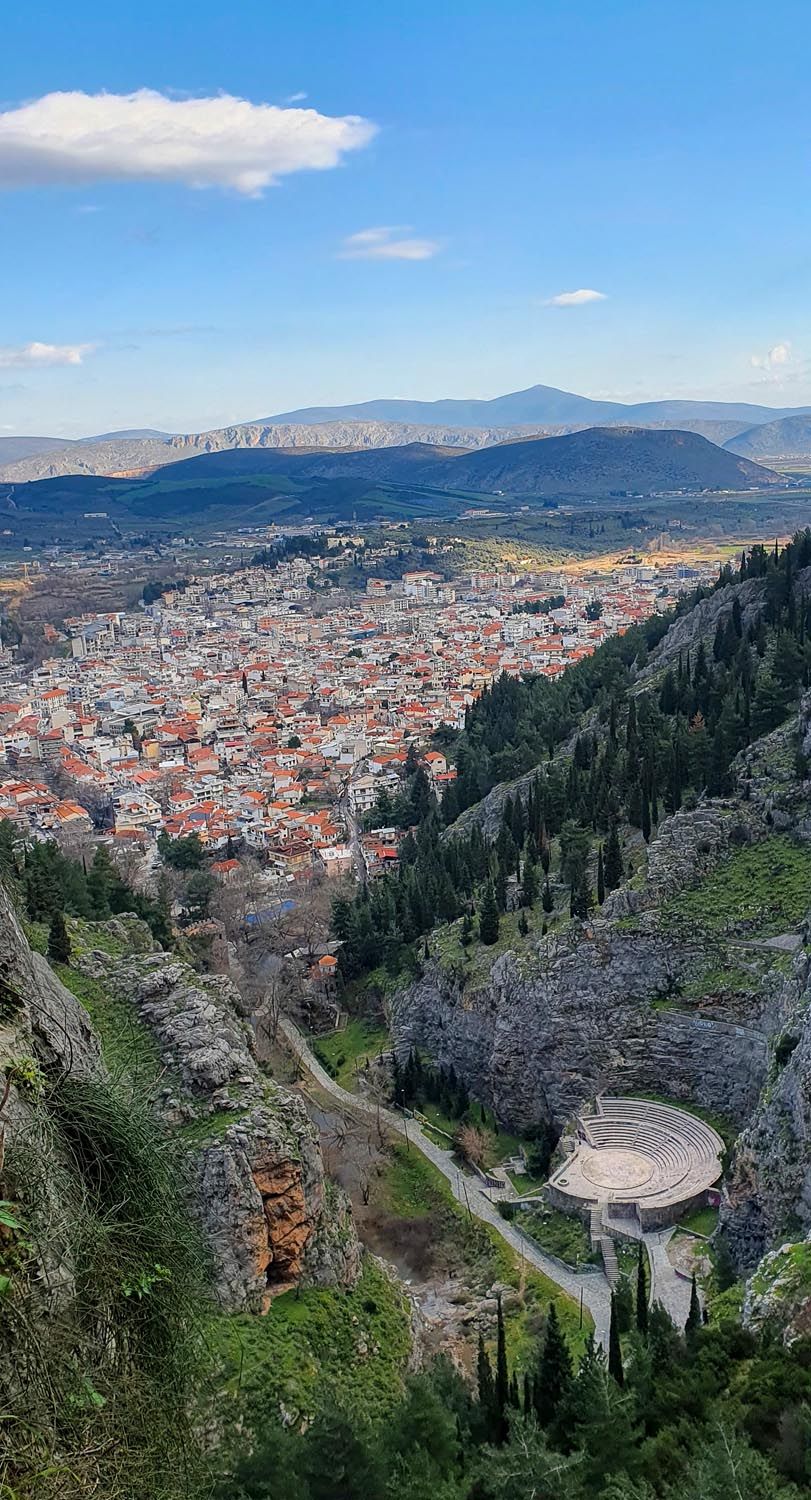 Το ανοικτό πέτρινο θέατρο, η Έρκυνα και στο βάθος η Λιβαδειά.