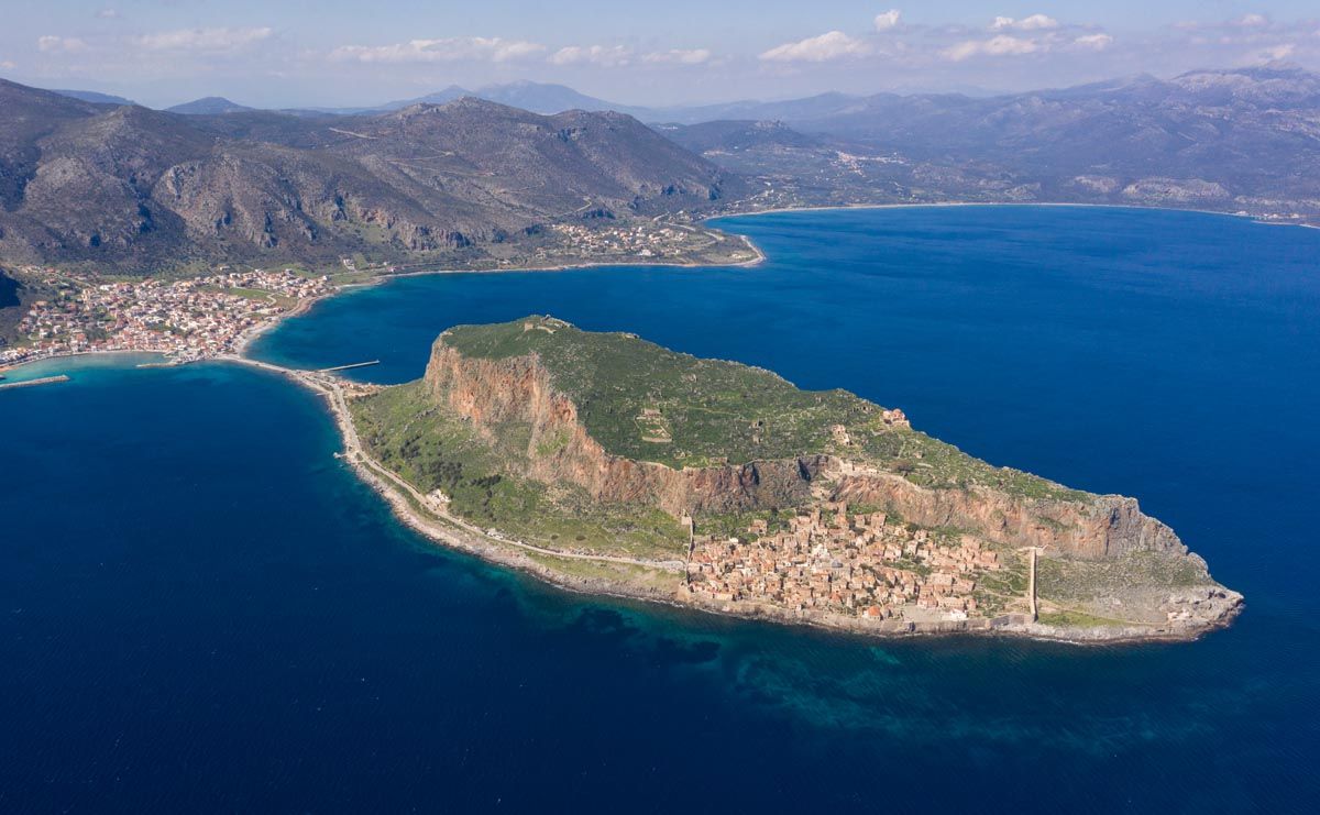 Ένας ισχυρός σεισμός, που έγινε το 375 μ.Χ., τη διαμόρφωσε χωρίζοντάς την από τη στεριά, μετατρέποντάς την σε νησί. Για πρώτη φορά, ο βράχος κατοικήθηκε τον 6ο αιώνα μ.Χ. από τους Σπαρτιάτες που ήρθαν εδώ προκειμένου να έχουν πρόσβαση στη θάλασσα και να είναι επιπλέον προστατευμένοι από τις επιδρομές. Ο απόρθητος βράχος αποτελούσε φυσικό οχυρό και είχε μόνο μια είσοδο-μπασιά. Έτσι πήρε τ’ όνομά της η πολύβουη πολιτεία που γνώρισε μεγάλη άνθηση ανά τους αιώνες, καθώς ήταν πάντα ευνοημένη από τους ηγεμόνες της και έχαιρε προνομίων. Η κυριαρχία της άλλαξε αρκετές φορές· Βυζαντινοί, Φράγκοι, Ενετοί και Τούρκοι πέρασαν από δω, μέχρι μετά την επανάσταση που επέστρεψε στην Ελλάδα κι έμελλε να γίνει ένας από τους πλέον διάσημους ταξιδιωτικούς προορισμούς της.