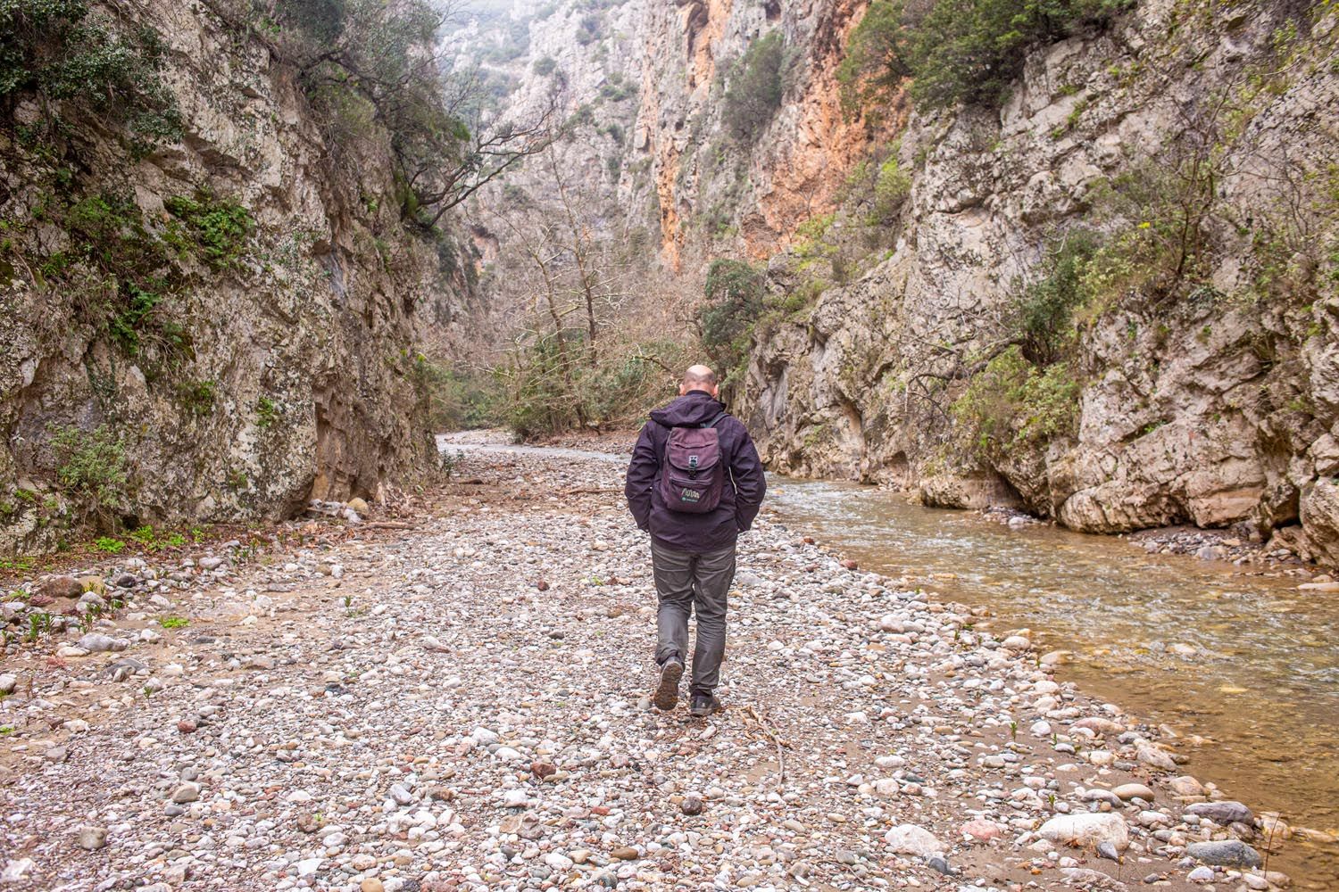 Κατεβήκαμε λίγο πιο κάτω από τον σταθμό για να βρούμε την κοίτη του ποταμού. Όπως τα περισσότερα φαράγγια η διάσχισή του ενδείκνυται τους καλοκαιρινούς και φθινοπωρινούς μήνες, ευτυχώς για μας όμως, η στάθμη του ποταμού είναι ευτυχώς χαμηλή και μας επιτρέπει σε ορισμένα σημεία να τον διασχίσουμε αναγκαστικά από μέσα. Ένα δεύτερο ζευγάρι παπούτσια είναι αναγκαίο αν επιλέξετε αυτόν τον δρόμο! Φτάσαμε στην αφετηρία μετά από περίπου δυόμιση ακόμα ώρες χαλαρό περπάτημα. Εναλλακτικά, μπορεί κανείς να επιστρέψει στην αφετηρία ακολουθώντας το ίδιο μονοπάτι προς τα πίσω.