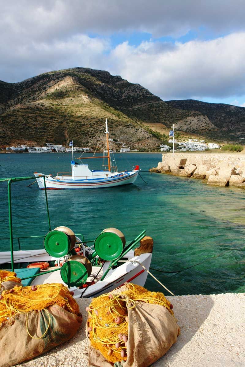 Το πρώτο μου ραντεβού με τη Σίφνο κλείστηκε στις Καμάρες, στο γραφικό λιμάνι του νησιού. Στην παραλία του οι ψαράδες ετοιμάζουν τα δίχτυα για την επόμενη ψαριά… Στον δρόμο δίπλα στη θάλασσα υπάρχουν πολλά μαγαζάκια με κεραμικά, ταβέρνες και ουζερί. Η ματιά μου περιεργάζεται τους γυμνούς λόφους που ορθώνονται γύρω από το λιμάνι. Στην κορυφή τους δειλά ξεχωρίζει κι από ένα κατάλευκο ξωκλήσι: ο Άγιος Συμεών στον ένα και ο Αϊ-Λιάς στον άλλο. Ακόμη, όμως, δεν έχω δει τίποτα. Το διαφορετικό που αναζητώ βρίσκεται αλλού… στο εσωτερικό του νησιού. Με το αυτοκίνητο, λοιπόν, ανηφορίζω προς την Απολλωνία, την πρωτεύουσα του νησιού. Εδώ ψηλά αντικρίζεις πράγματι ένα μοναδικό θέαμα: ένα οροπέδιο με ελιές, ανθισμένα θαμνόδεντρα και αγριολούλουδα, κι ανάμεσά τους γραφικά χωριά, πλεγμένα ερωτικά μεταξύ τους. Η Απολλωνία ξεδιπλώνει την κατάλευκη κορμοστασιά της στην καρδιά του νησιού κι εντυπωσιάζει με την παραδοσιακή αρχιτεκτονική της και τα στενά σοκάκια της. Λέγεται πως πήρε το όνομά της από τον θεό Απόλλωνα, που λατρευόταν εδώ. Γεμάτη μαγαζιά, ταβέρνες και ζαχαροπλαστεία με σιφνέικα αμυγδαλωτά, μέσα στα γραφικά δρομάκια της, σφύζει από ζωντάνια κάθε στιγμή της ημέρας. Στην κεντρική πλατεία της, στην Πλατεία Ηρώων, βρίσκεται και το Μουσείο Λαογραφίας και Λαϊκής Τέχνης. Για φαγητό, το βραδάκι, με υπέροχες γεύσεις και ατμόσφαιρα, μια καλή πρόταση είναι το «Ελιά & κάππαρη» και ο «Ραμπαγάς». Στη συνέχεια της Απολλωνίας βρίσκεται ο Αρτεμώνας, ένα χωριό με κατάλευκα σπίτια και καλοδιατηρημένα αρχοντικά. Μια βόλτα με τα πόδια στις γειτονιές του είναι ό,τι καλύτερο για το απόγευμα… Στην πλατεία του υπάρχουν καλές ταβέρνες με σιφνέικες γεύσεις, όπως το «Λιοτρίβι» και η «Μαργαρίτα».
