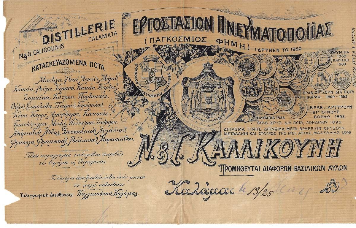 Η πρώτη ποτοποιία της χώρας ιδρύεται από τον Γεώργιο Καλλικούνη στην Καλαμάτα. Με σπουδές Φυσικών Επιστημών στη Τεργέστη, ο Γεώργιος Καλλικούνης επιστρέφει στη γενέτειρά του και ιδρύει το 1850, ένα ατμοκίνητο «Πνευματοποιείο», στις παρυφές του λόφου, όπου βρίσκεται το μεσαιωνικό κάστρο της πόλης. Στα τέλη του 19ου αιώνα, το ούζο θα προστεθεί στον μεγάλο αριθμό των αποσταγμάτων που παράγει η επιχείρηση. Μπαίνοντας στις νέες εγκαταστάσεις, σε υποδέχεται η μαρμάρινη προτομή του Νικολάου Καλλικούνη, γιού του ιδρυτή της επιχείρησης, ανάμεσα σε παλιές φωτογραφίες, αφιερώματα εφημερίδων, μετάλλια και διπλώματα. Ο Νίκος Καλλικούνης έχοντας σπουδάσει χημικός- οινολόγος στη Γαλλία, στράφηκε γρήγορα στη διεθνή αγορά, με συνεχείς εξορμήσεις σε εκθέσεις της Ευρώπης και της Αμερικής. Η δραστηριότητά του αυτή στέφθηκε με εμπορική επιτυχία, η οποία αποδεικνύεται από τα 46 χρυσά μετάλλια και τιμητικά διπλώματα που κοσμούν σήμερα τον χώρο του εκθετηρίου.