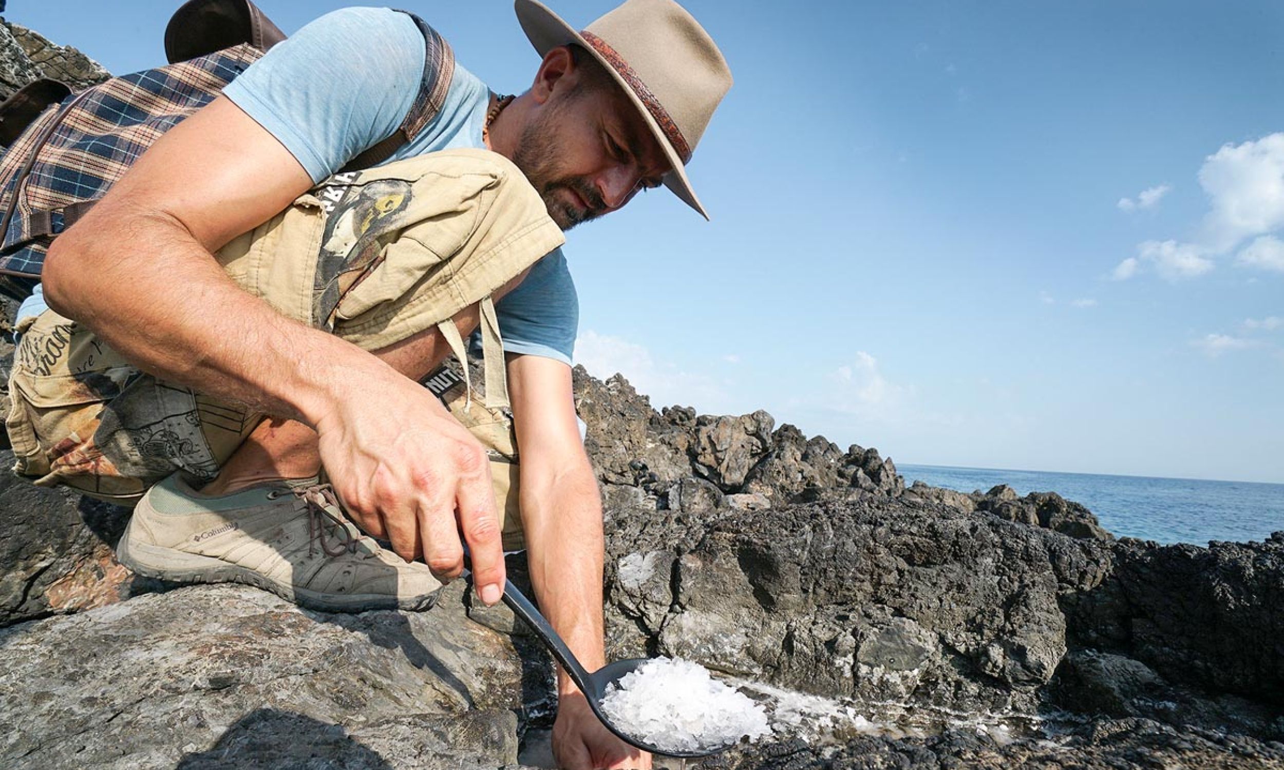 «Στα Κύθηρα η συλλογή του αλατιού από τα βράχια γίνεται οργανωμένα, μέσω διαδικασίας που χρωστάμε στην Ιόνιο Πολιτεία. Έτσι το δικαίωμα συλλογής αλατιού δίνεται μέσω πλειοδοτικού διαγωνισμού. Εμείς συλλέγουμε αλάτι, κυρίως από τις βόρειες περιοχές του νησιού και την Αγία Πελαγία», συνεχίζει ο Χάρης. Από τα τέλη της άνοιξης και ανάλογα με τις καιρικές συνθήκες ο δυνατός ήλιος εξατμίζει το νέρο που έχει παγιδευτέι στις κοιλότητες των βράχων. Από εκεί θα συγκεντρωθεί το ανώτερο του στρώμα, ο ανθός του αλατιού.