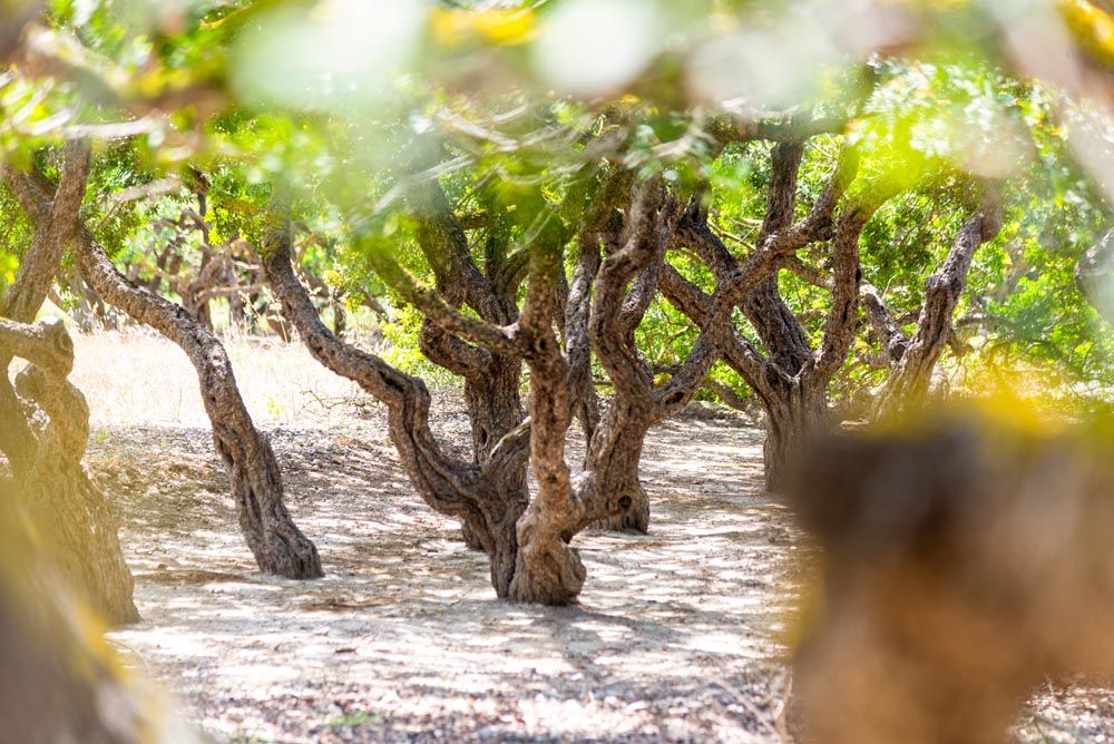 Σαν γιγάντια μπονζάι φαντάζουν τα δεντράκια, έτσι όμορφα και φροντισμένα στη σειρά, με τους στριφογυριστούς κορμούς τους σφιχταγκαλιασμένους. Νεαροί σχίνοι και βλαστοί από όπου θα φυτευτούν τα καινούρια φυτά κι άλλοι γηραιότεροι, πιο άγριοι, με τις πυκνές φυλλωσιές τους να κρύβουν τον ήλιο. Πολύτιμη η σκιά τους για τους Μαστιχοπαραγωγούς που ξεκινούν αχάραγα από τον Δεκαπενταύγουστο και μέχρι μετά τα μέσα Σεπτεμβρίου για τη συλλογή της Μαστίχας, αφού «άμα δει ο ήλιος το μαστίχι πάει χαμένο. Γίνεται μέλι κι είναι άχρηστο, δεν το παίρνει ούτε ο Συνεταιρισμός ούτε κανείς…» Αρχές του Ιούνη κι ακόμη δεν έχουν στρωθεί τα τραπέζια με το χαρακτηριστικό ασπρόχωμα που θα υποδεθχεί τα δάκρυα του φυτού, αφού προηγουμένως τα χωράφια έχουν οργωθεί κι έχουν καθαριστεί επιμελώς. «Τώρα το μοιράζει η Ένωση», θα μου πουν οι παραγωγοί. Αχάραγα θα ξεκινήσουν όπου να ‘ναι για το κέντος, που γίνεται με φειδώ ώστε «να μην τραυματιστεί το δέντρο». Κούκουδο-κούκουδο τη μαζεύουν έπειτα από το χώμα, την ξύνουν με στοργή από το δέντρο κι αν κάνει πως βρέχει, τα πάντα καταστρέφονται… «Θέλουν αφοσίωση οι σχίνοι», μου εξομολογείται ο Γιάννης. Από Ιούλη μέχρι Οκτώβρη-Νοέμβρη. Ο χειμώνας έχει τα κλαδέματα, στο κέντος περνάς έξι με εφτά φορές το κάθε δέντρο ανά τη βδομάδα. Τα γνωρίζεις ένα-ένα τα δέντρα σου, αναπτύσσεις προσωπική σχέση μαζί τους και κάθε ένα σε γνωρίζει πέντε γενιές πίσω…»