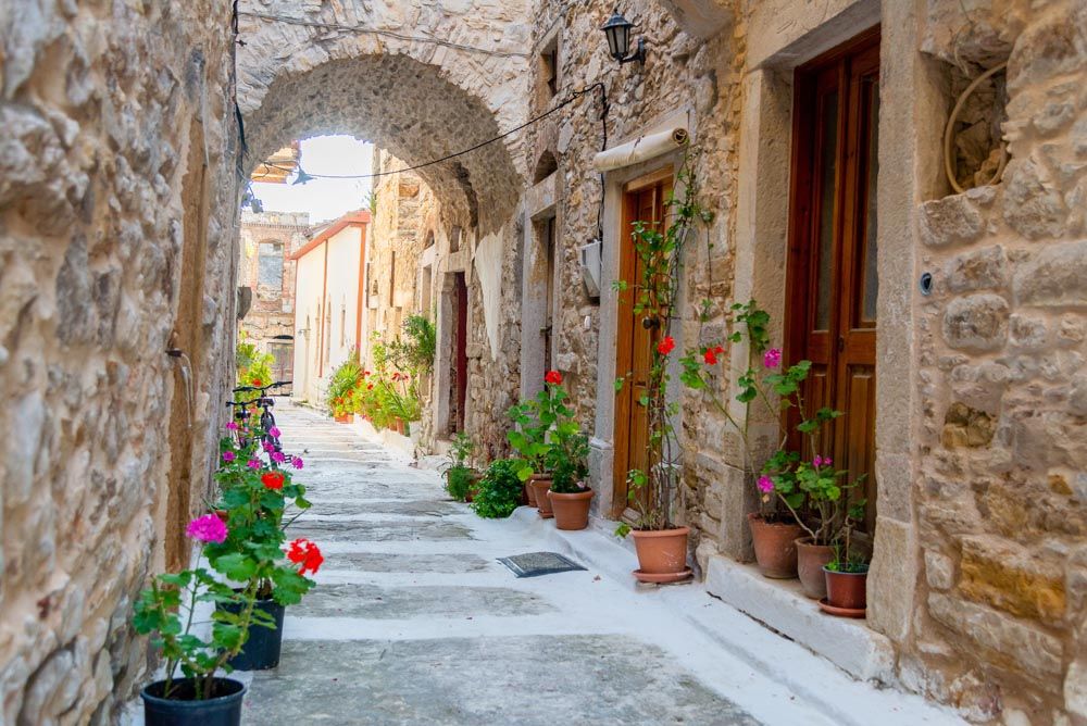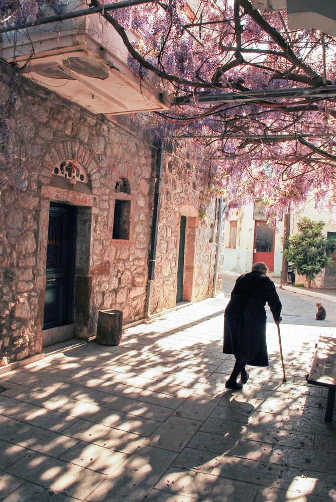 Κατά το λιόγερμα θα βρεθώ στην Καλαμωτή, εκεί που οι άνθρωποι σε βάζουν ακόμη μες στα σπίτια τους, σε κερνούν μια πορτοκαλάδα «Κάμπος» στο μικρό γυάλινο μπουκάλι. Αναζητώ τον Μεσαιωνικό οικισμό με τα γεράνια μες τα θολωτά στενά. «μαστιχάκια» τα λένε στη Χίο. Ερημώσαμε, κόρη μου. Πάλι καλά που ‘χουν πάρει οι ξένοι κάποια σπίτια και έρχονται το καλοκαίρι και ζωντανεύει λίγο το χωριό», μου λεν στο καφενείο του Κωσταρή, στη μέσα πλατεία. Σκαρφαλωμένα σε μια βουνοκορφή, τα γραφικά Πατρικά λούζονται από τις τελευταίες ηλιαχτίδες… Έκλεισε κι εδώ το καφενείο. Μα όσο πιο άσημα ή μοναχικά τόσο πιο μαγικά – ένα προς ένα – τα χωριουδάκια του Νότου παραμένοντας ακόμη προστατευμένα από τα βλέμματα των σύγχρονων βαρβάρων… «Η πιο δύσκολη δουλειά είναι το καθάρισμα», μου ‘χε πει ο Γιάννης. Το μαζεύουν βρόμικο, ανάκατο με χώμα, πέτρες, φύλλα και κλαδάκια. Το απλώνουν στα σπίτια να στεριώσει κι έπειτα το «δρομονίζουν», το περνούν δηλαδή από το μεγάλο κόσκινο, ύστερα από το μεσαίο κι έπειτα από το ψιλό. Ανάλογα το μέγεθος πληρώνονται για Α, Β ή Γ ποιότητα… Η Ένωση παρέχει πια μηχανικά κόσκινα αλλά οι παλιοί εμπιστεύονται τον τρόπο που γνωρίζουν. Όταν δροσίσει ο καιρός, το βάζουν για μια νύχτα στο νερό μαζί με αλάτι ή ασπρόχωμα και αναδεύουν να ‘ρθει επάνω, με την άνωση, το μαστίχι. Στα χωριά κοντά στις παραλίες χρησιμοποιούν θαλασσινό νερό. Ύστερα το πλένουν, το σαπουνίζουν, το απλώνουν να στεγνώσει κι αρχίζουν με τη βελόνα να βγάζουν ό,τι σκουπιδάκι έχει απομείνει. Αυτή είναι παραδοσιακά δουλειά των γυναικών, οι λεγόμενες συντροφικές βεγγέρες που ξεκινούν το φθινόπωρο μέχρι την άνοιξη και τα στενά γεμίζουν απ’ τις χαμογελαστές γιαγιάδες με χαρακτηριστικά τσεμπέρια που με αστείρευτη υπομονή καθαρίζουν ένα-ένα το μαστίχι.