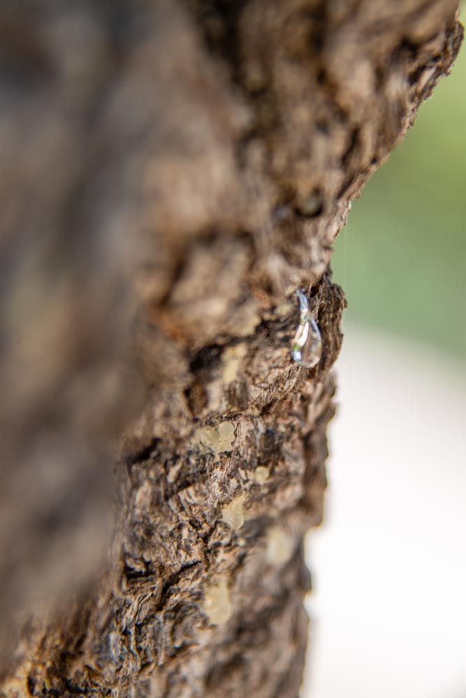 Όλο και κάποιο δάκρυ θα ‘χει μείνει πάνω στον κορμό – παίρνω και μασώ λίγη μαστίχα… Διαβάζω πως την εποχή των Ενετών η τιμωρία για την κλοπή 10 λιβρών ρετσινιού από μαστίχα ήταν το κόψιμο του αυτιού κι αν η κλοπή ξεπερνούσε τις 200 λίβρες, η ποινή ήταν ο θάνατος δια απαγχονισμού… Τόσο πολύτιμη ήταν η μαστίχα, ώστε αργότερα, την εποχή της Τουρκοκρατίας, έδωσε πλήθος από προνόμια και φοροαπαλλαγές στους Χιώτες που απολάμβαναν μέχρι τις σφαγές του ’22…
