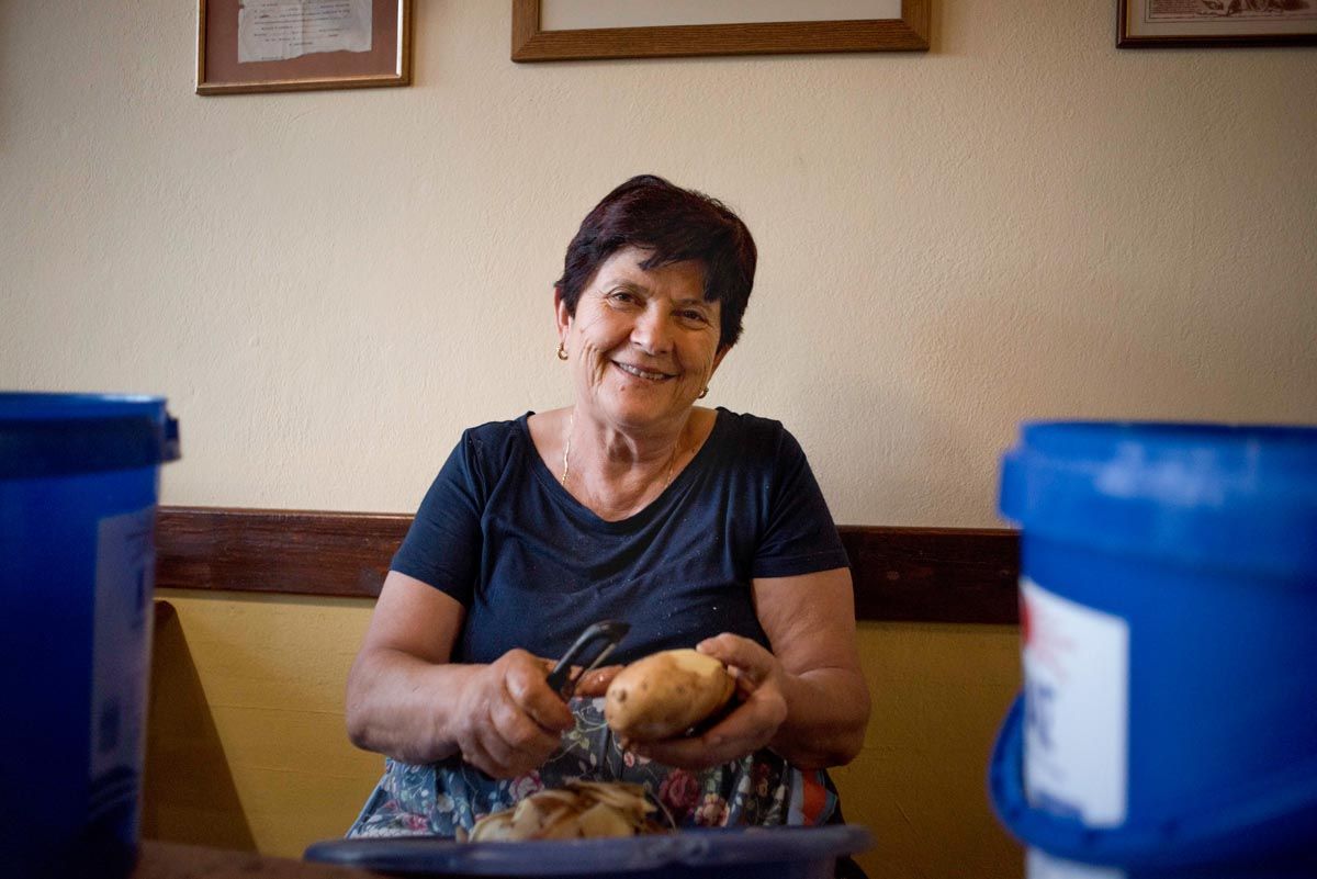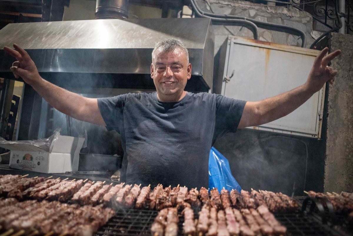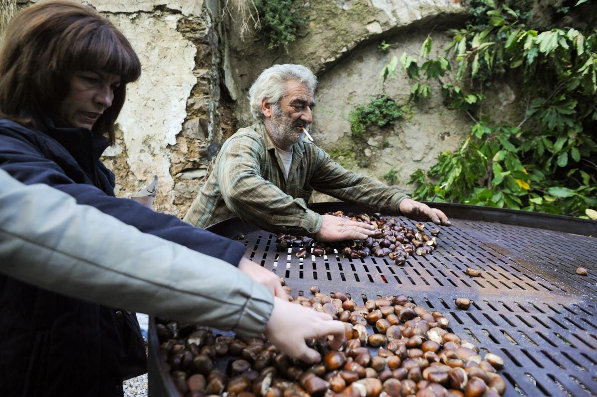 Στην είσοδο του χωριού, οι συντοπίτισσες μας υποδέχονται στην πελώρια ψησταριά, διαμέτρου δύο μέτρων, κερνώντας μας αχνιστά κάστανα. Τα βραστά βγαίνουν από το «χαρανί», δηλ. το καζάνι. Στον υπαίθριο άμβυκα αποστάζεται το τσιπουράκι. Οι ορειβάτες καταφθάνουν από την πεζοπορία τους και τσουγκρίζουν τα ποτήρια τους. Διασχίζουν το Ευρωπαϊκό Μονοπάτι Ε4 και διανυκτερεύουν εδώ προτού πάνε στην Παναγιά τη Γιάτρισσα, το μοναστήρι στην κορυφογραμμή του Ταΰγετου, τη Μηλιά και τη Καρδαμύλη της Μεσσηνιακής Μάνης. «Εννιακόσια κιλά κάστανα, ψητά και βραστά, κεράσαμε φέτος συν 350 κιλά τσίπουρο», μας λέει ο άξιος πρόεδρος. Σαν αερικό βρίσκεται παντού και βοηθά! «Από τον Ιούνιο ξεκινάμε τις προετοιμασίες».