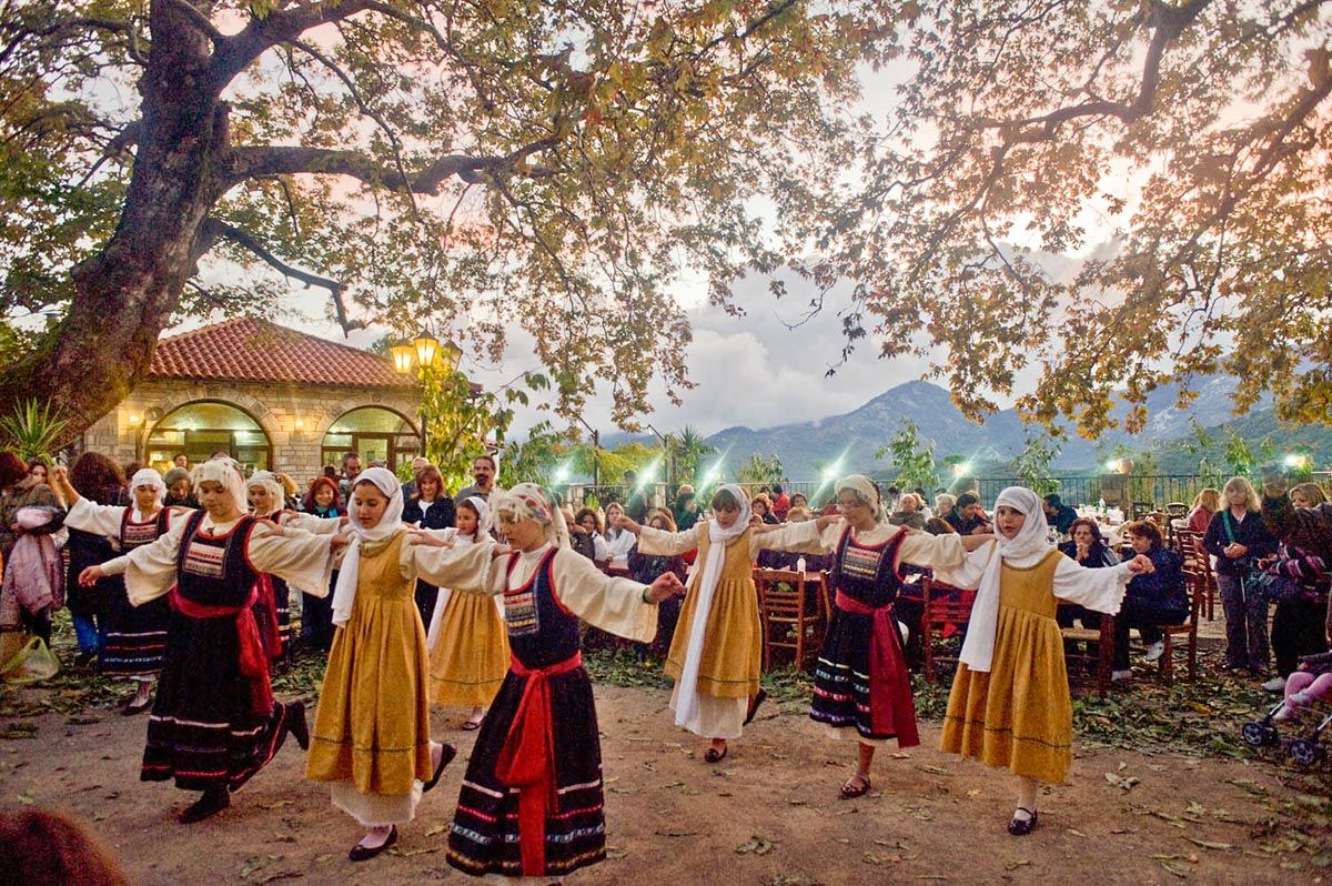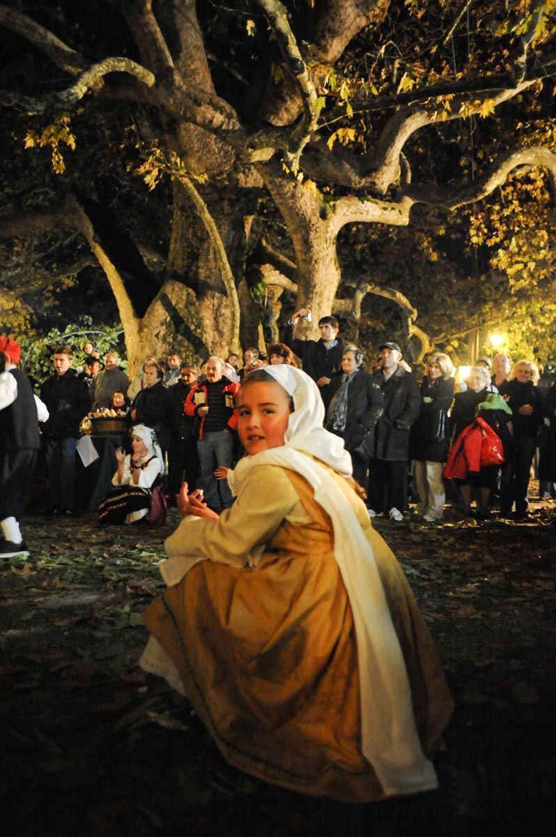 Χορεύτριες του Λυκείου Ελληνίδων Ραφήνας απογειώνουν Διονυσιακά το ξεφάντωμα. Νιώθουμε όλοι τη μαγική ουσία της γιορτής να απλώνεται στο βουνό καθώς το σούρουπο πέφτει. Μια εικόνα θεϊκή που μας «προσφέρεται» κάτω από τον «ήρωα» του χωριού, τον αγέρωχο πλάτανο. Το «ενεργειακό» αυτό, ολοζώντανο γλυπτό της φύσης, ανεβάζει τις δονήσεις, προσδίδει χαρά και έκσταση, καθώς στροβιλιζόμαστε στους Ικαριώτικους και Καλαματιανούς χορούς κάτω από τα απέραντα κλαδιά του. Οι μπάντες παίζουν ασταμάτητα – γινόμαστε ένα. Μοιάζει να κατέβηκε ο Ζορμπάς μες τον κορμό του και να μας χτυπά παλαμάκια φωνάζοντας με την ψυχή του «ώπα!». Τα κιτρινοκόκκινα φύλλα του ρίχνει απαλά σα χάδι. Δεκαεφτά άνθρωποι αγκαλιάζουμε τον μυθικό κορμό. Ο Μικρός Πρίγκηπας μοιάζει να ξαναγράφεται με τον πλάτανο της Άρνας πλάι στο αφρικανικό μπάομπαμπ!